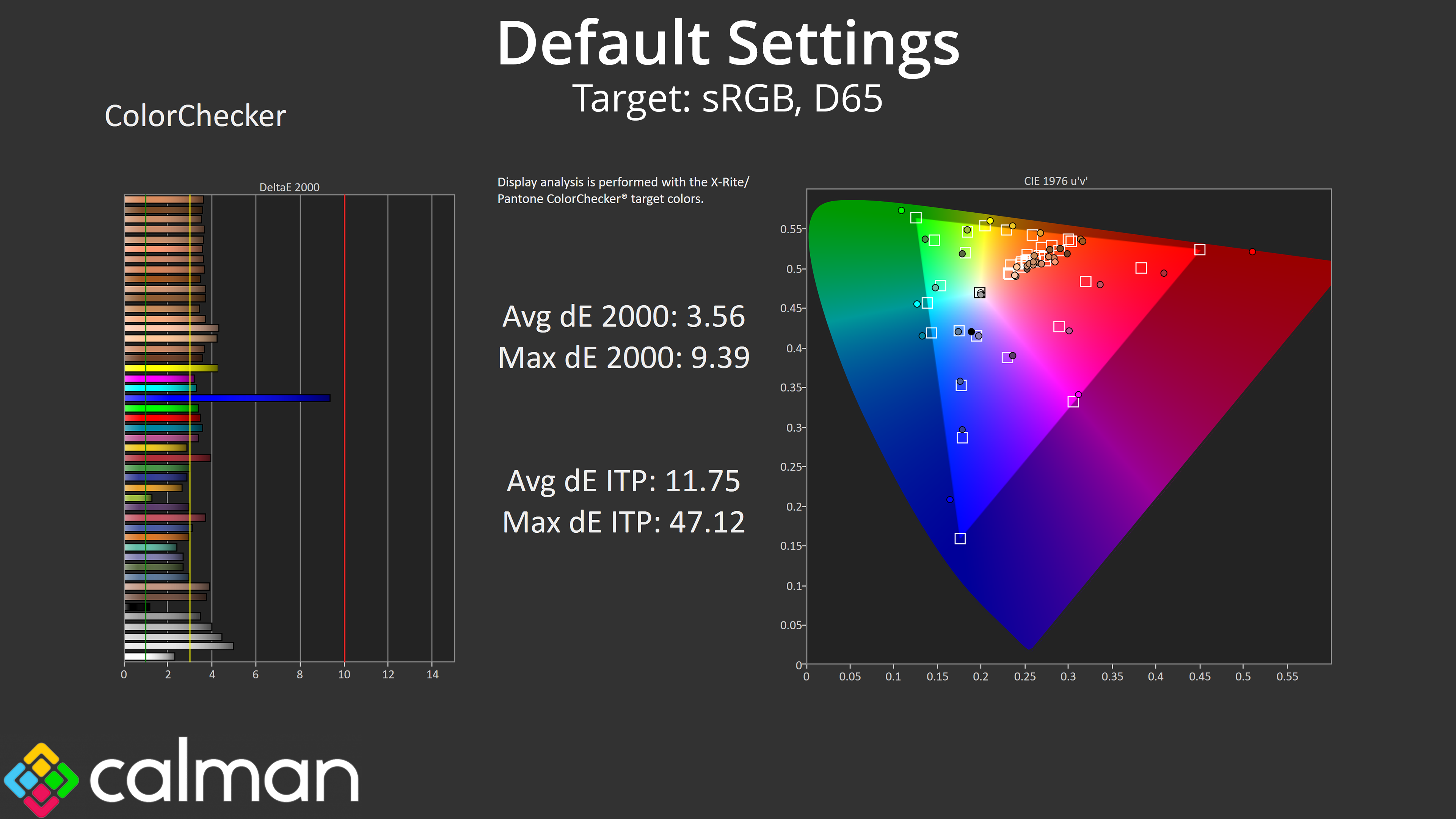 We first run these tests with the display in its out-of-the-box state, with all settings on default. If there is an sRGB emulation option or other useful mode then we may test that too. We then calibrate the screen using the Calman Ultimate software and run the tests again.