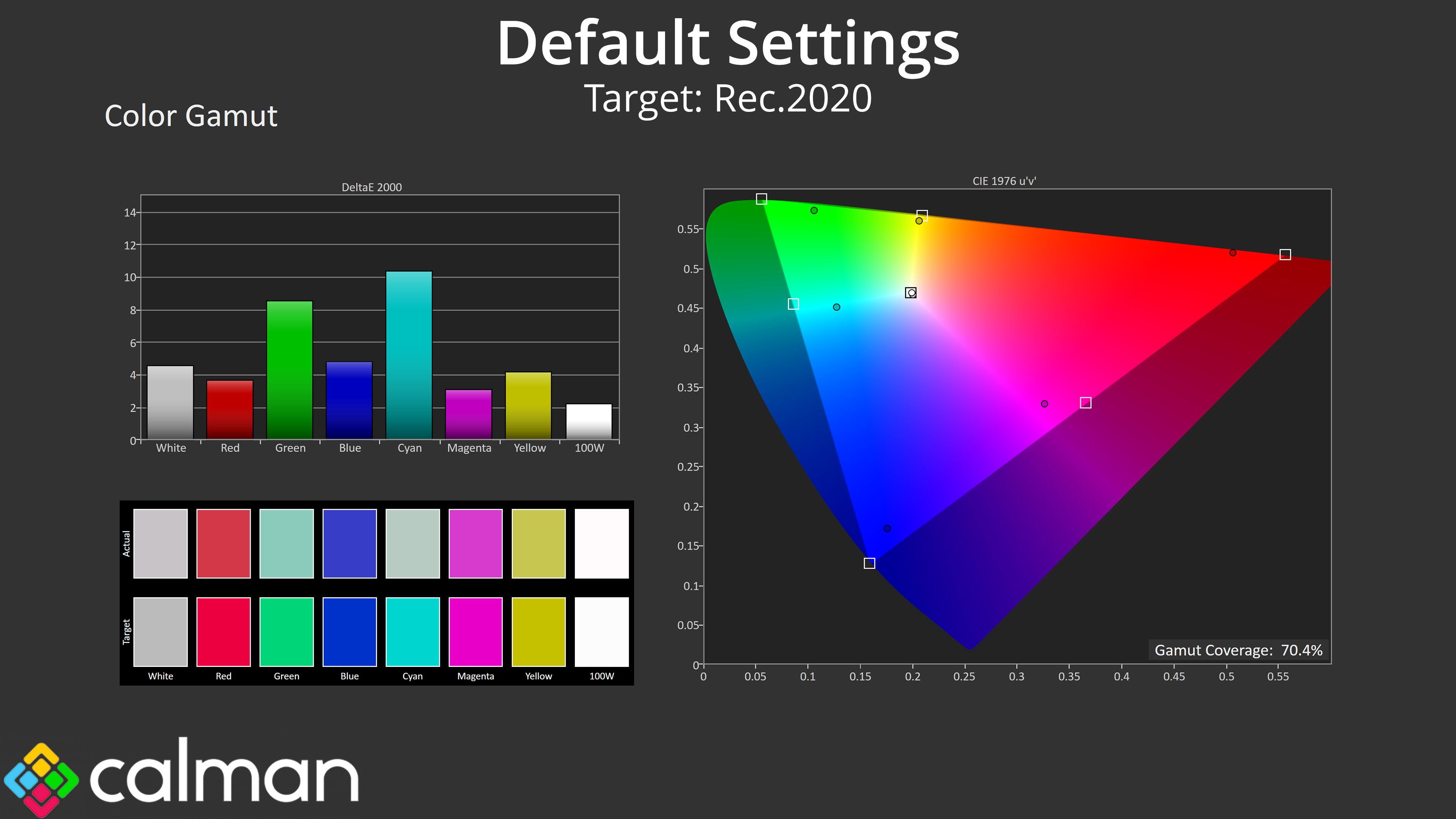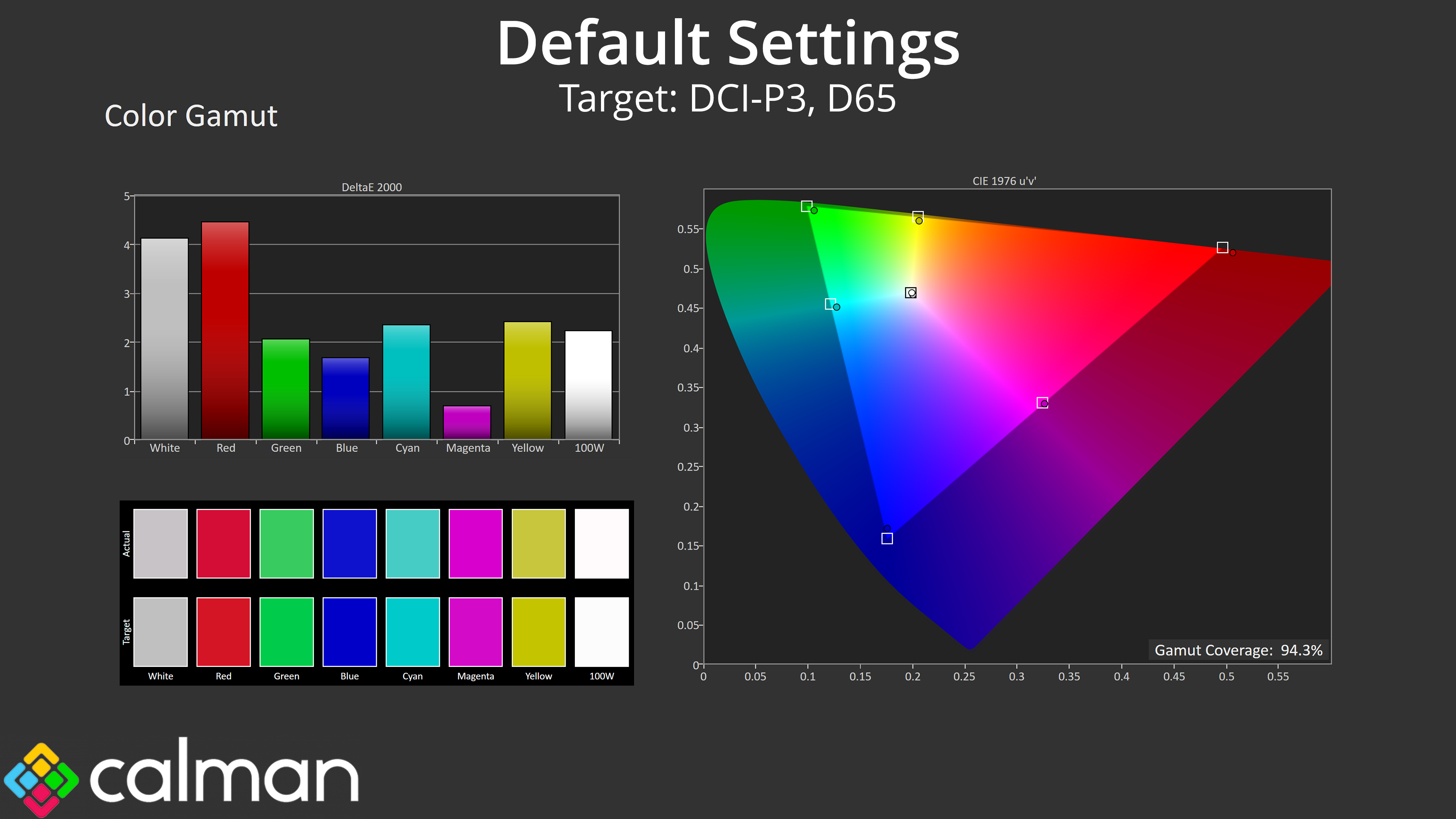 As for gamut, it does generally exceed the sRGB space, though it's clearly not as wide as other monitors we've tested recently, with DCI-P3 coverage hitting 94.3%, alongside 90.8% for Adobe RGB and 70.4% coverage of Rec.2020.