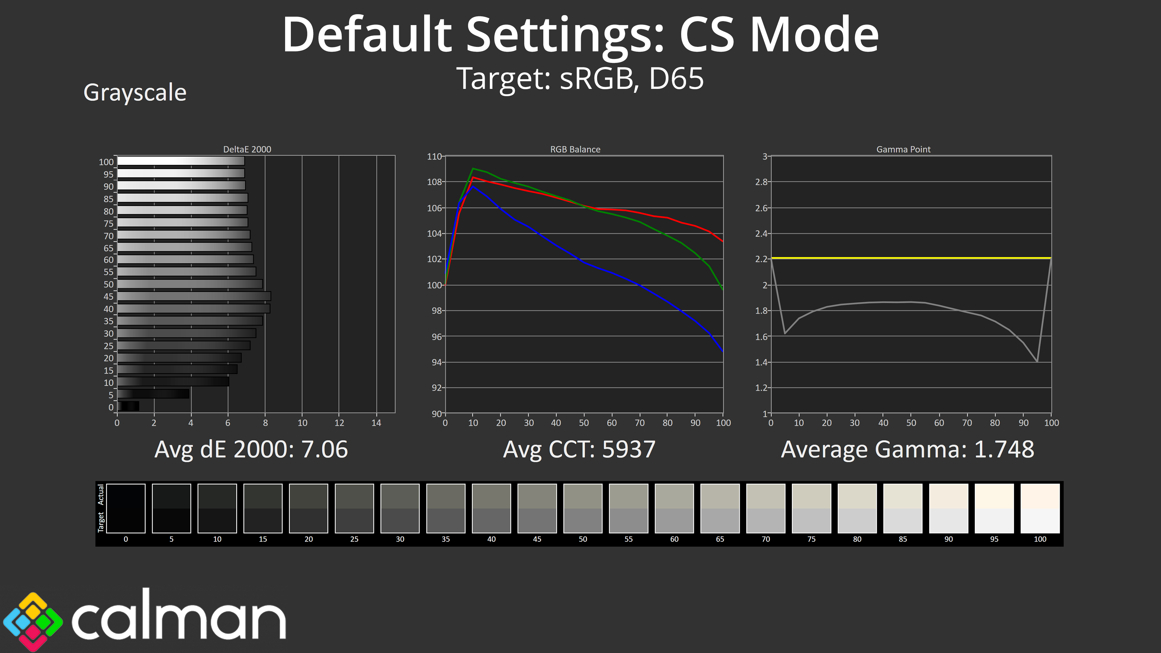 When it comes to greyscale, it's worth pointing out that, by default, the CS24A ships with the ‘CS' game mode enabled within the OSD, and this has a custom colour balance and shadow boost pre-applied, obviously meant for gaming in Counter-Strike. The consequence is that greyscale is not very accurate at all, with a colour balance below 6000K, which gamma averages 1.748.