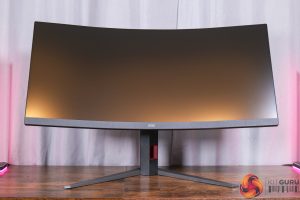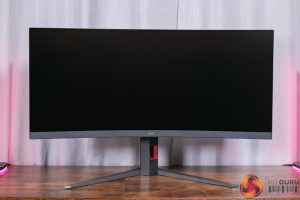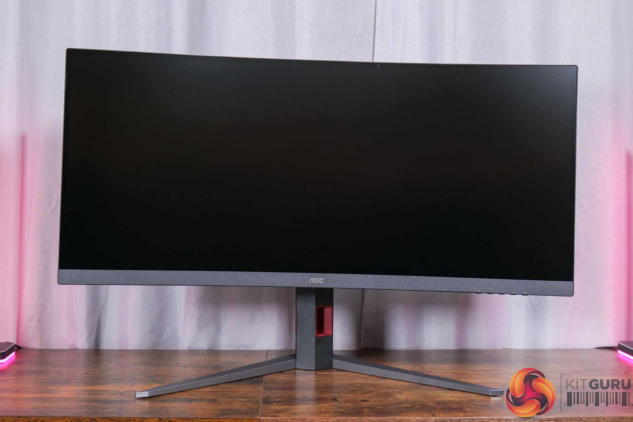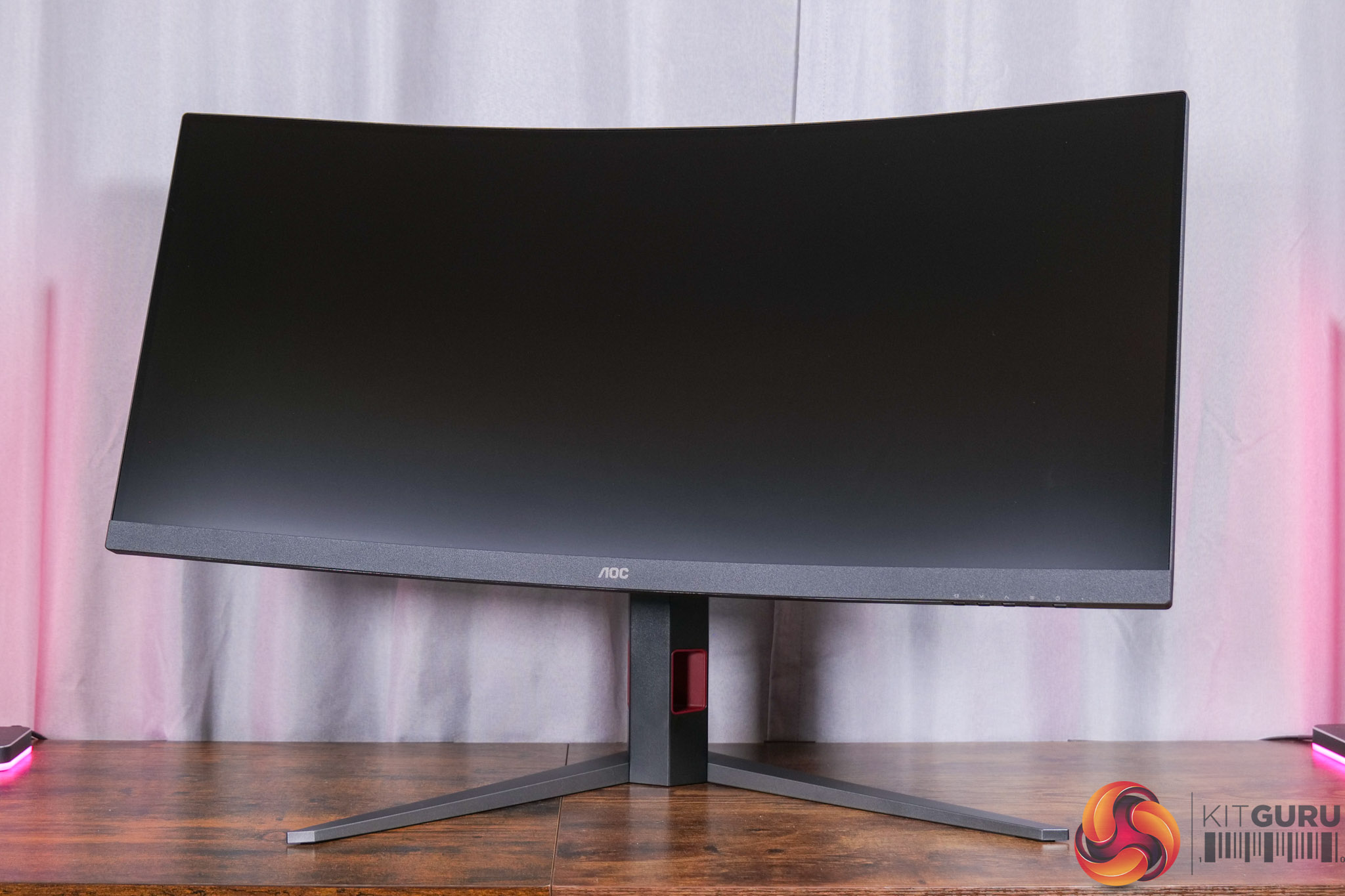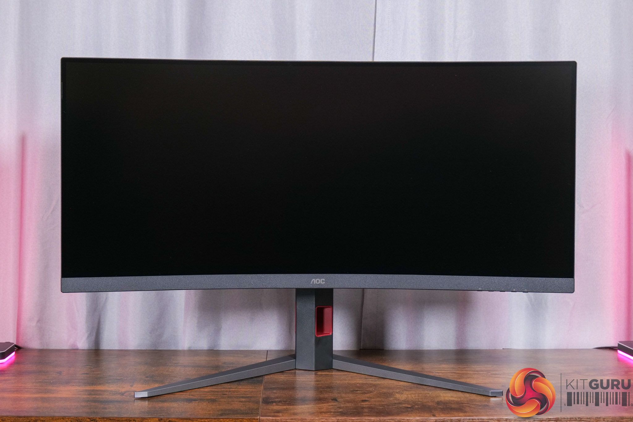 In terms of the design of the monitor, AOC’s G series all have a fairly similar aesthetic and the CU34G4Z is no different. It’s almost entirely matte black, with the angular rear giving it a slightly aggressive gamer aesthetic, but from the front it looks more laid-back. It’s sporting a grey v-shaped foot, and this measures 56cm wide, so it isn’t overly large as ultrawides go.