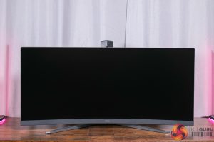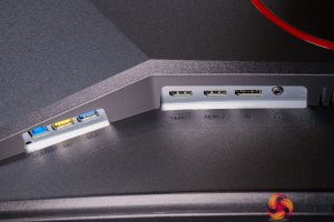 As for connectivity, we find a total of three video inputs – one DisplayPort 1.4, and then two HDMI 2.1, so there’s no issues getting the full refresh rate on any of those ports. Then there’s also a small two-port USB hub, but that’s it – so no USB-C or KVM functionality, which is a slight shame but it’s not really a surprise given the price point.