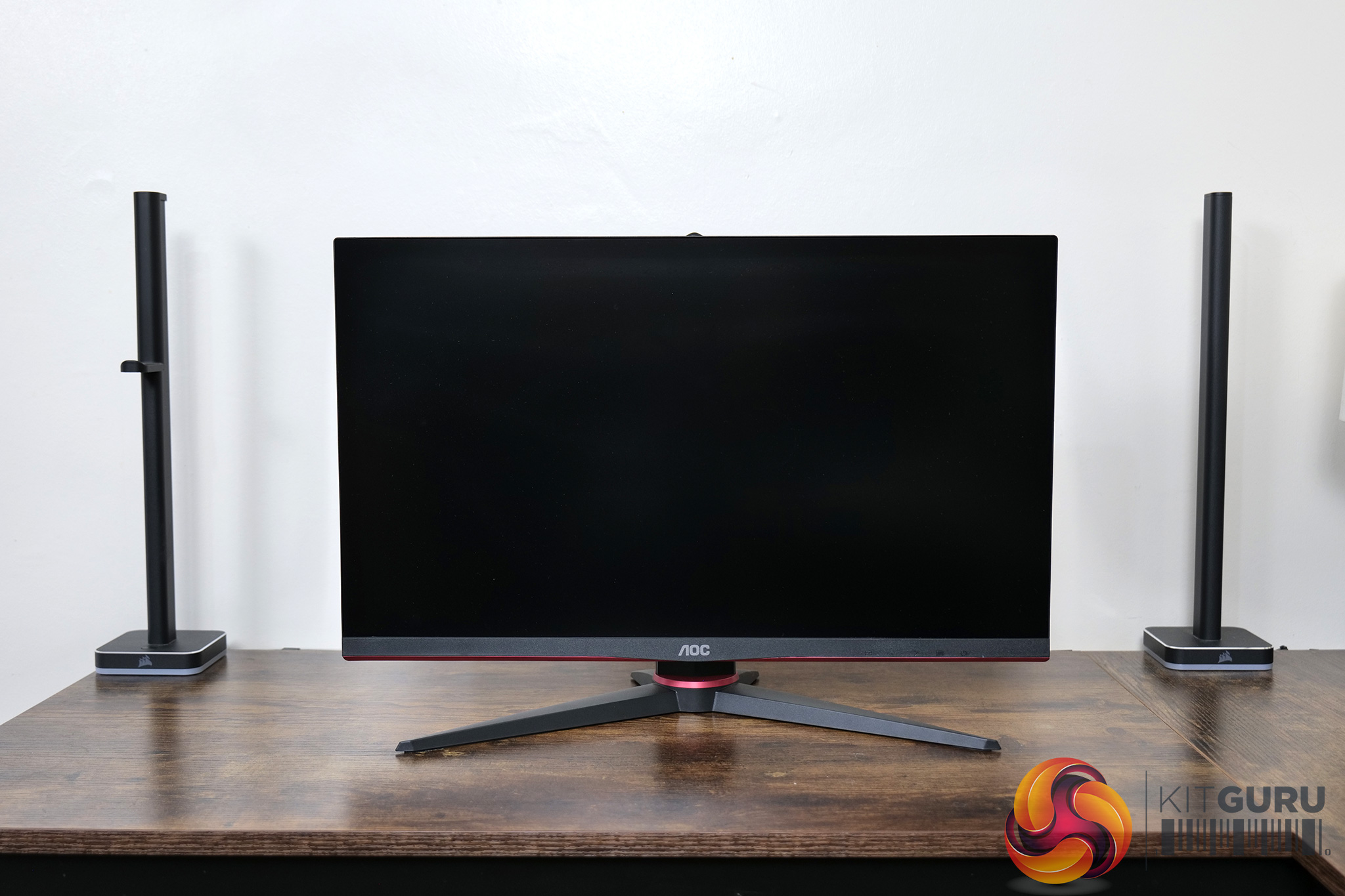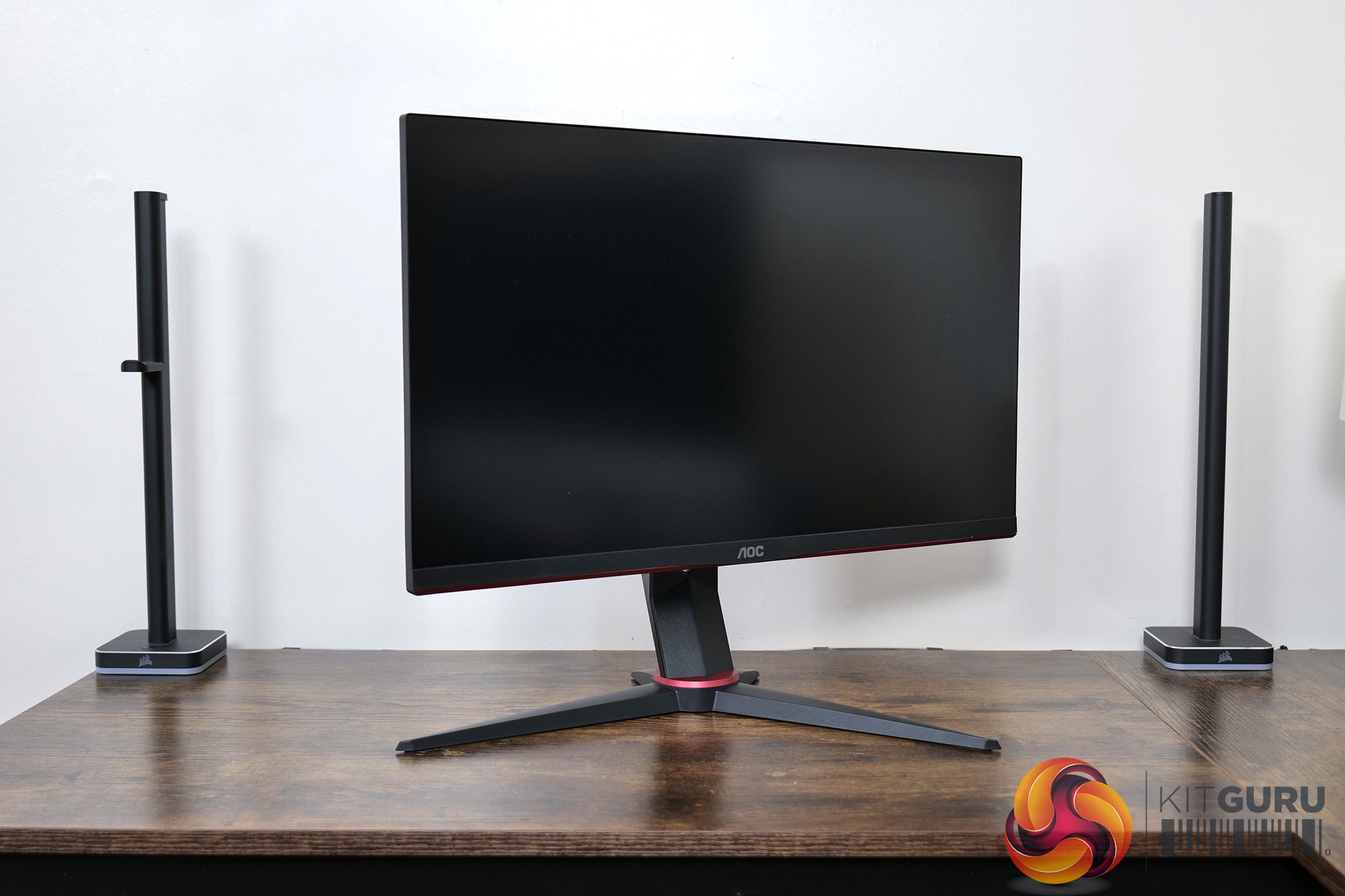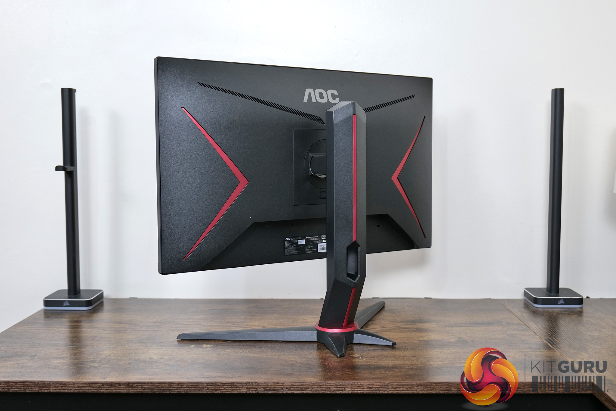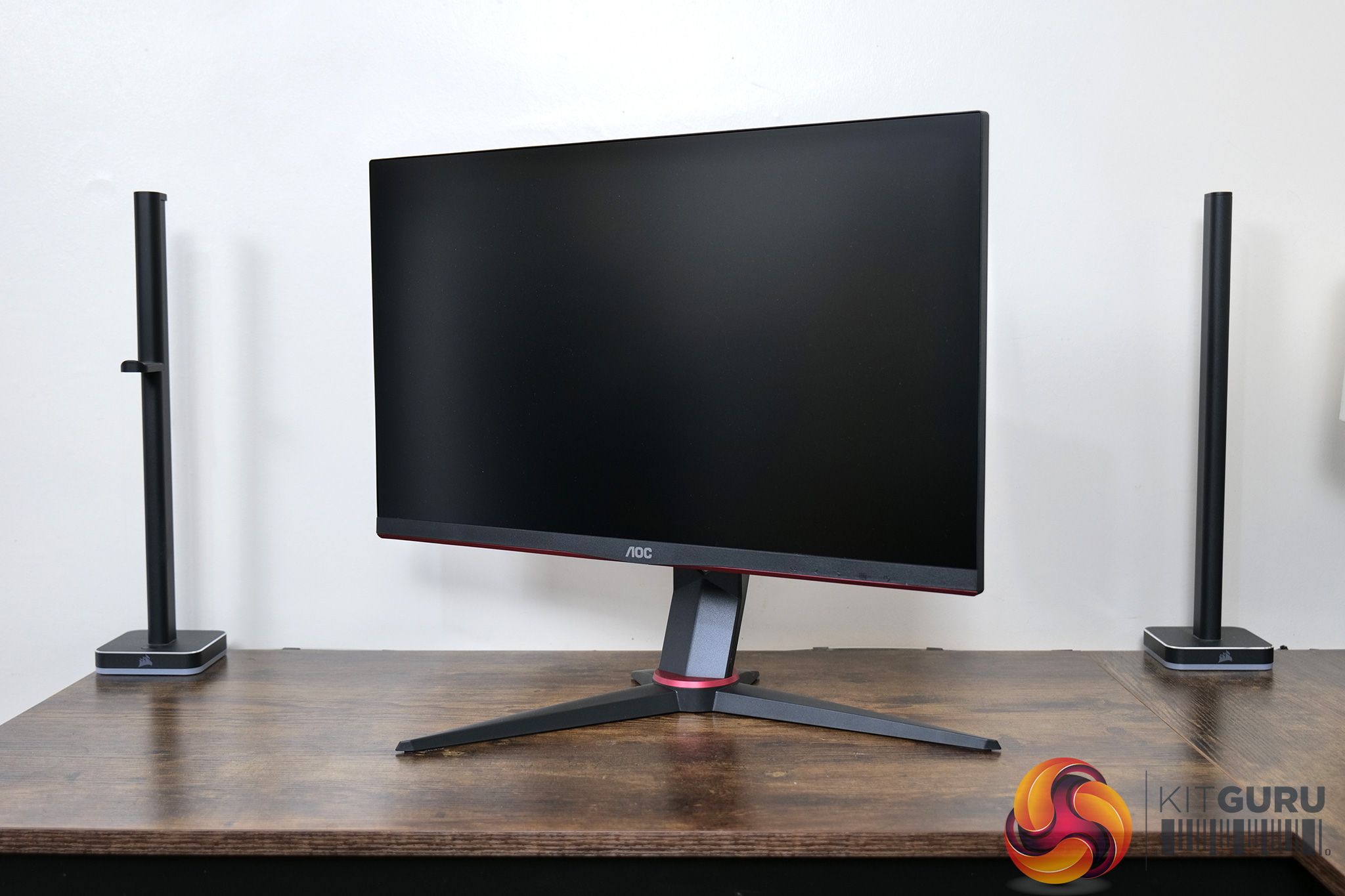 Starting with the design of the Q24G2A, it's nothing we haven't seen before from AOC. In fact, I think if you imagined an archetypal AOC monitor, it's probably something a lot like this. That means a mostly matte black aesthetic, but with visible red accents alongside a wide v-shaped stand. Most of the red is on the back of the screen, apart from one ring around the base of the stand and a thin strip of red underneath the chin of the front panel.