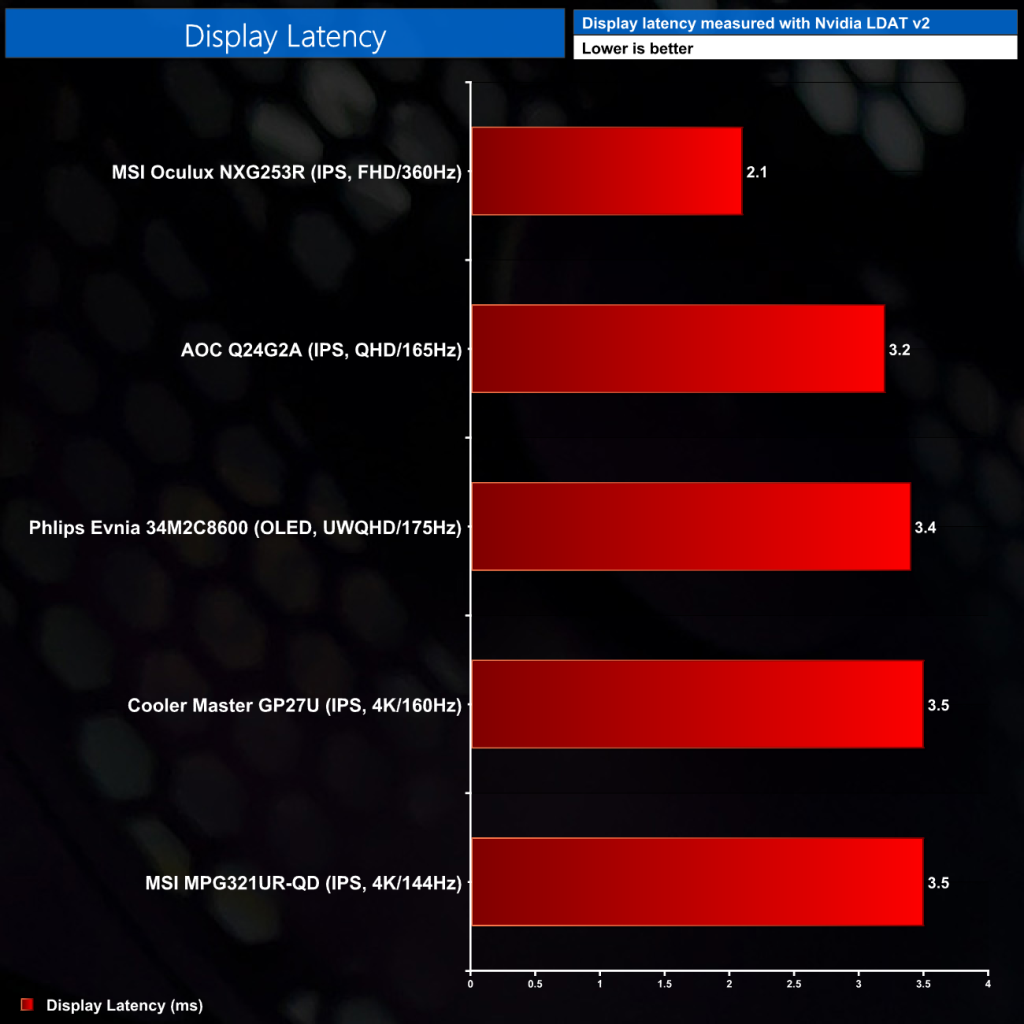 Display latency is another area of our testing, where we use Nvidia’s Latency and Display Analyzer Tool (LDAT V2) to measure display latency. Display latency is the signal processing delay of a display from when a frame starts scanning out on the GPU to when the screen responds. LDAT detects the first observable change (6% increase from the initial brightness).