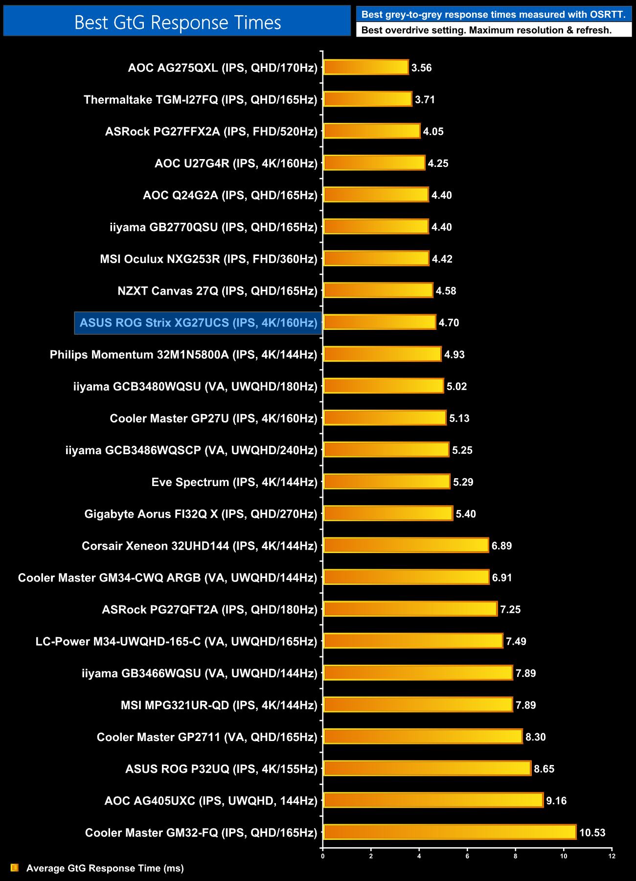 Comparing the best response times to the competition, we can see the XG27UCS is a decently-fast IPS monitor. It's not the absolute fastest we've ever tested, but it's up there in the top third of the chart.