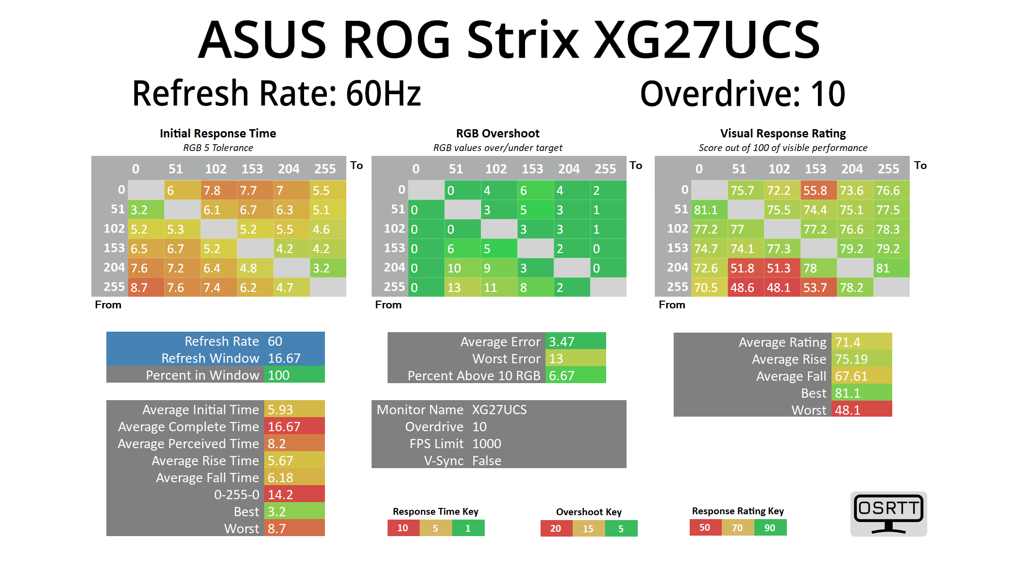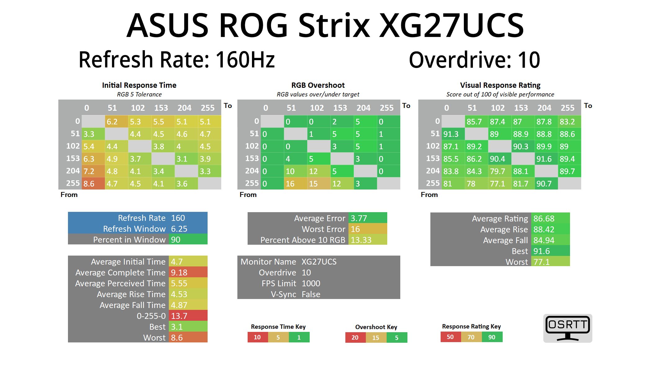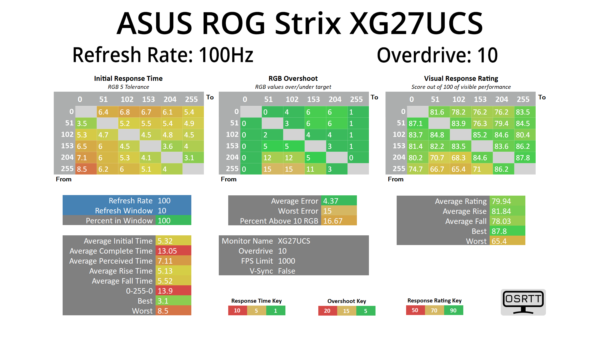 We use the Open Source Response Time Tool (OSRTT), developed by TechTeamGB, for our response time testing. This measures grey-to-grey response times and presents the results in a series of heatmaps, the style of which you may be familiar with from other reviews.