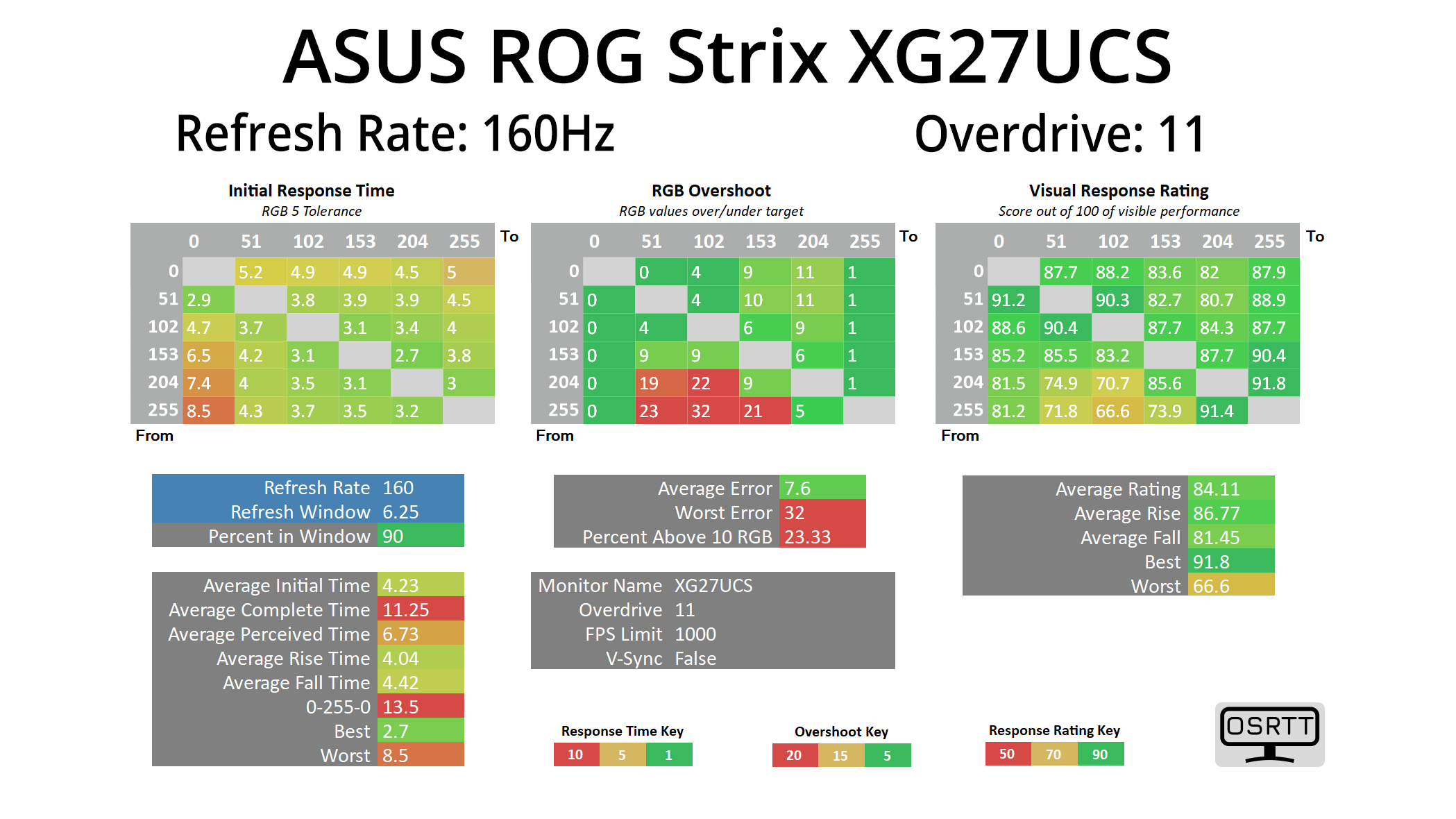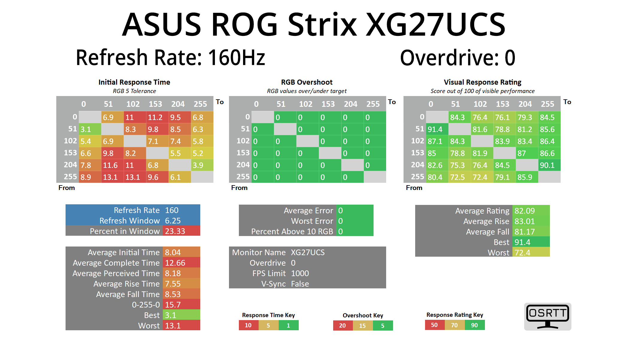 Visual Response Rating is a metric designed to ‘score' a panel's visual performance, incorporating both response times and overdrive. Fast response times with little to no overshoot will score well, while slow response times or those with significant overshoot will score poorly.