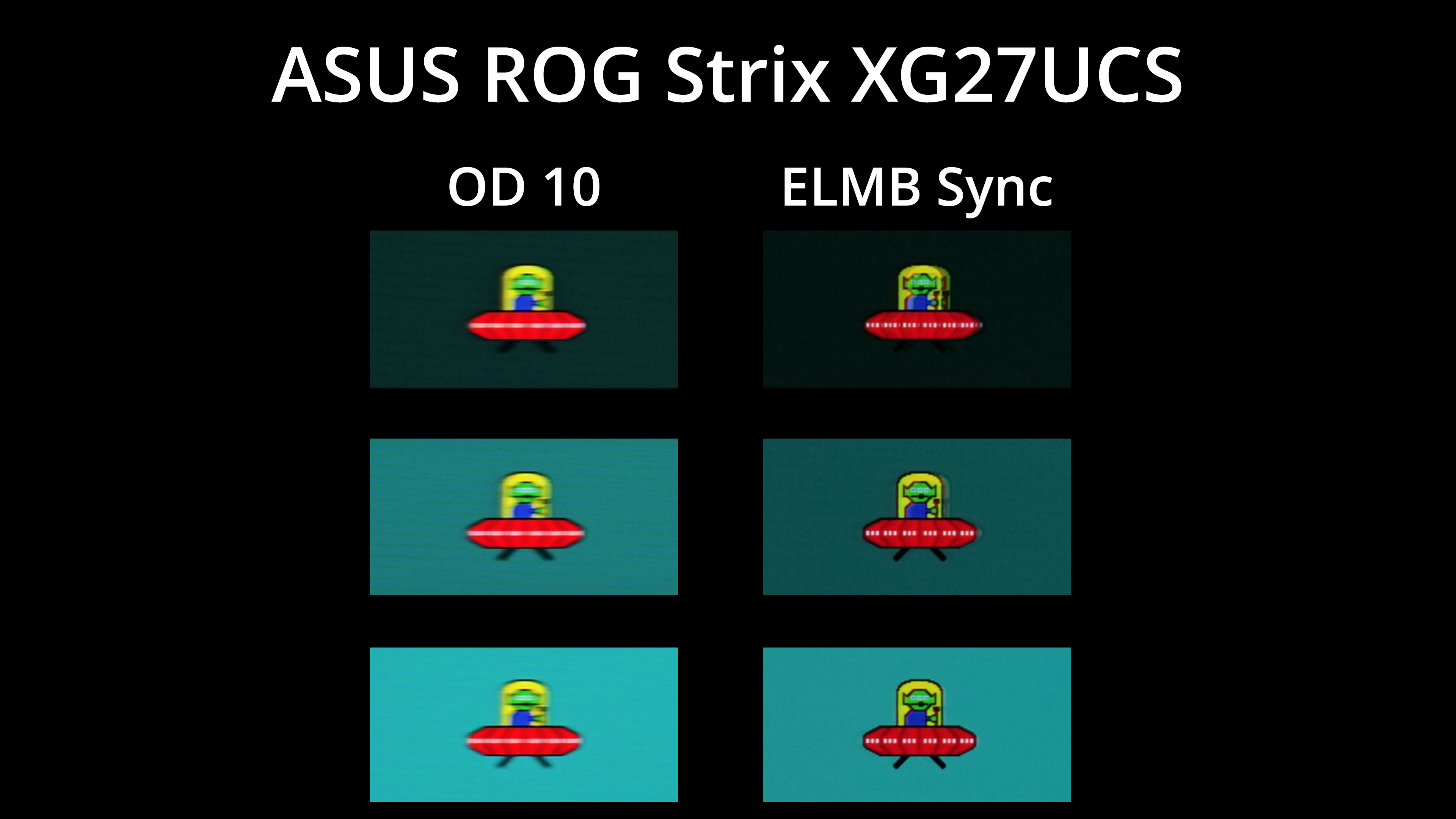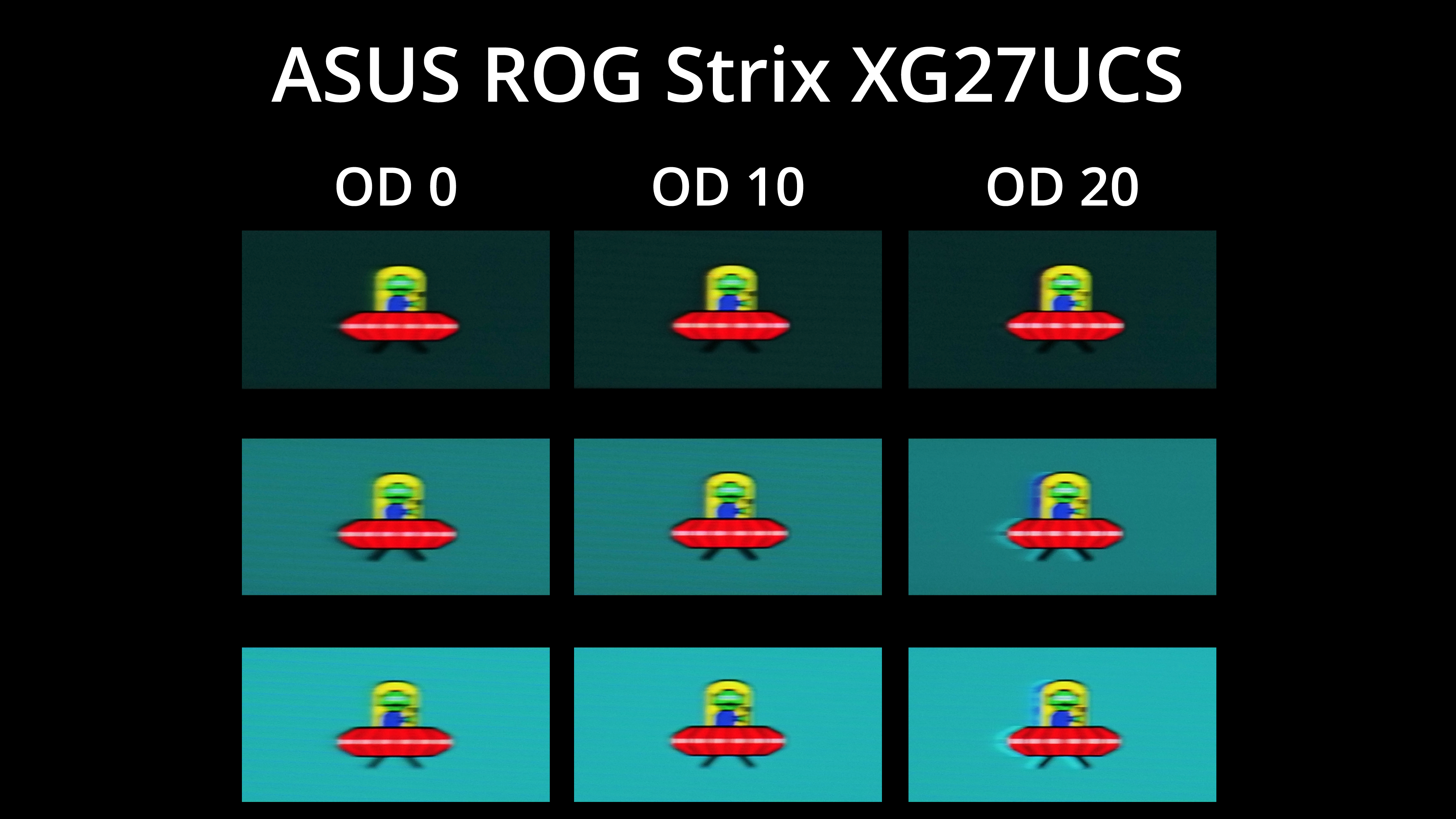 Here we can see a visual representation of the overdrive modes, using BlurBuster's UFO ghosting test. I personally think OD 10 strikes the best balance, cleaning up some ghosting compared to overdrive off, but without much – if any – visible overshoot.