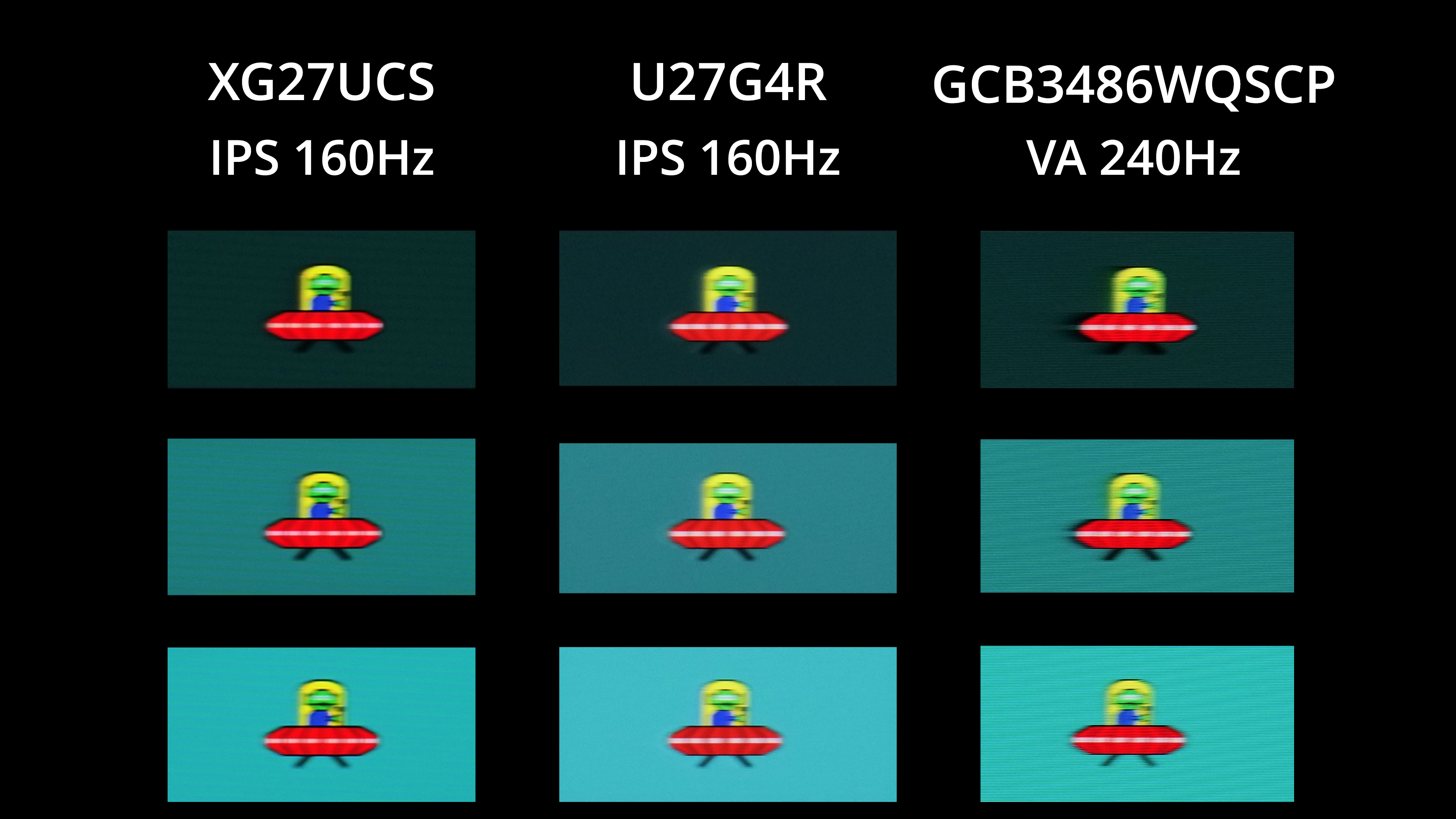 We've also compared the XG27UCS against the similarly-priced AOC U27G4R and the iiyama GCB3486WQSCP. The ASUS monitor comes out favourably – I wouldn't say there's a huge difference between the two IPS screens, but clarity is perhaps one step up for the ROG monitor. We can also see the lack of any black smearing which is a problem for cheaper VA panels.