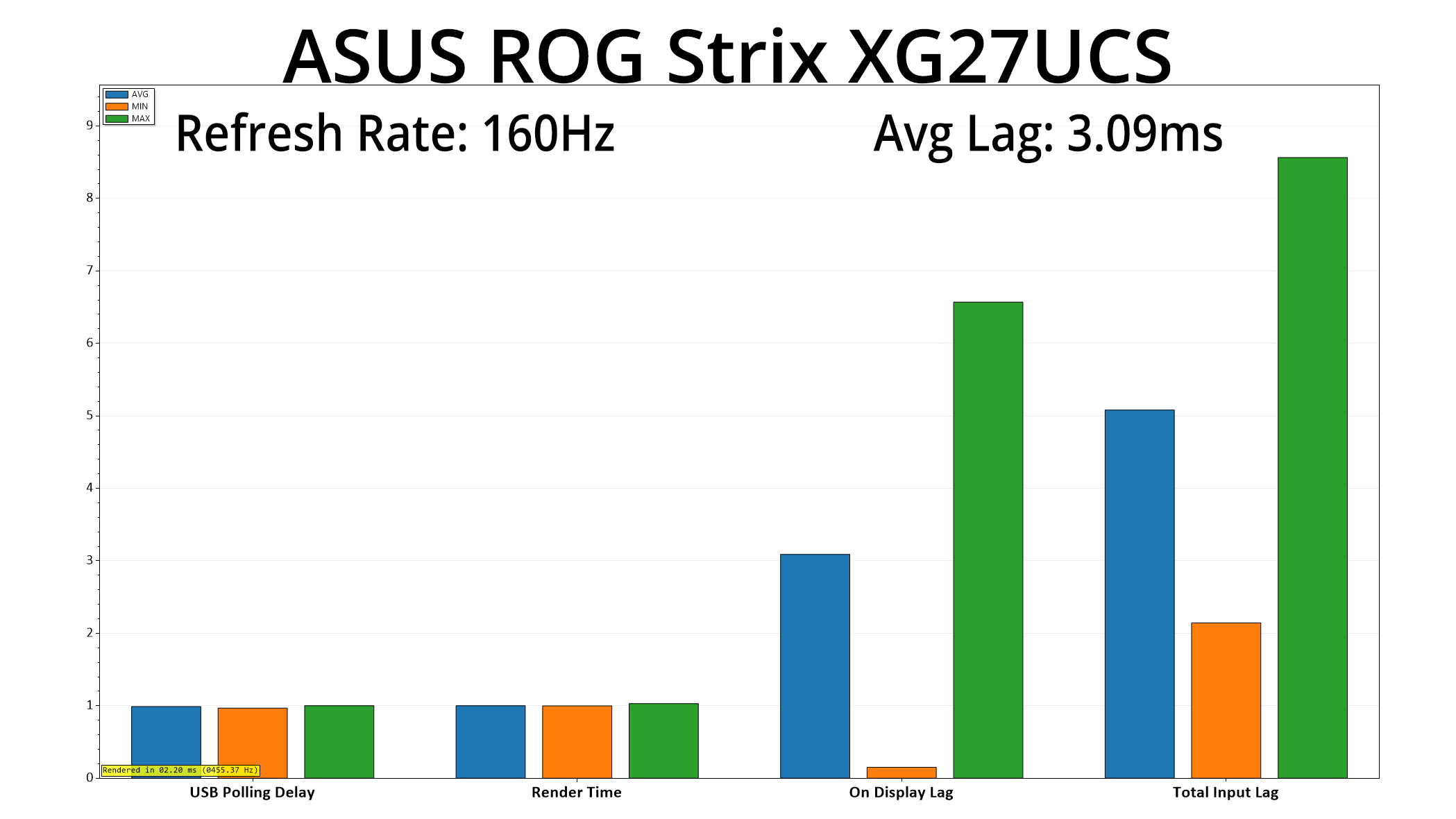 We have good news when looking at latency, too, given it averages 3.09ms at 160Hz, or just less than half a frame of lag – nothing at all to worry about.