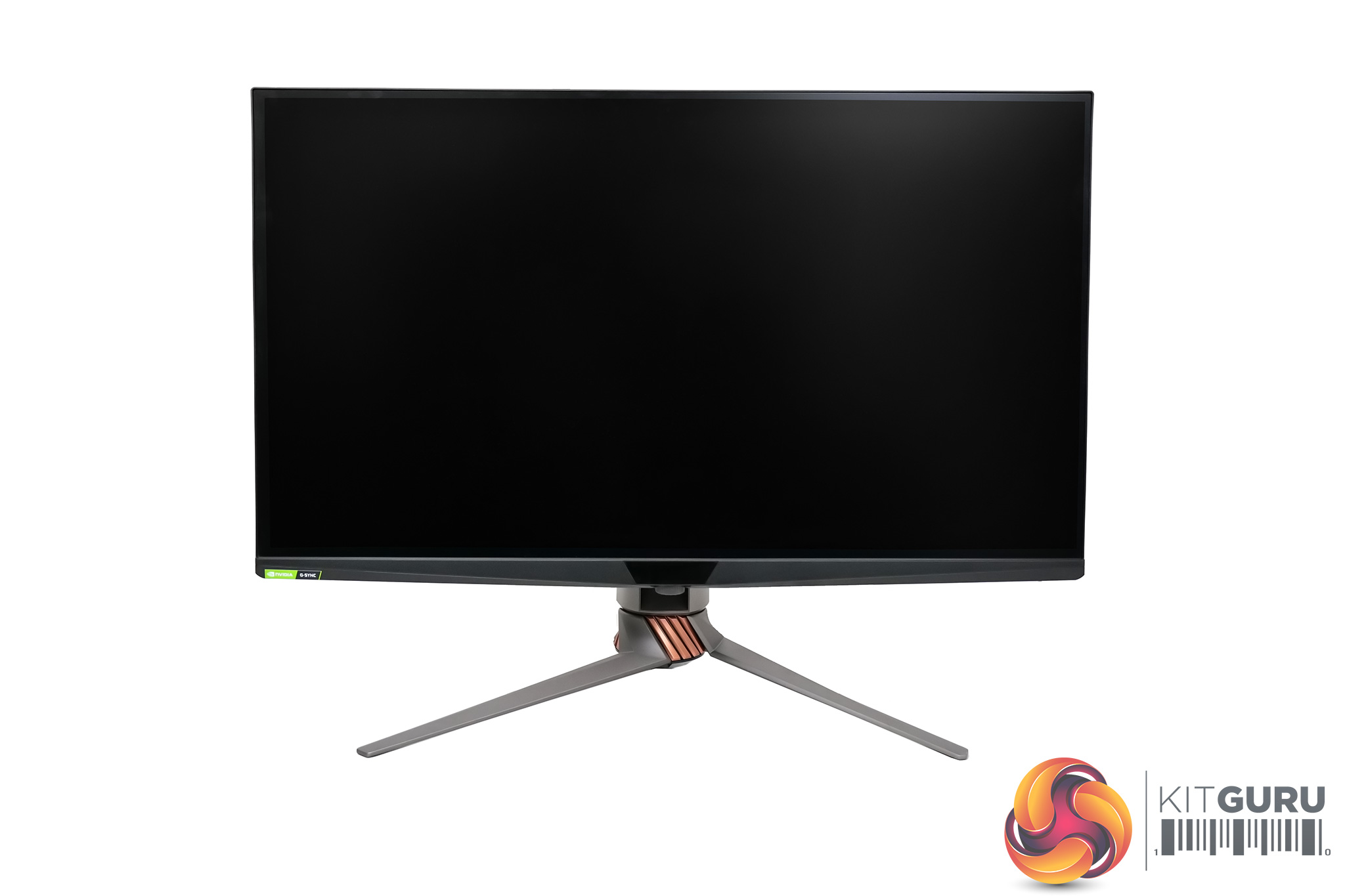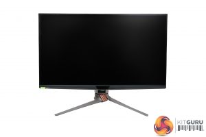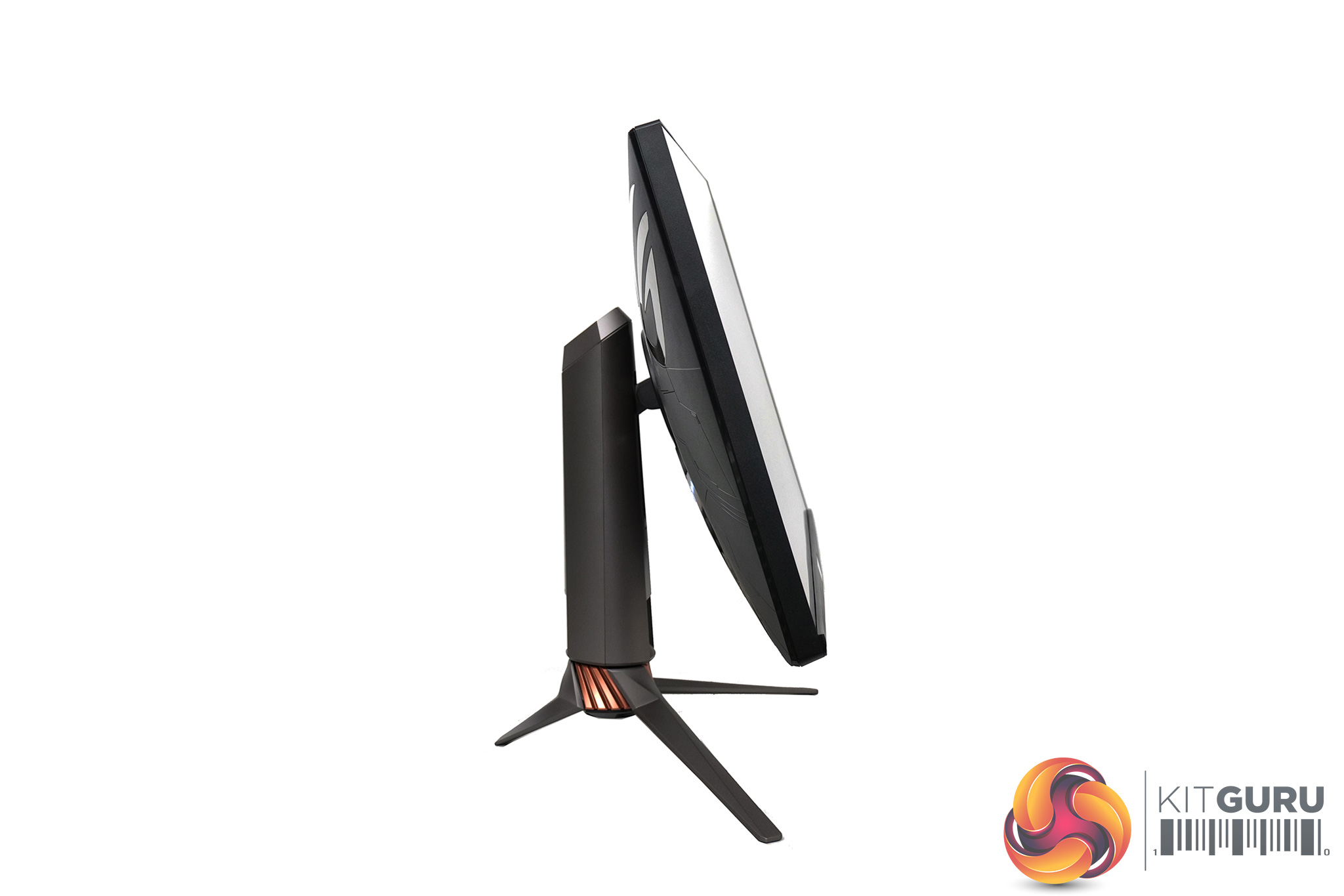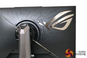 The screen itself looks very similar to previous ROG monitors, with some copper accenting in the base and a three-pronged stand. The back does look more ‘gamer-y' than the front though, with a large ROG logo – which is an RGB zone – as well as a patterned plastic panel.