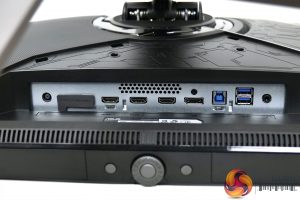 In terms of connectivity, the PG32UQX offers 1x DisplayPort 1.4 and 3x HDMI 2.0. Crucially, that means no HDMI 2.1 support, and we understand this is a limitation of the hardware G-Sync module used with this screen. There's also three USB 3.0 ports, one upstream and two downstream, with a 3.5mm headphone jack also provided as the PG32UQX lacks any kind of speaker.