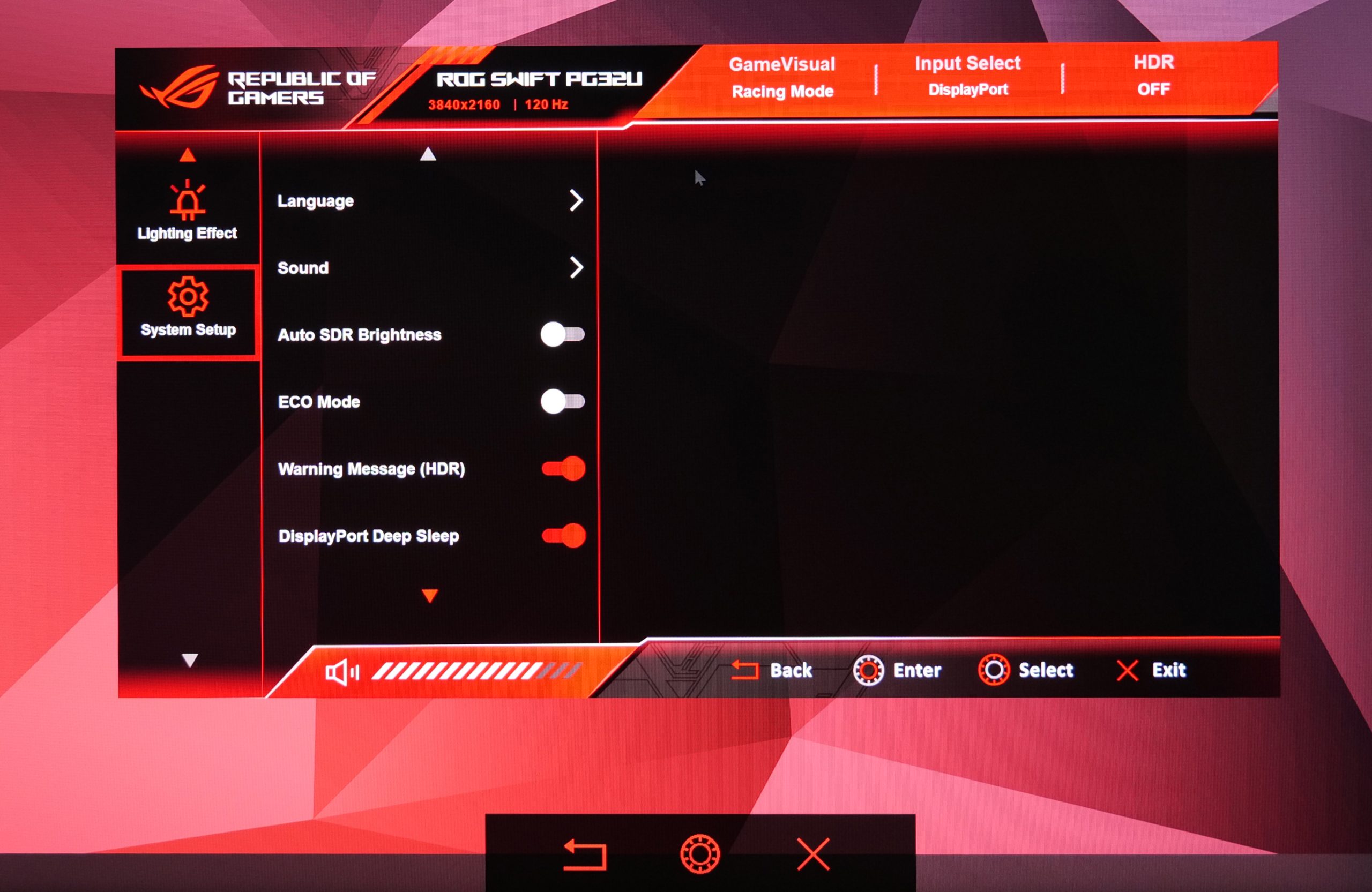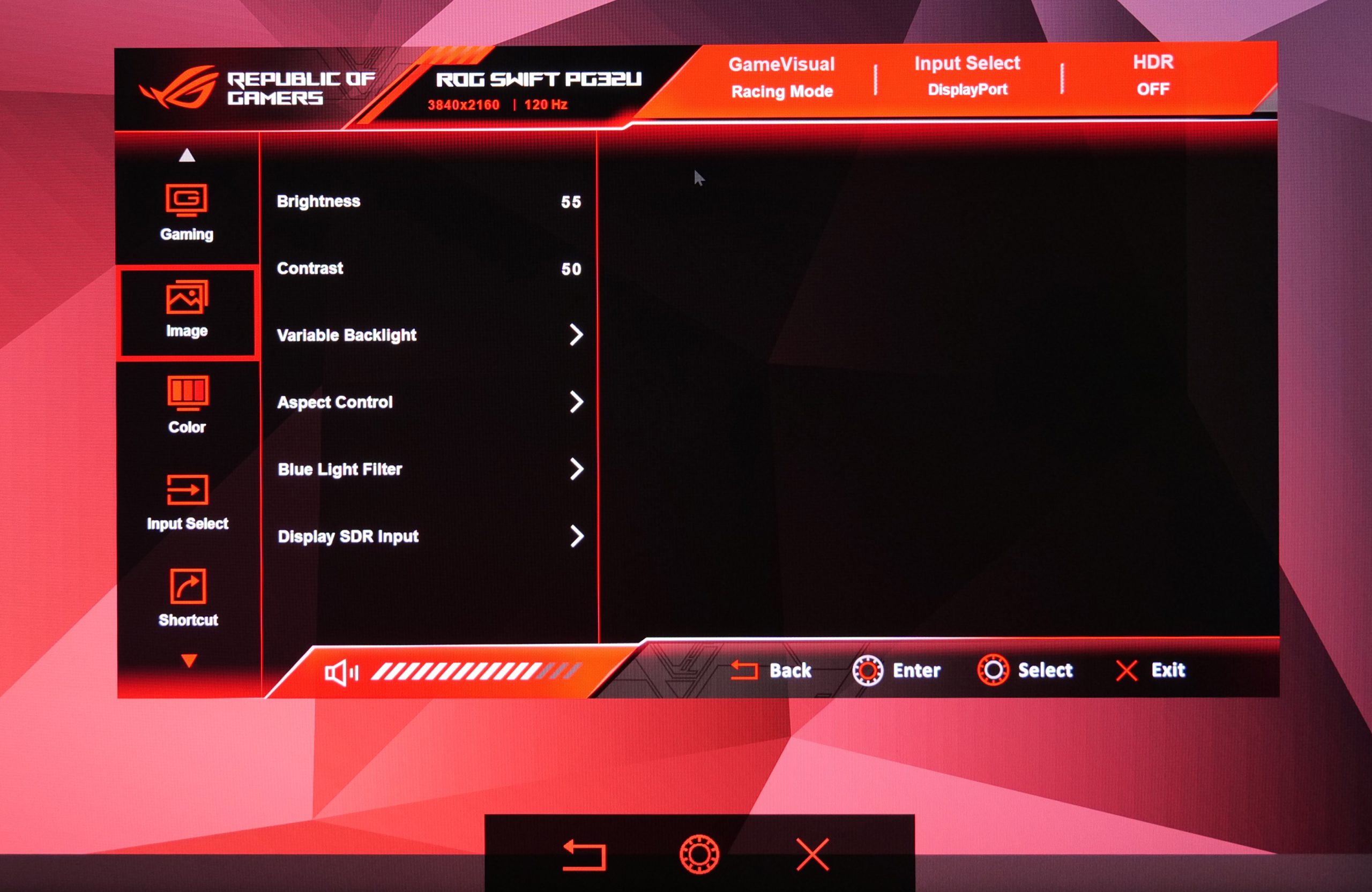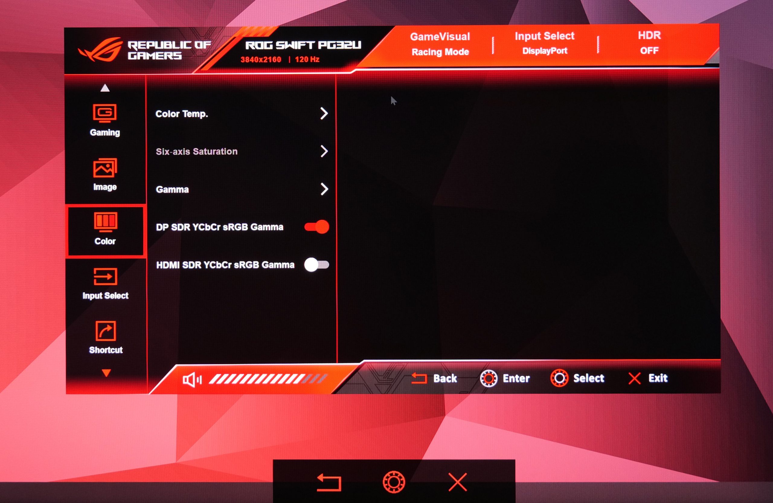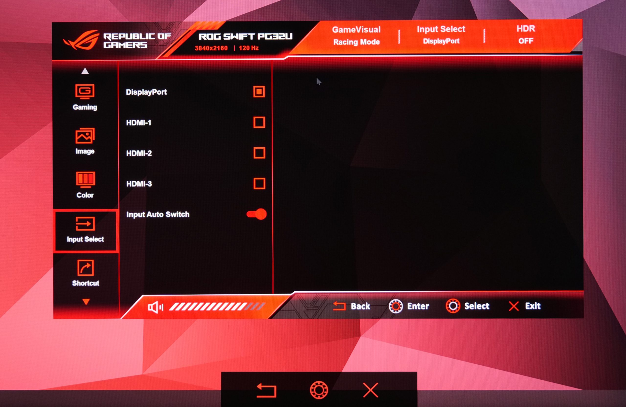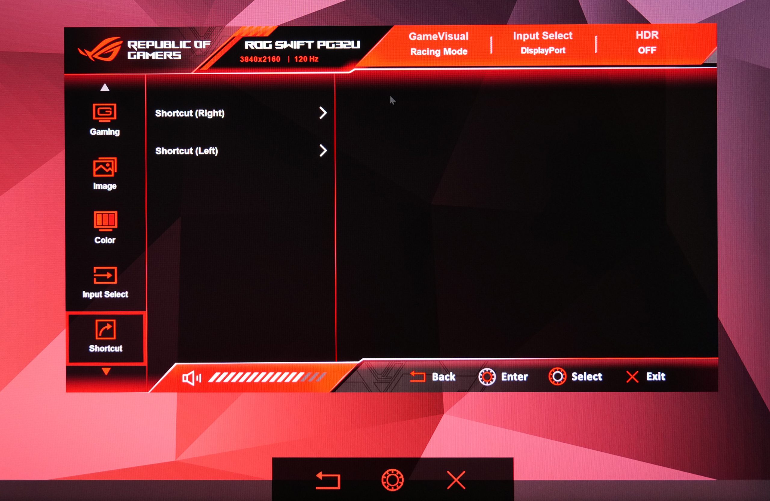 The PG32UQX uses a fairly unique way of navigating the OSD – a dial. The dial itself also houses a clickable button, and it is also flanked by another button on either side, and honestly it works very well – I'd argue it's better than a joystick as it's easier to move through a long list of settings.