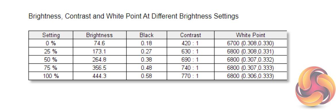 Overall brightness of the panel is impressive. It gets as dim as 74 cd/m2 but peaks at 441 cd/m2 when set to 100% brightness, and personally I preferred to use it at around the 40% setting. Contrast isn't super strong though, peaking at 840:1. We tried to improve this by manually cranking the contrast to its maximum setting, but even then we saw a ratio of 860:1. IPS panels are not known for high levels of contrast, so if you do want something a bit punchier you may want to consider a VA screen.