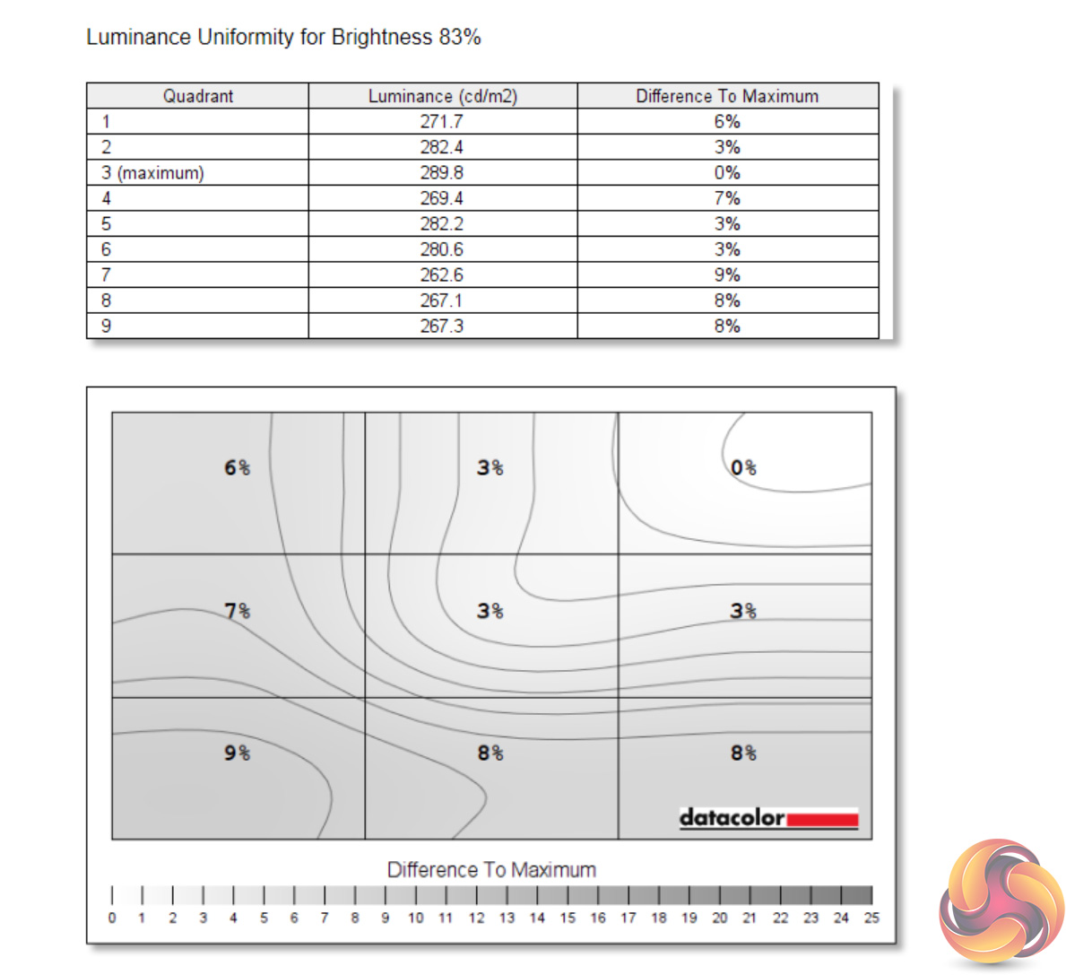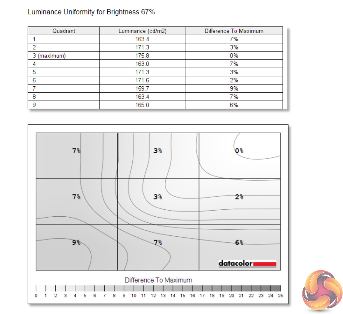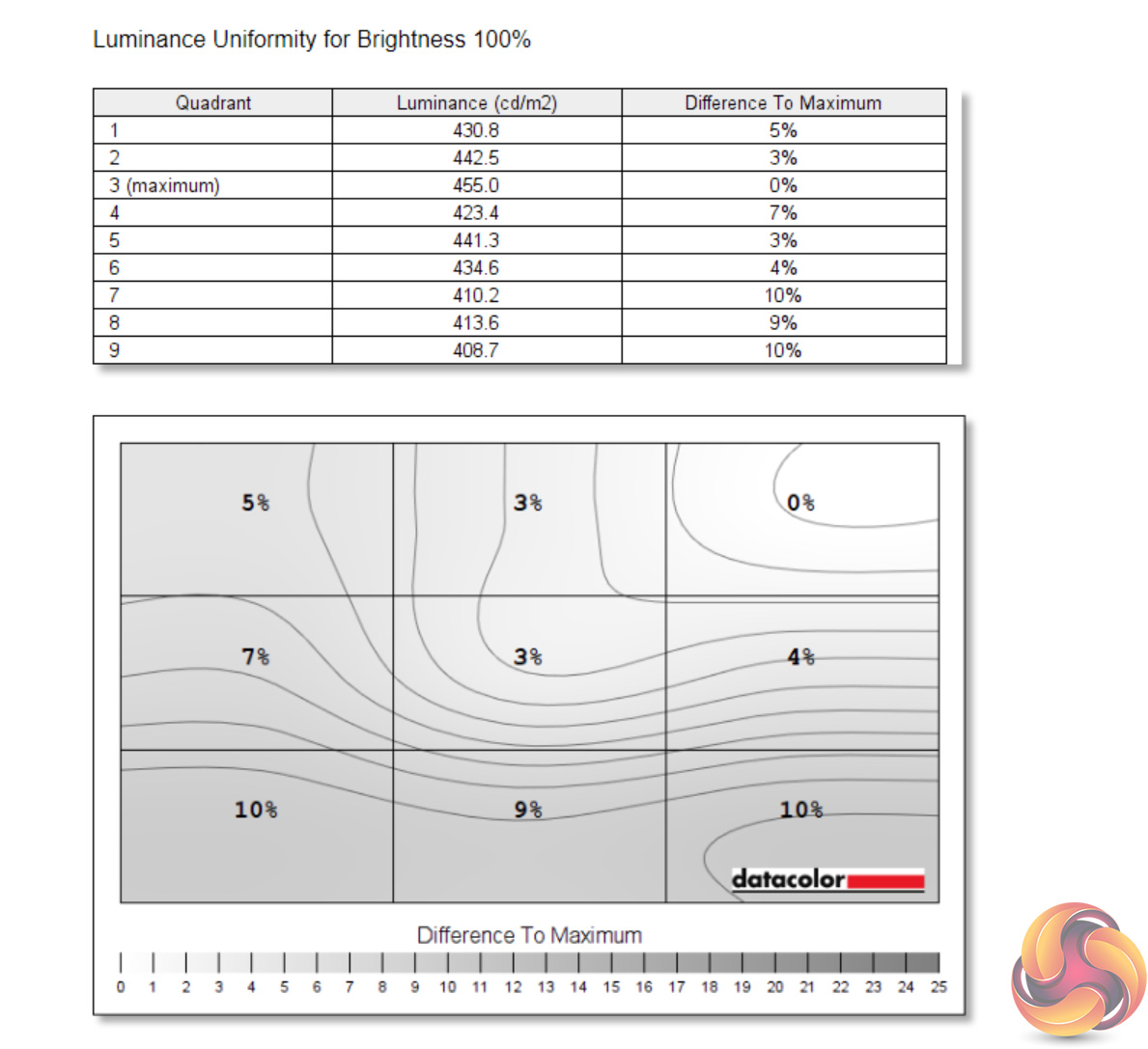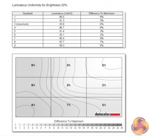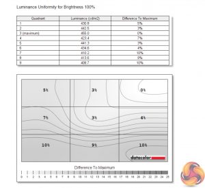 Likewise, luminance uniformity is not a problem. The bottom left-hand corner of the screen proved the most aberrant, and that's also where I noticed a touch of backlight bleed, but the deviation proved never greater than 10% and certainly wasn't noticeable to my eye.