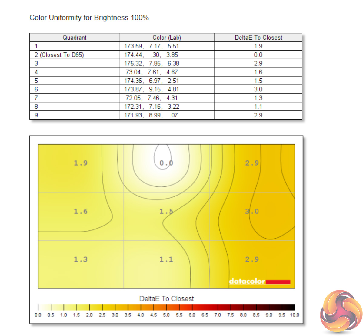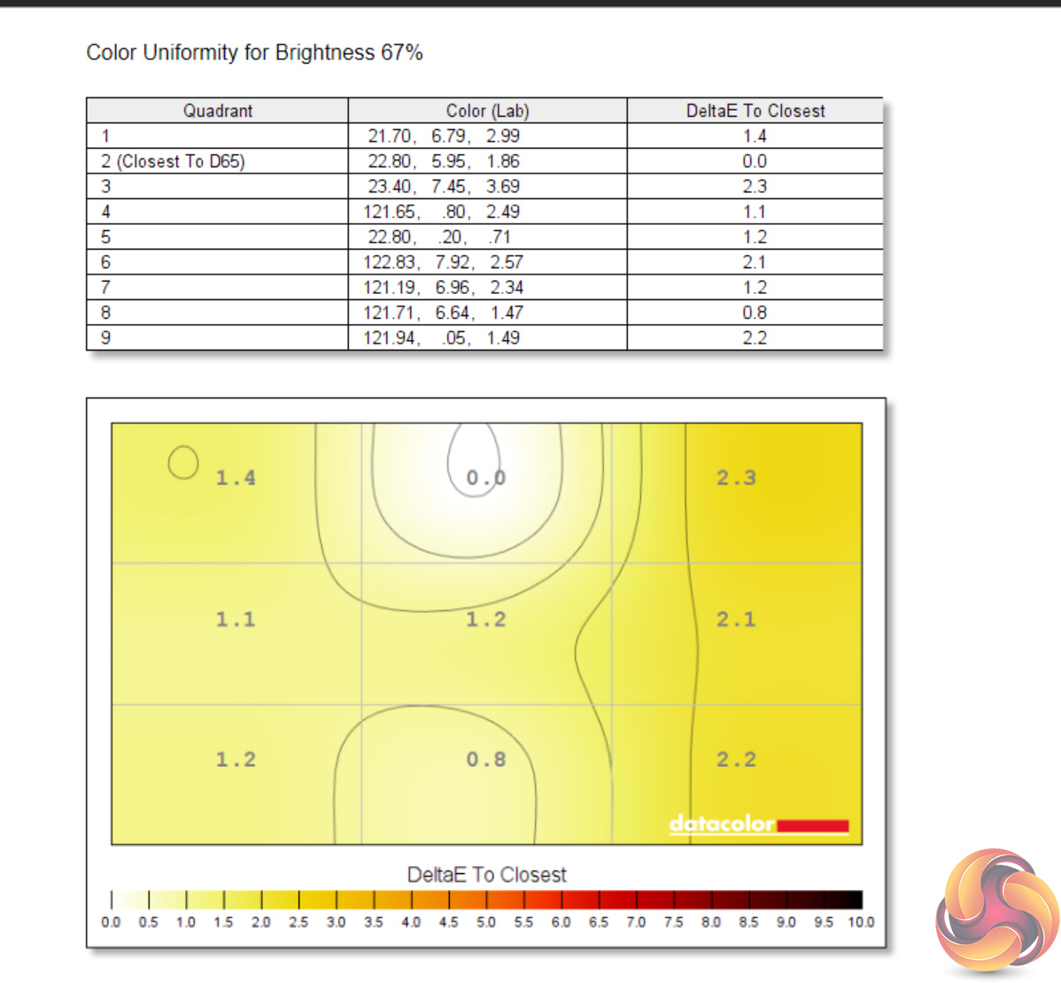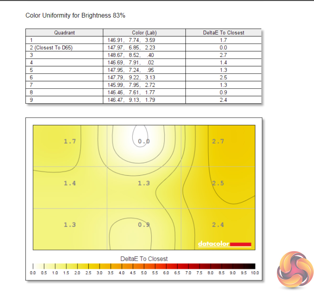 Likewise, luminance uniformity is not a problem. The bottom left-hand corner of the screen proved the most aberrant, and that's also where I noticed a touch of backlight bleed, but the deviation proved never greater than 10% and certainly wasn't noticeable to my eye.