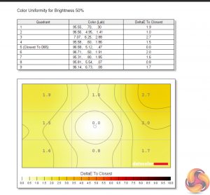 Colour uniformity is very solid, especially at lower brightness levels. There is some deviation down the right-hand side which becomes most evident with 100% brightness, but it's nothing major at all.