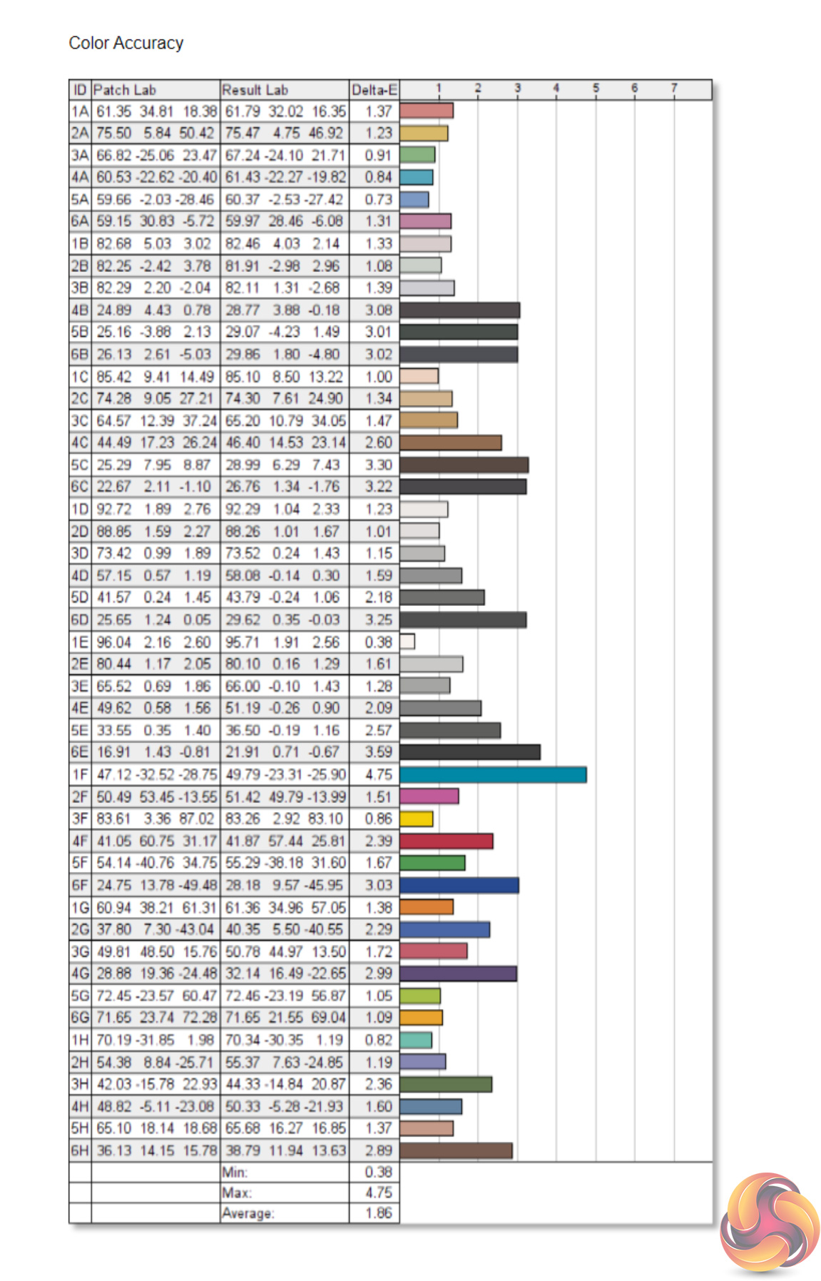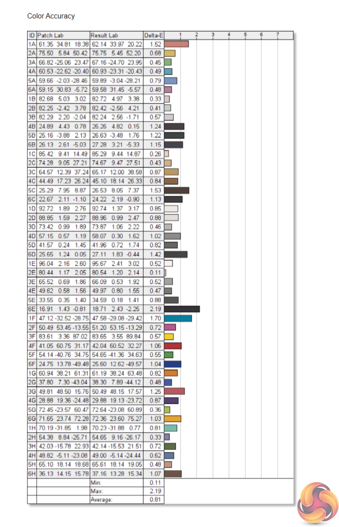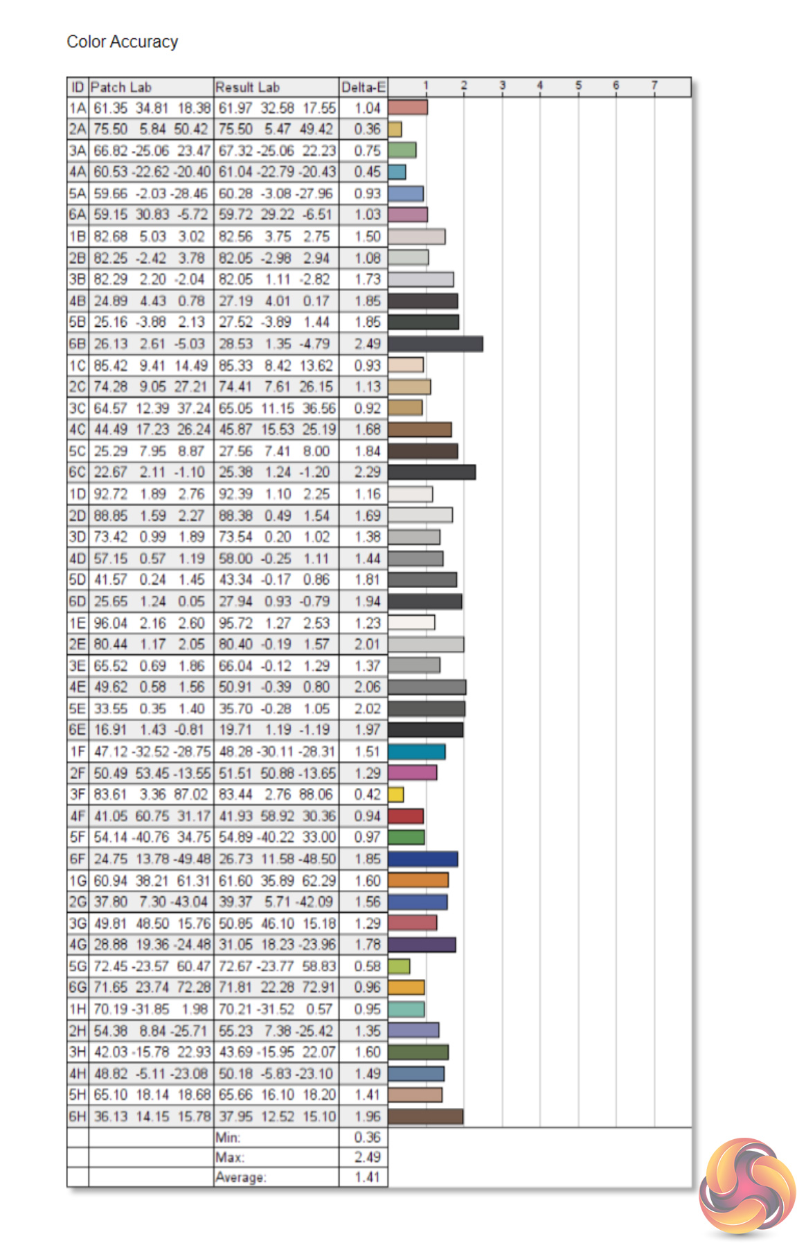 - The colour accuracy, expressed as a Delta E ratio, with a result under 3 being fine for normal use, and under 2 being great for colour-accurate design work.