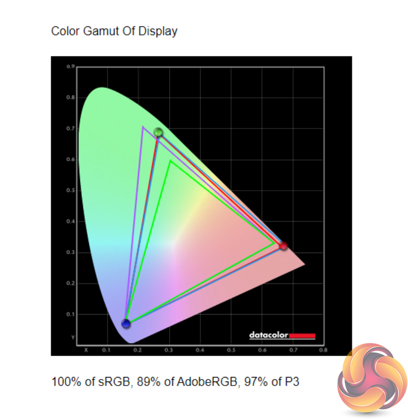 With the Spectrum offering both a DCI-P3 profile and an sRGB profile, we tested both. The DCI-P3 offers 100% sRGB, 90% AdobeRGB and 98% DCI-P3 coverage – right in line with Eve's claims. The sRGB profile naturally hits 100% sRGB coverage, but falls away with the other gamuts.