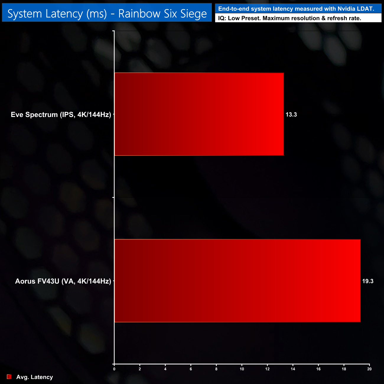 We use Rainbow Six Siege for this testing. We recently changed the graphics settings we test at, to allow for higher frame rates, so the Spectrum is only the second monitor we have tested with LDAT using these settings. That means we currently have limited comparison data, but we will add to these charts as we review more screens.