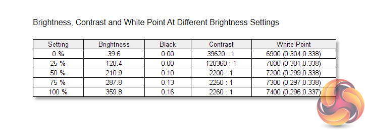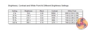 Contrast again seems over-reported until we hit 100% brightness, but importantly the white point remains unchanged at 7400K at peak brightness, so still slightly cool.