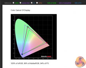 Starting with colour gamut, Gigabyte claims the G32QC is capable of 124% sRGB and 94% DCI-P3 coverage. Our Spyder colorimeter doesn't report values over 100% for the sRGB space, but we do hit that 94% P3 gamut as per Gigabyte's claims, with 86% AdobeRGB coverage as well. So far so good.