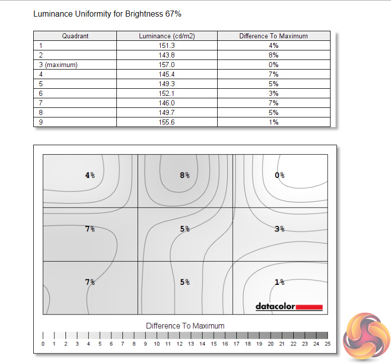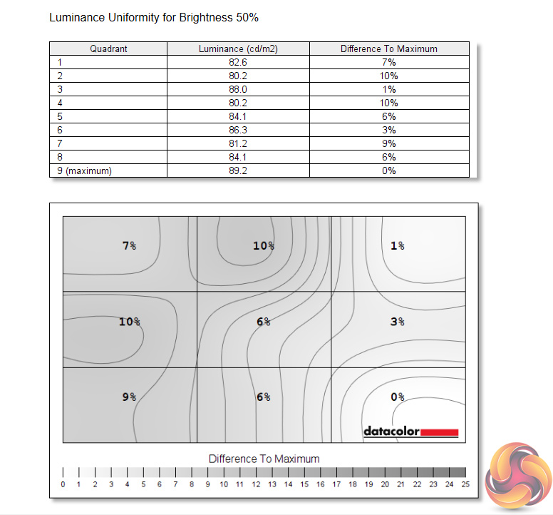 Moving on to brightness uniformity, there's little wrong here. The top and bottom left areas of the screen measure some deviation, at most 10% when brightness is set at 50%, but this isn't much to worry about it.