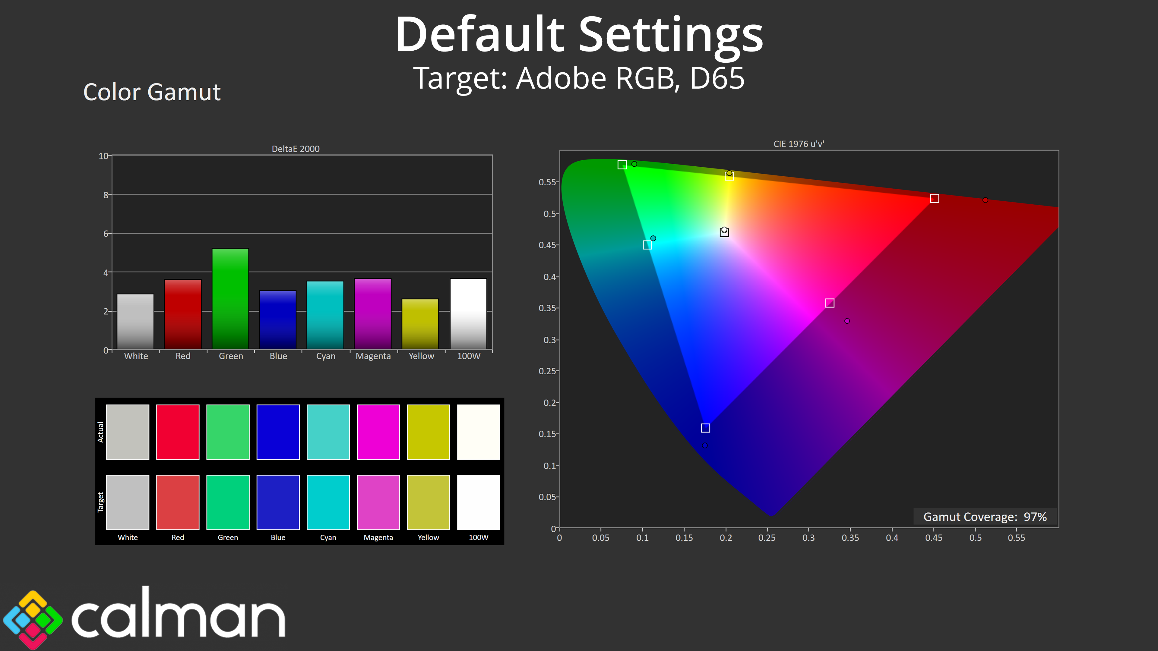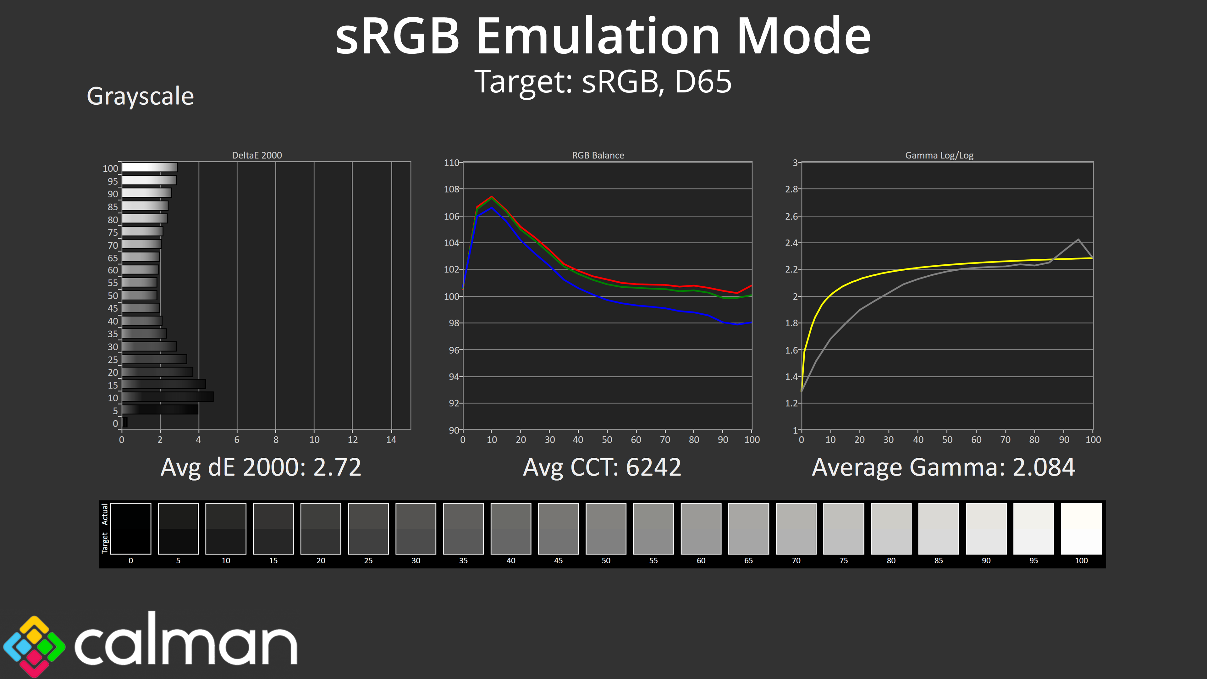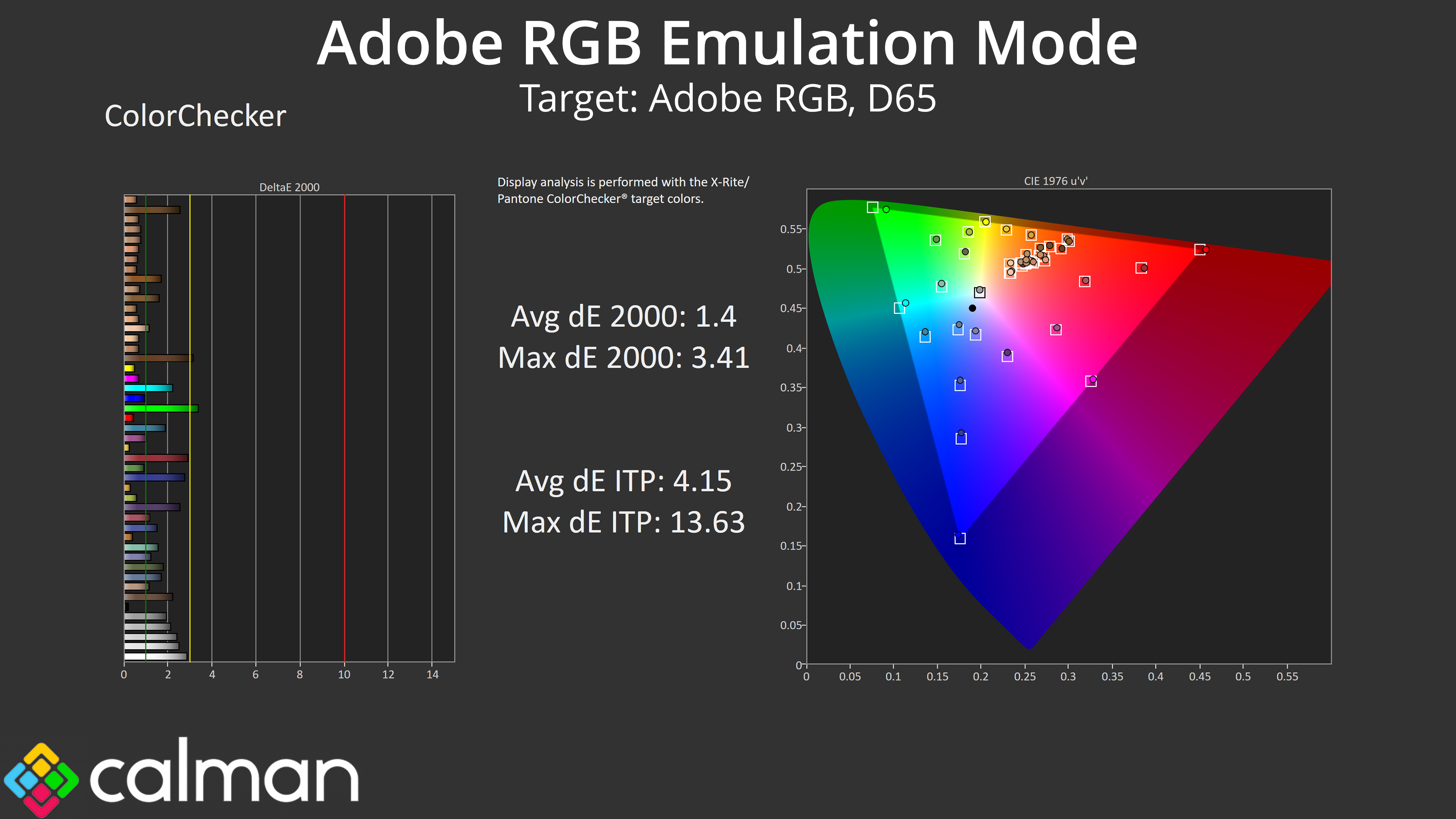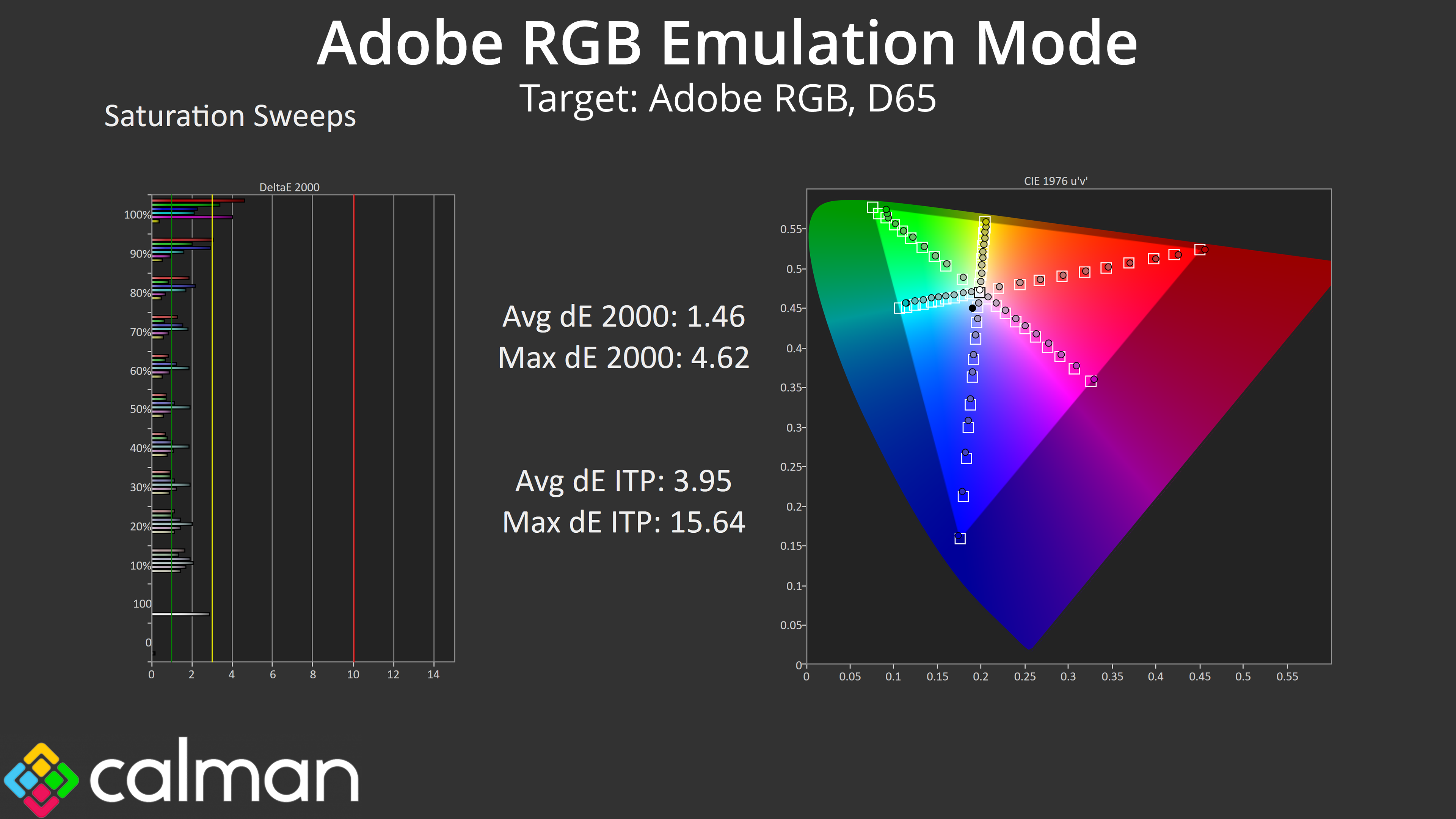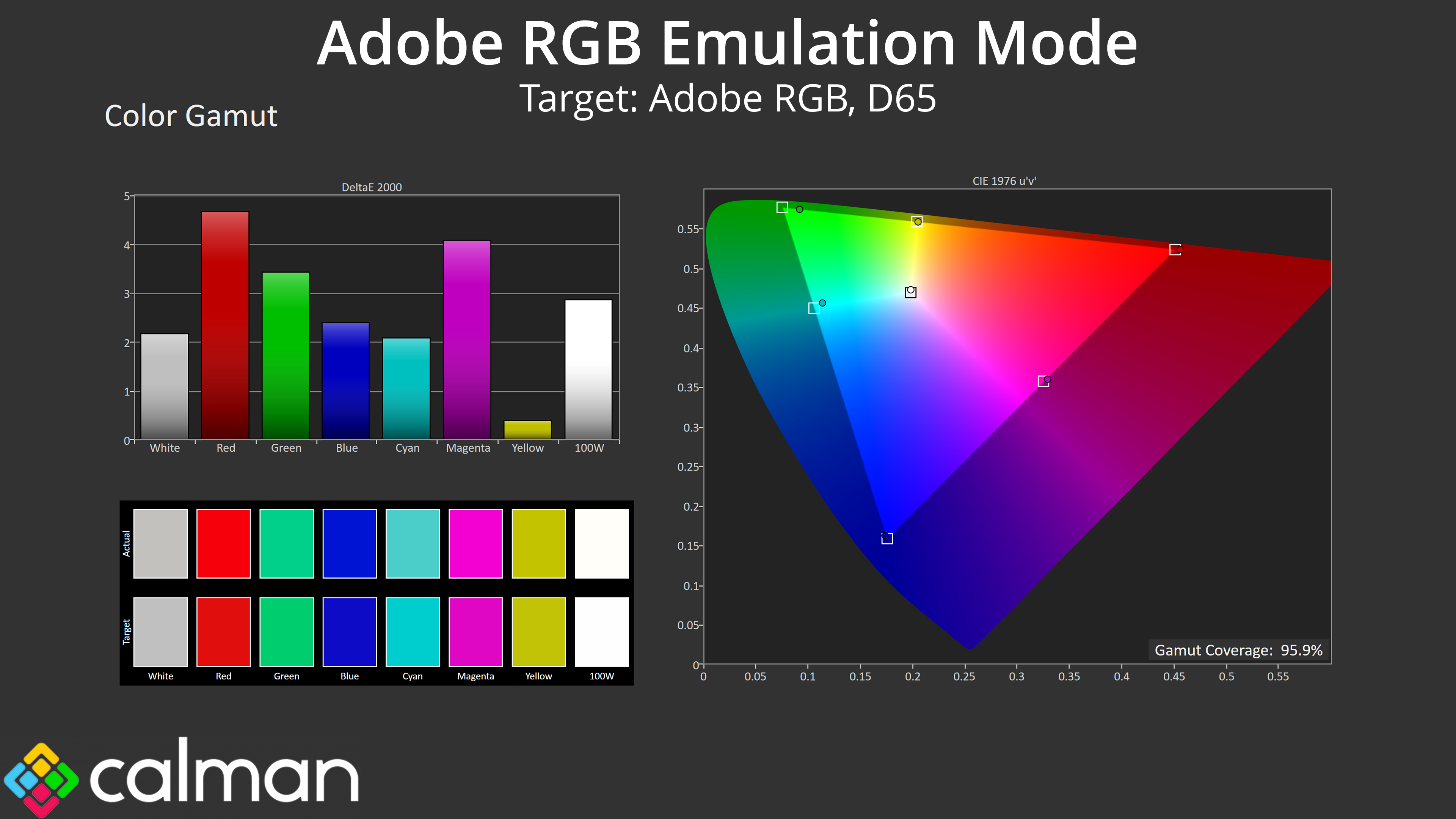 Lastly, the same can be said for the Adobe RGB emulation mode. All three colour space modes we tested are worth using over factory settings if you want to work with one of these colour spaces, as gamut tracking is much improved. However, gamma is too low across the board and that hurts overall accuracy of the screen.