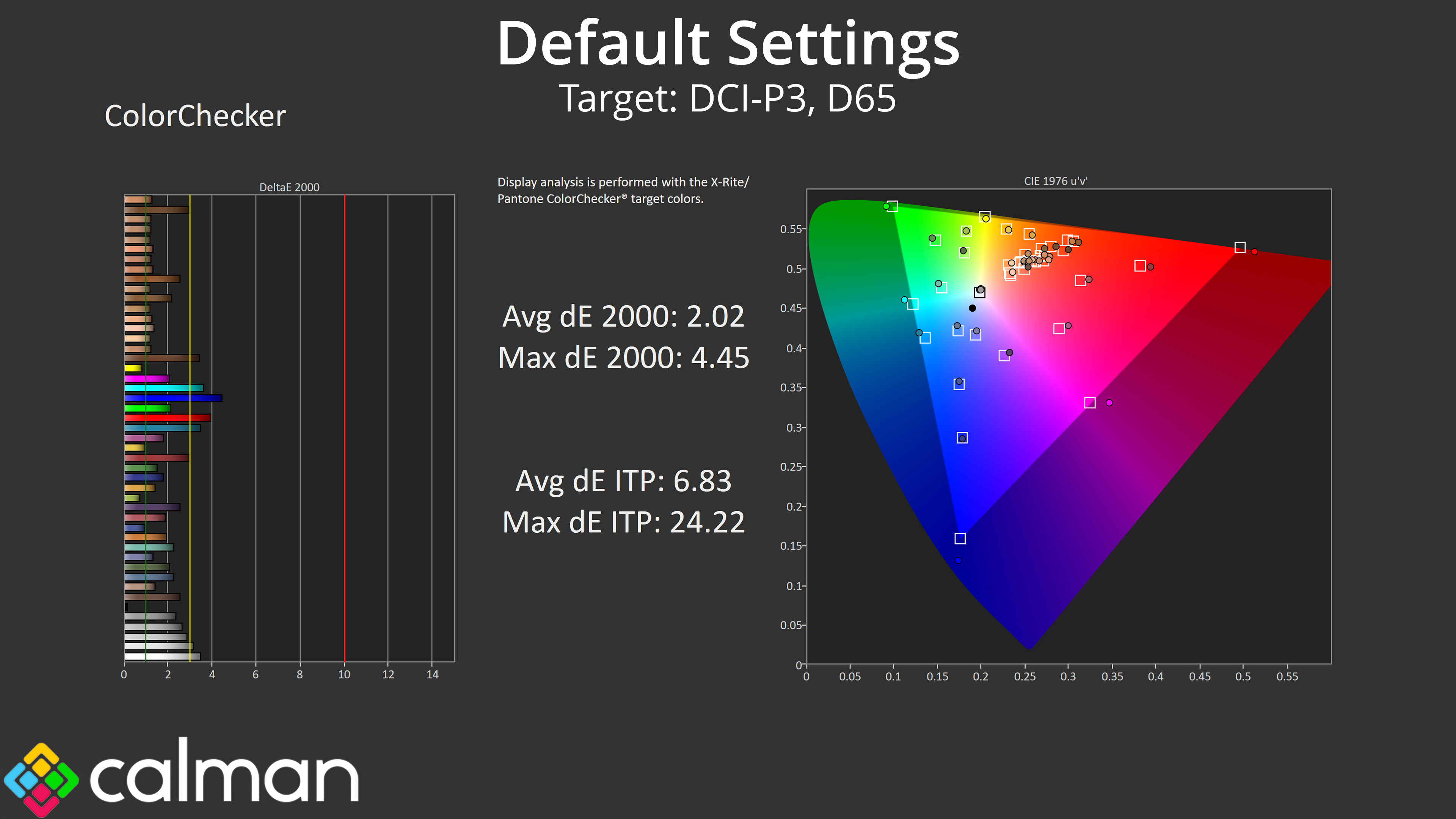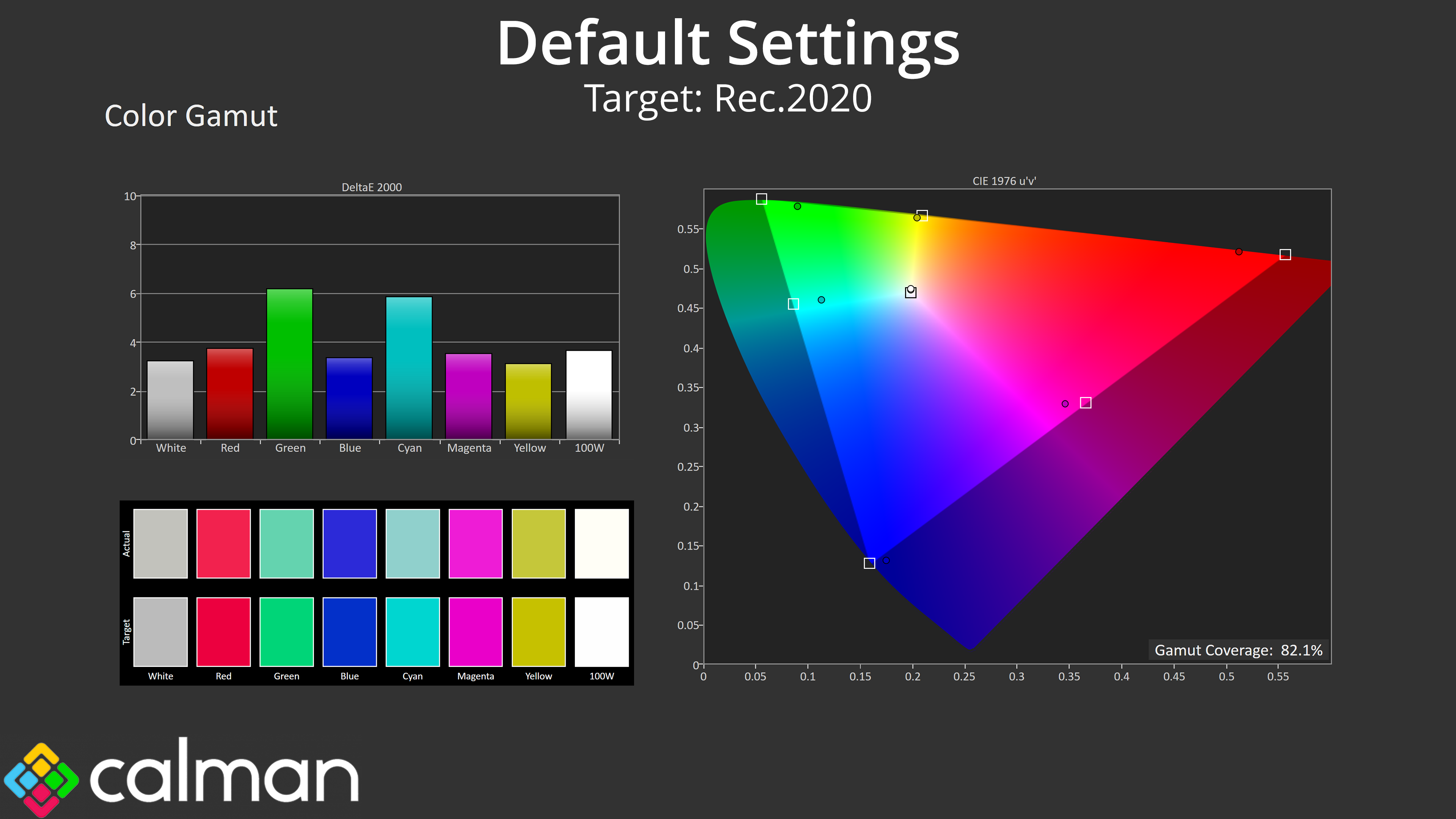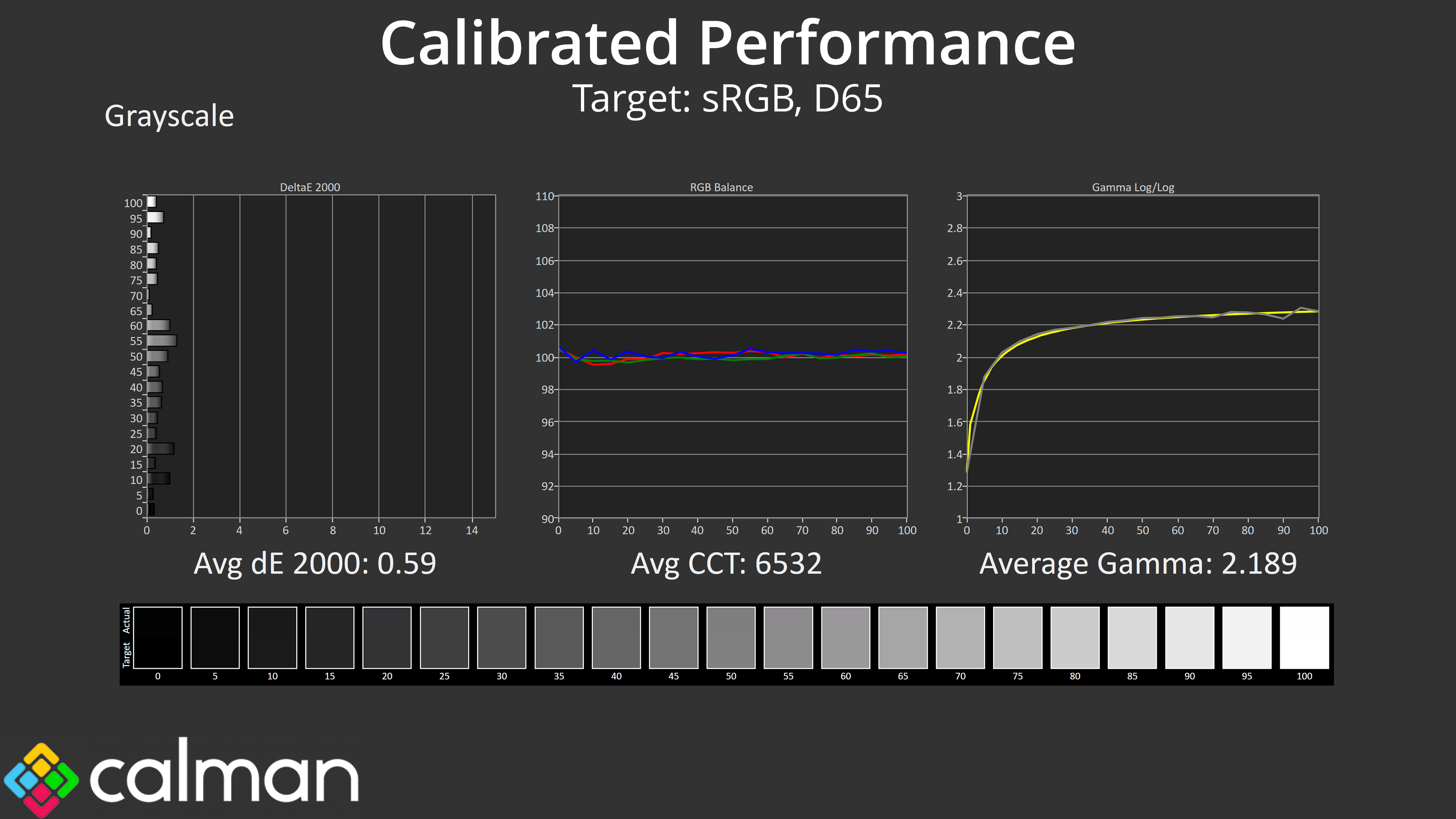 To try and fix that, we did a full calibration using Calman Ultimate. The good news is that it worked – sort of. Greyscale behaviour is basically flawless when calibrated, as you can see the perfectly flat colour balance chart, while gamma tracking is almost perfect, so that's a definite win.