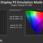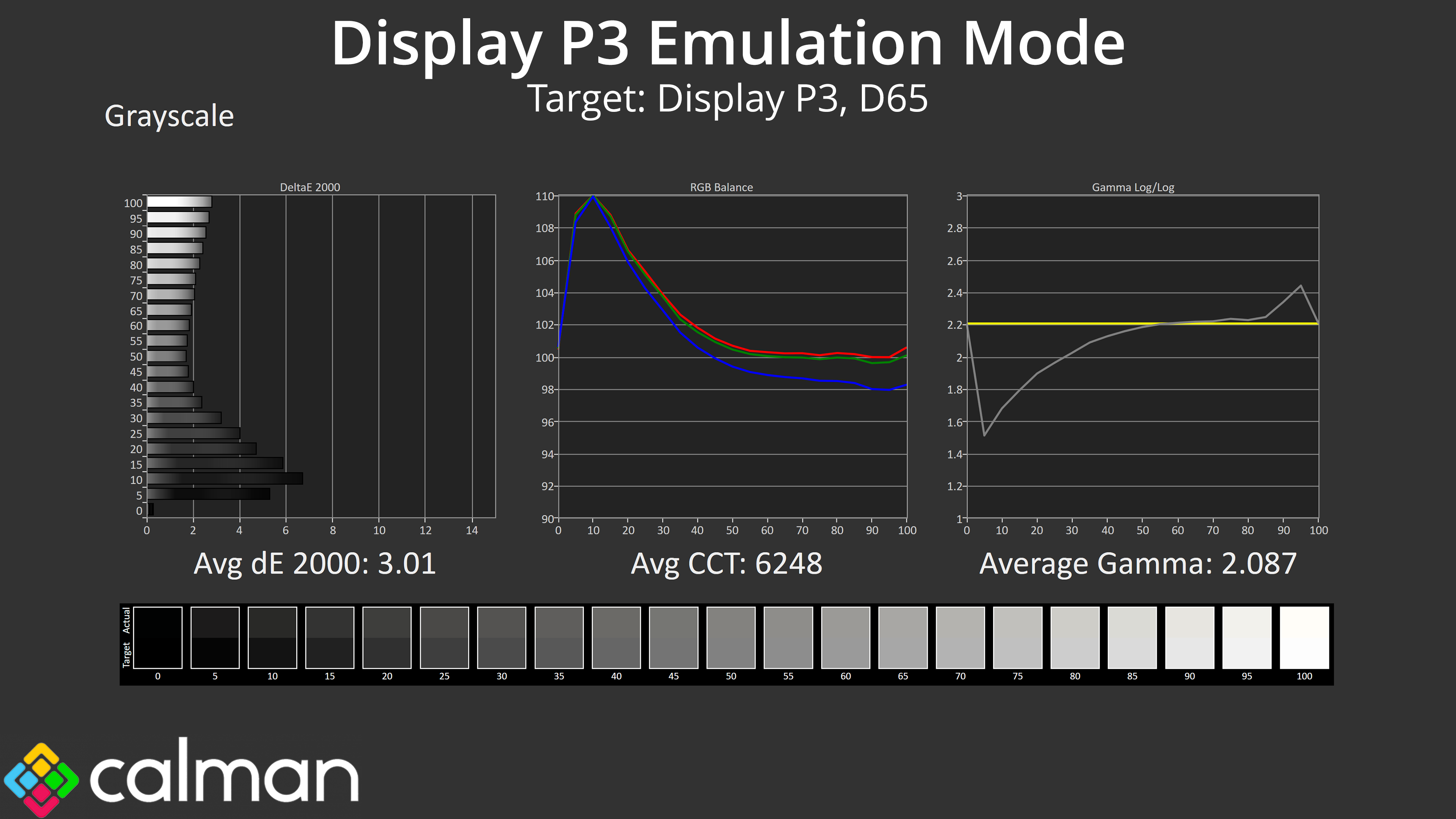 Next we tried the Display P3 mode and found more of the same. The gamut looks good, colour balance is just under 6300K, but gamma is just too low to meaningfully improve the greyscale accuracy. We still see much improved saturation and colour accuracy results, but the gamma is the real issue here.