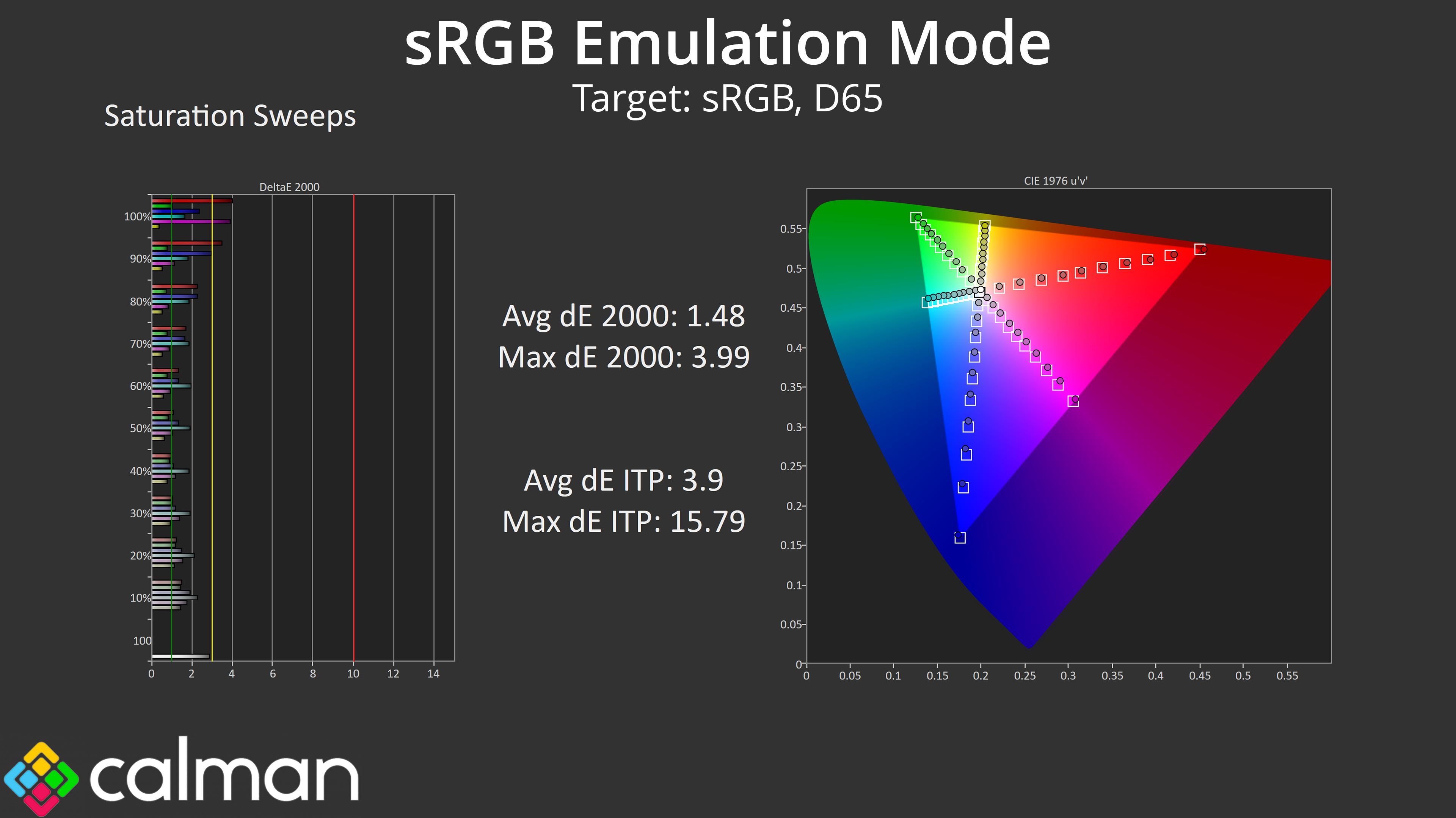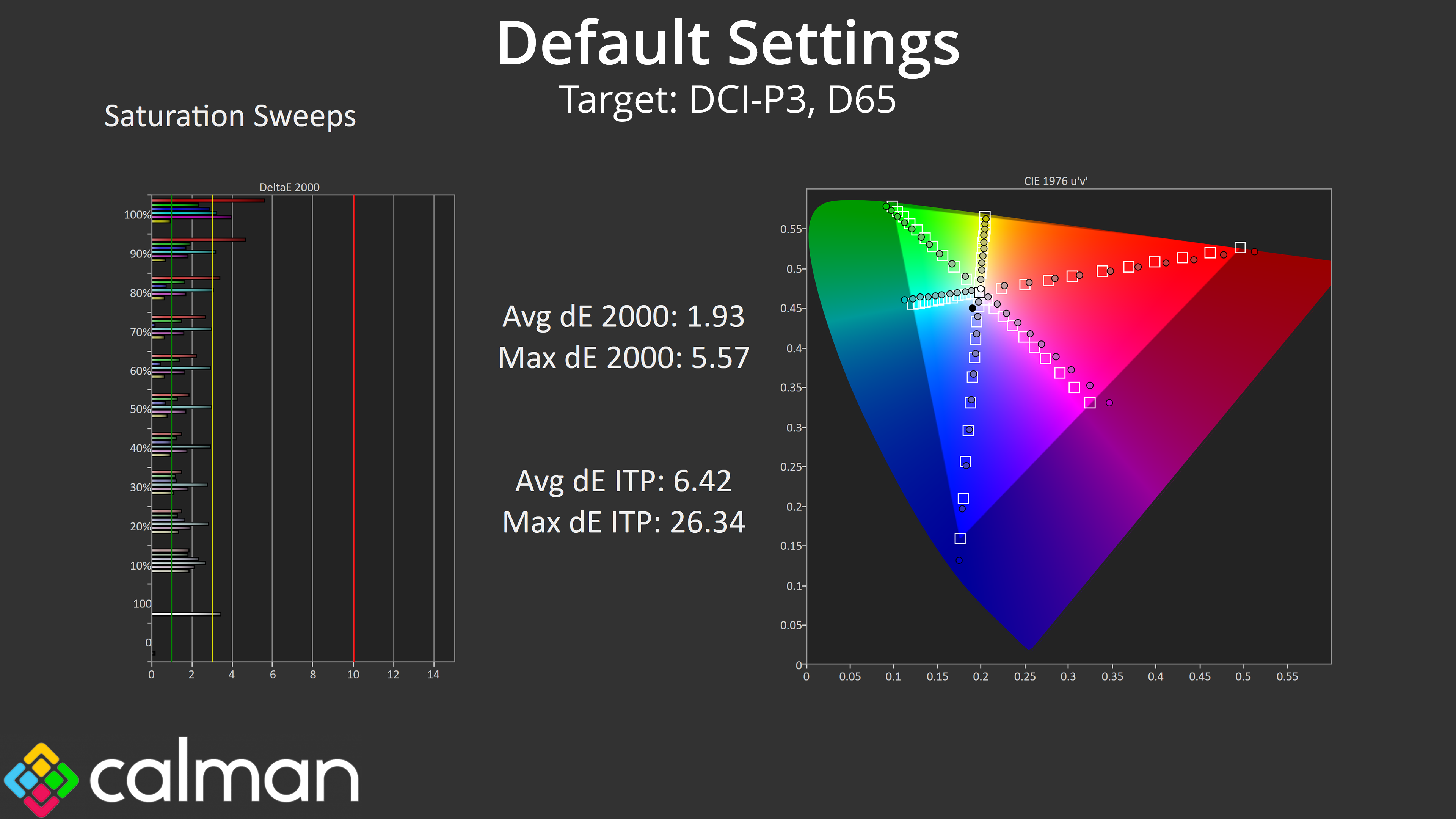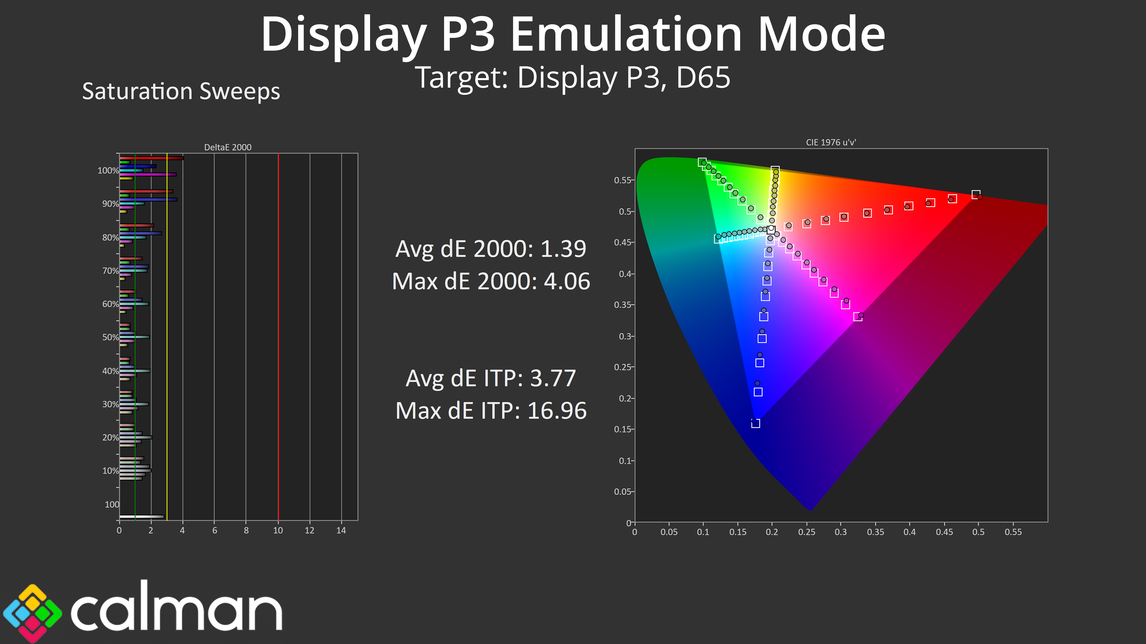 Saturation sweeps indicate performance that's about as expected – the very wide gamut means a lot of oversaturation relative to sRGB, though this improves significantly when compared against the DCI-P3 space.