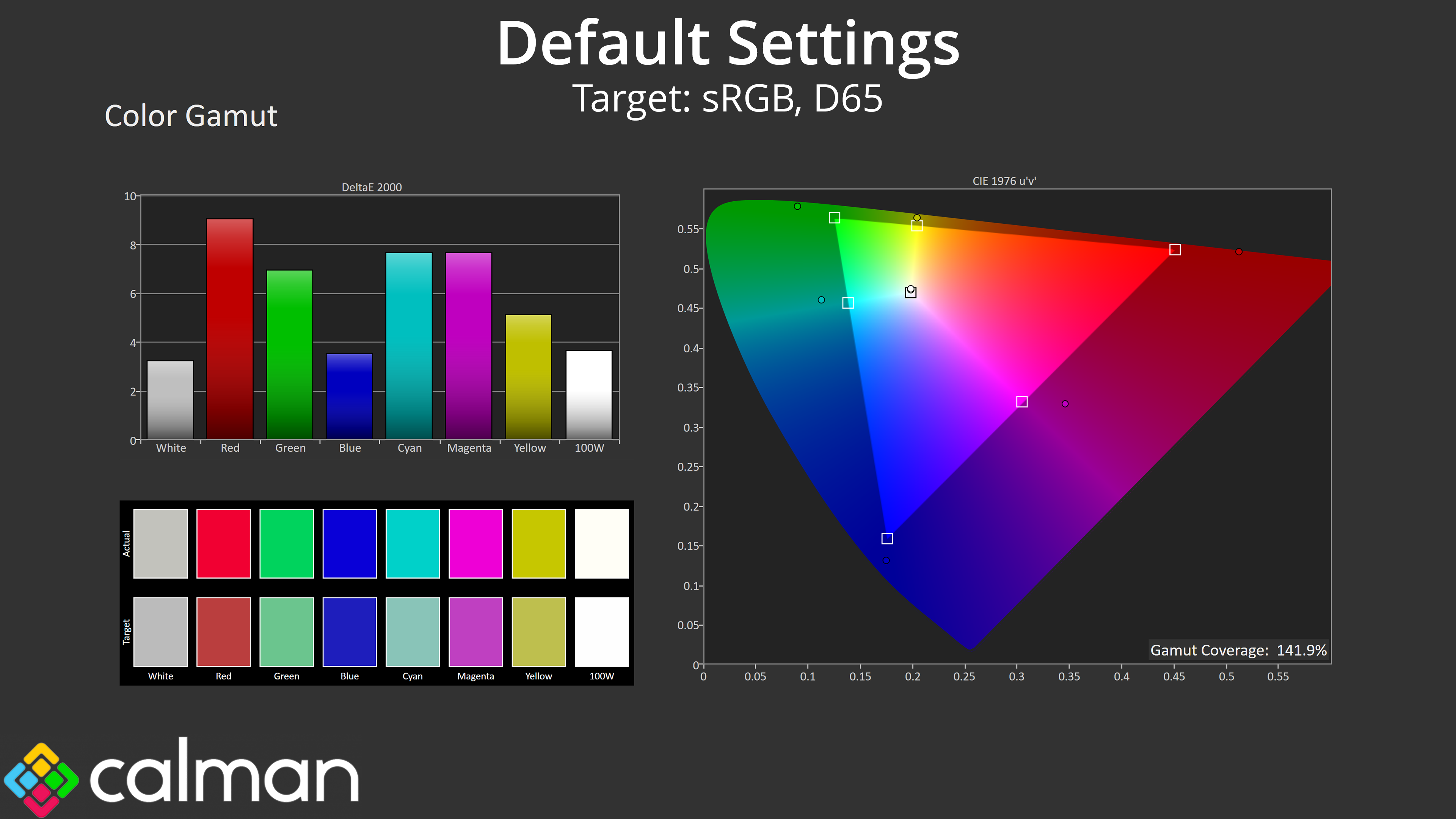 We first run these tests with the display in its out-of-the-box state, with all settings on default. If there is an sRGB emulation option or other useful mode then we may test that too. We then calibrate the screen using the Calman Ultimate software and run the tests again.