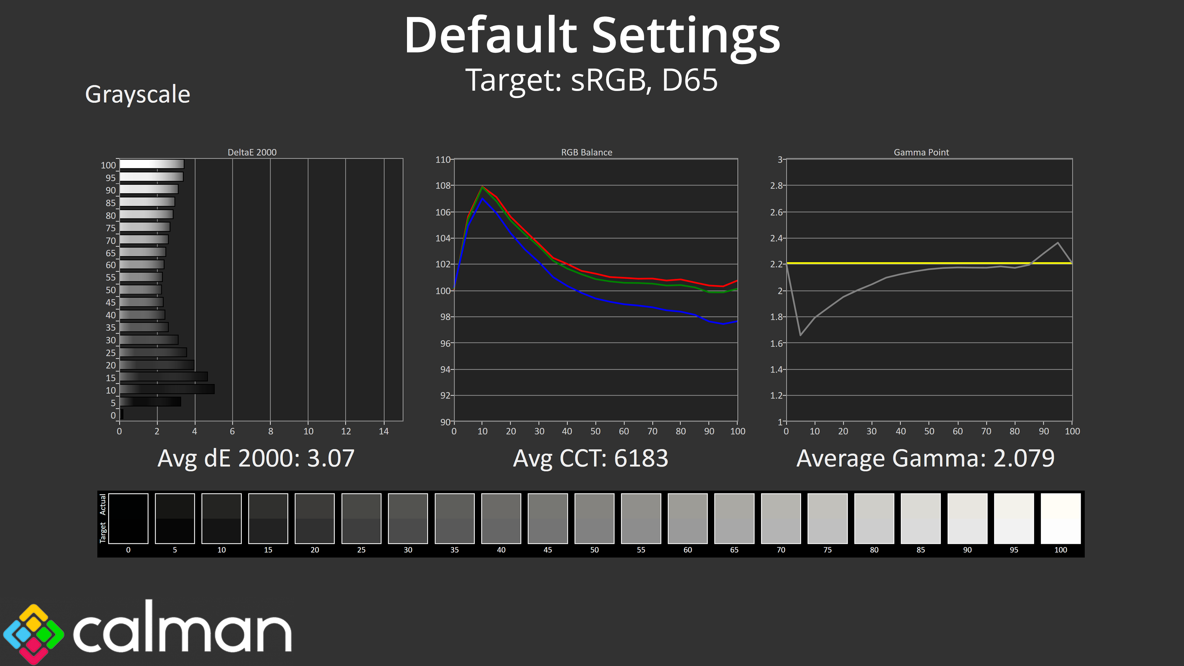 Factory greyscale performance does leave a bit to be desired, to put it mildly. Colour balance isn't terrible – there is a slight imbalance, resulting in an average CCT of 6183K, but that's only a 5% deviation from the 6500K target and can be easily remedied via a manual colour balance.