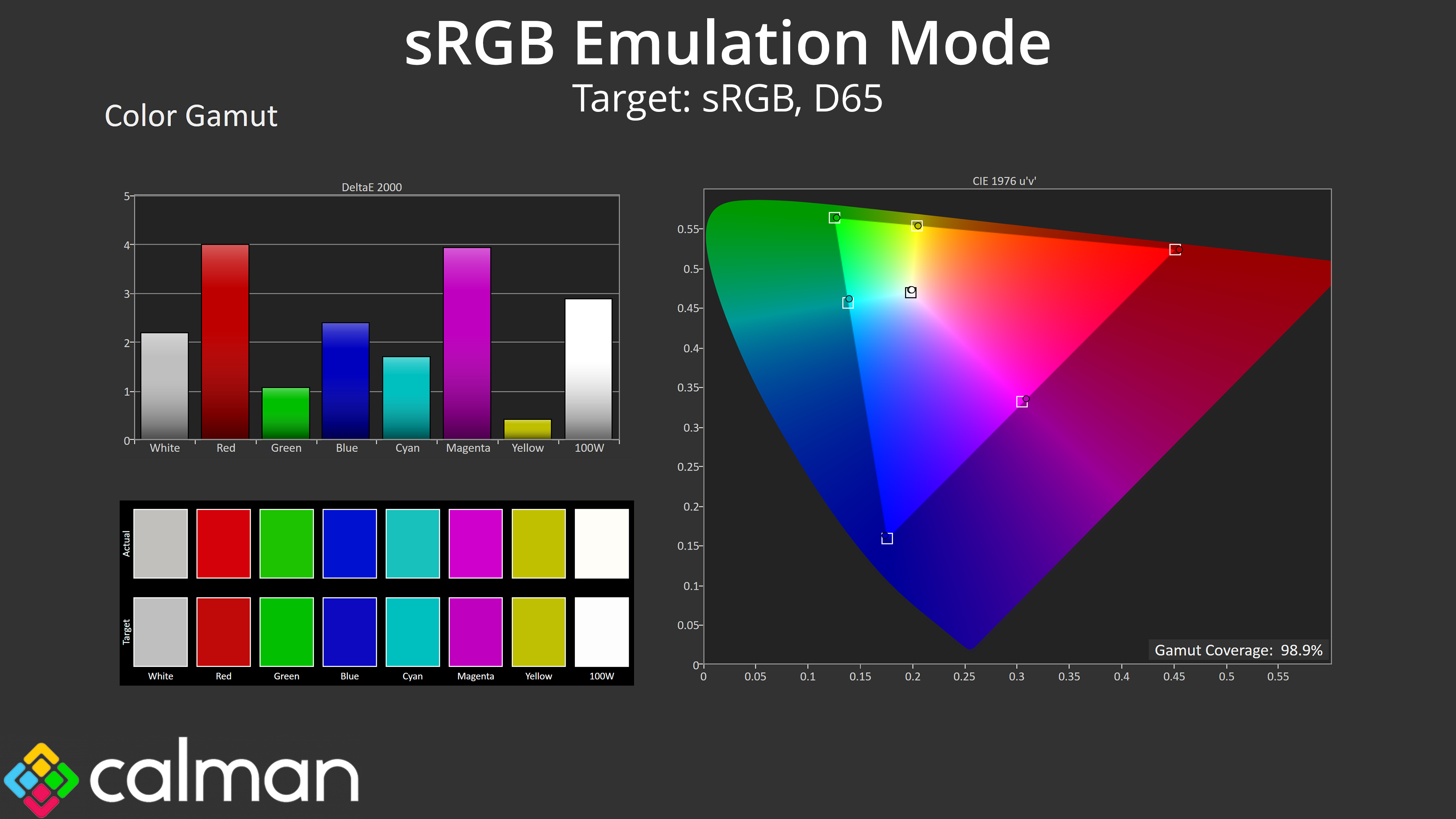 The strange thing is that, for a still unknown reason, the gamut wasn't clamped by my calibration and when using the resulting ICC profile. Usually it locks in perfectly to the sRGB space (which we are targeting here), but not so for the HB2701UHSNP, and I'm not sure if that's because of the monitor or my calibration tools. It's a strange one, so if you have any insight, please do get in touch!