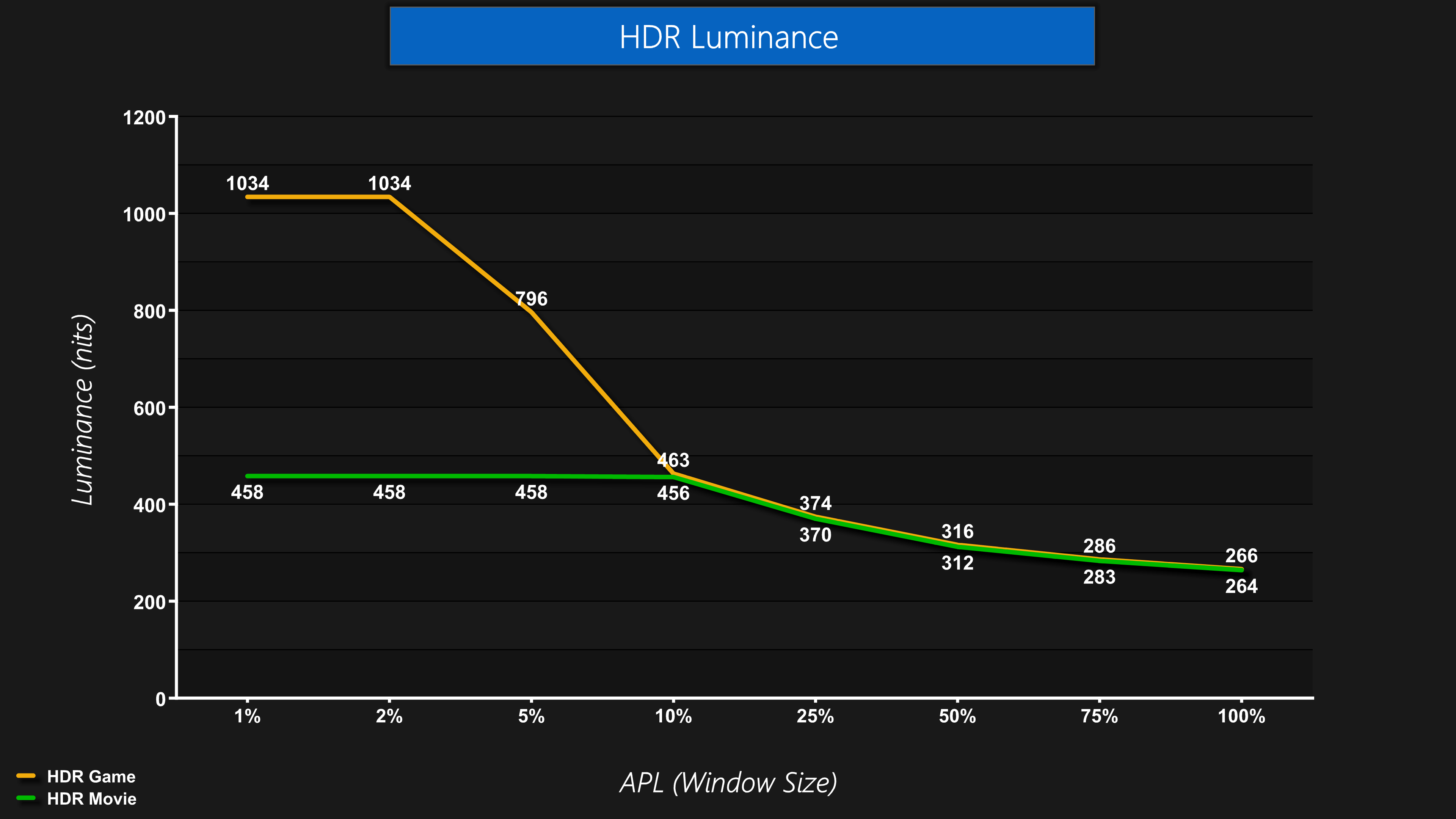 Both the Auto and Movie mode behave the same in terms of brightness, closely mirroring the typical HDR 400 True Black behaviour, whereas the HDR Game mode is like the Peak 1000 nits mode, hitting over 1000 nits for the 1% and 2% APLs before dropping off as the window size increases.