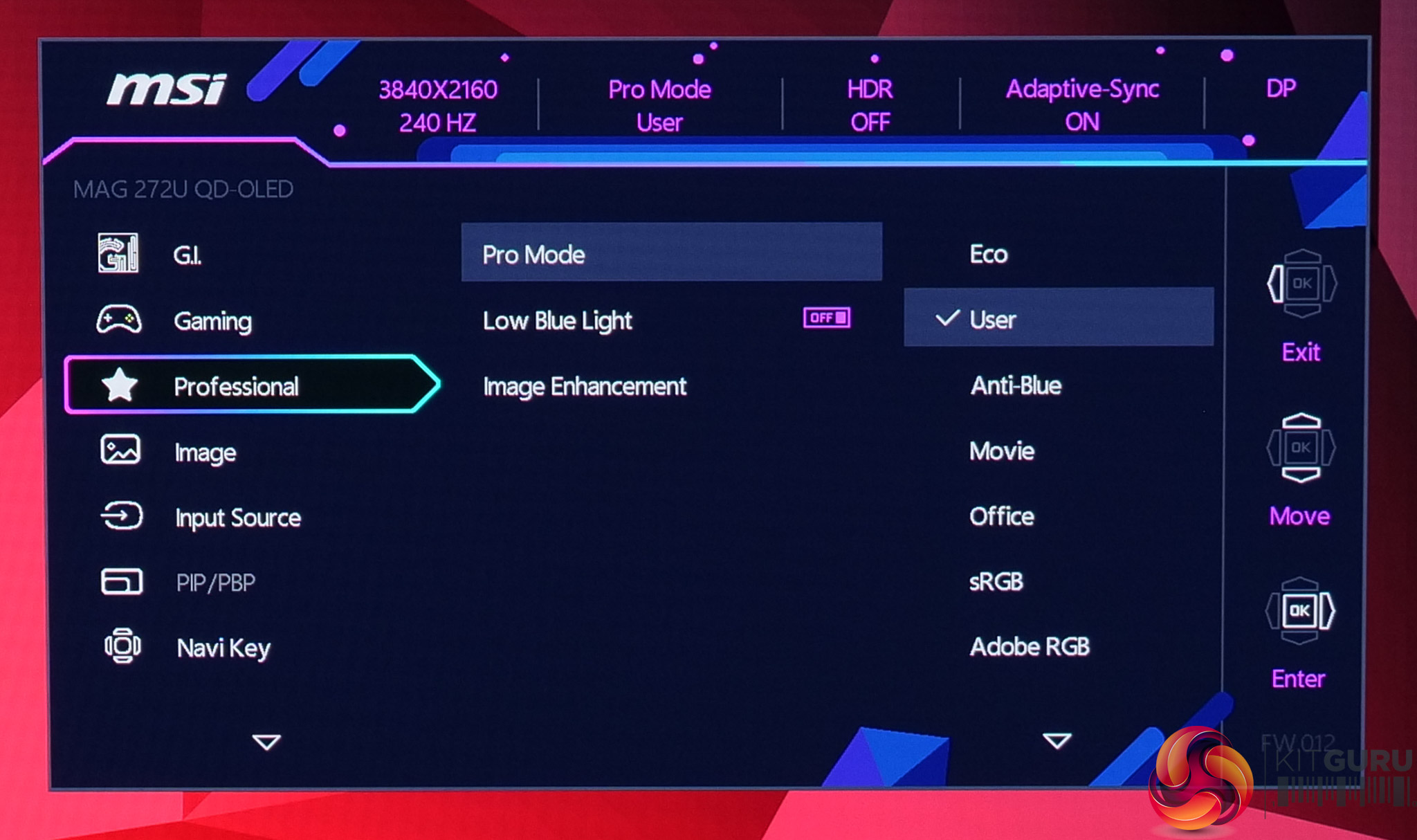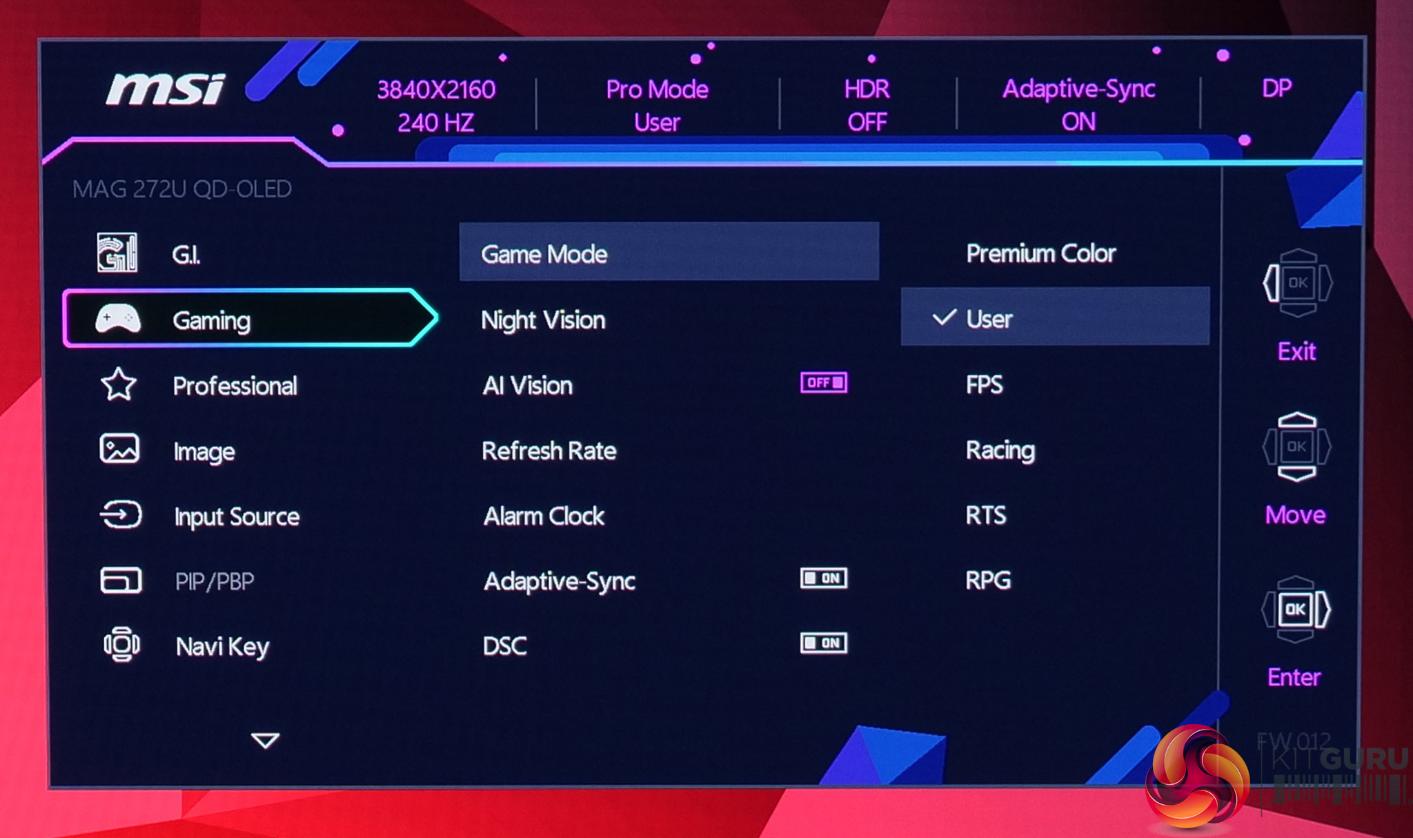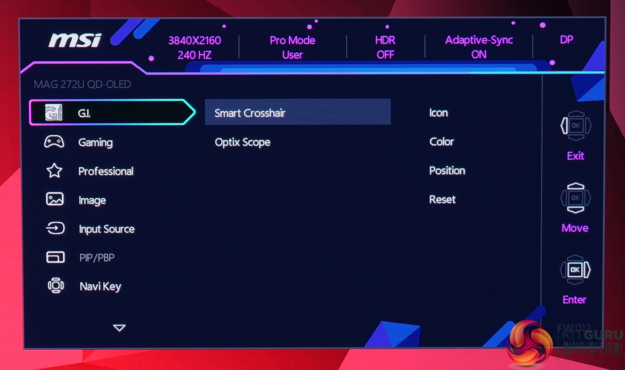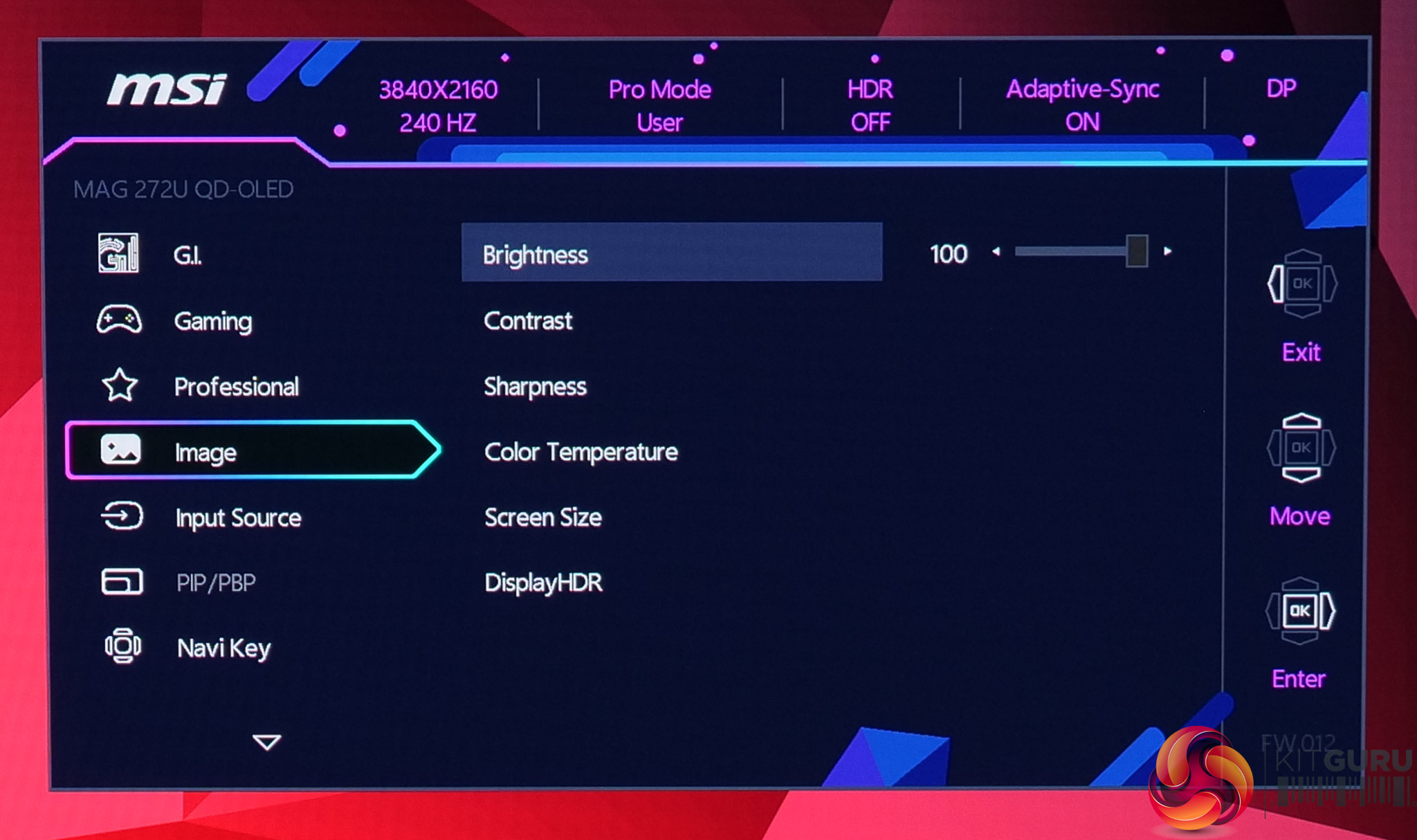 While not the newly updated and slightly cleaner design we saw on MSI's MPG 341CQR, the OSD menu is still very familiar and easy to use with the joystick. Things are sensibly laid out, too, and it's a very well-featured selection, with all the gamer-specific options we have come to expect as well as customisable white balance, an sRGB emulation mode and so on.