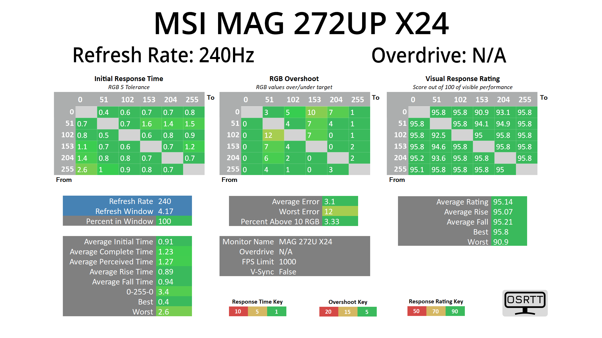 We use the Open Source Response Time Tool (OSRTT), developed by TechTeamGB, for our response time testing. This measures grey-to-grey response times and presents the results in a series of heatmaps, the style of which you may be familiar with from other reviews.