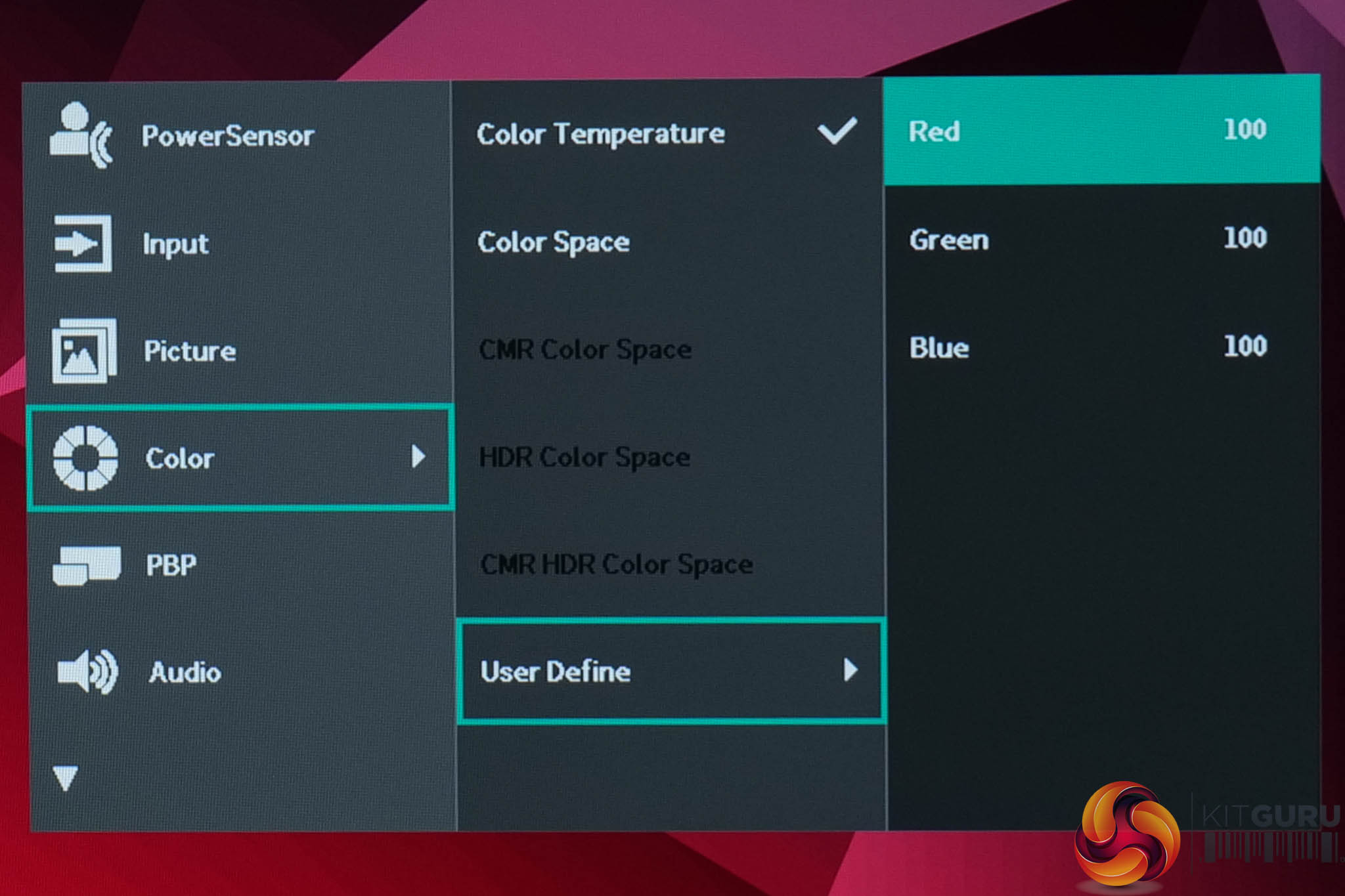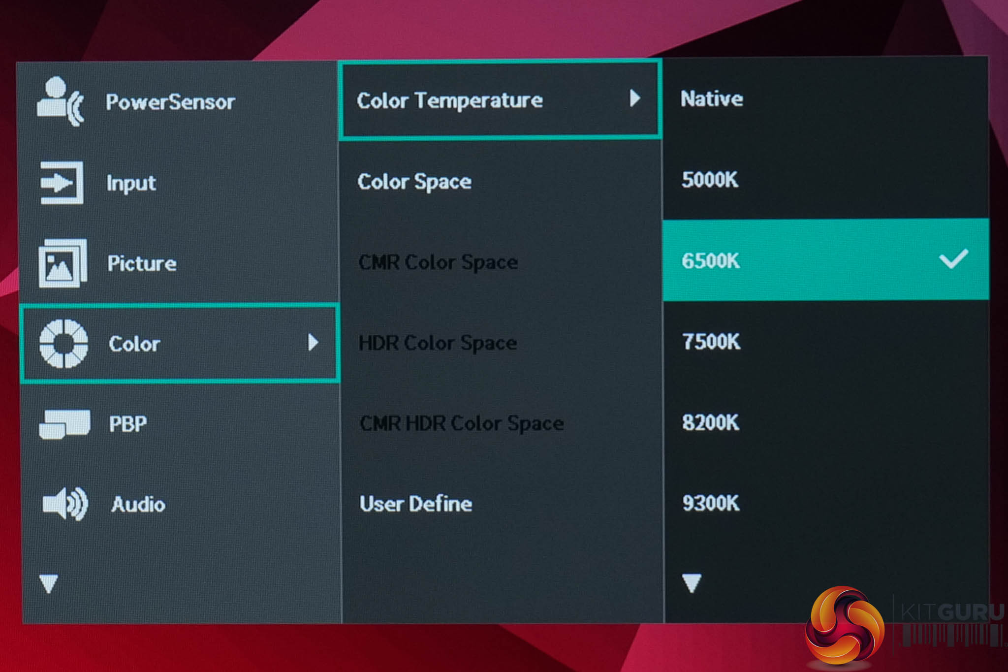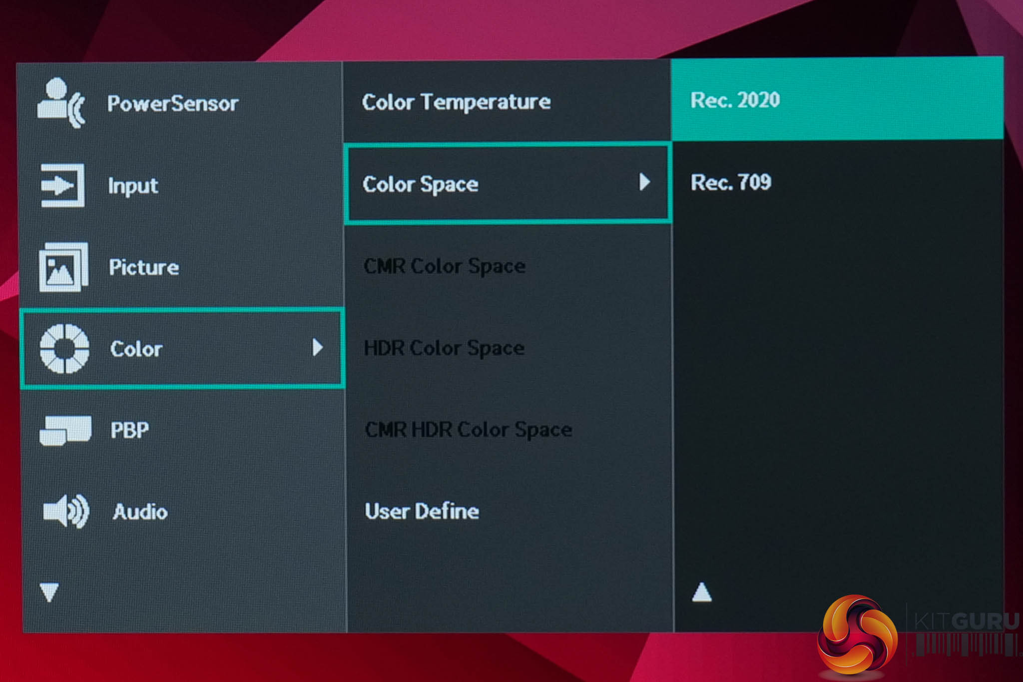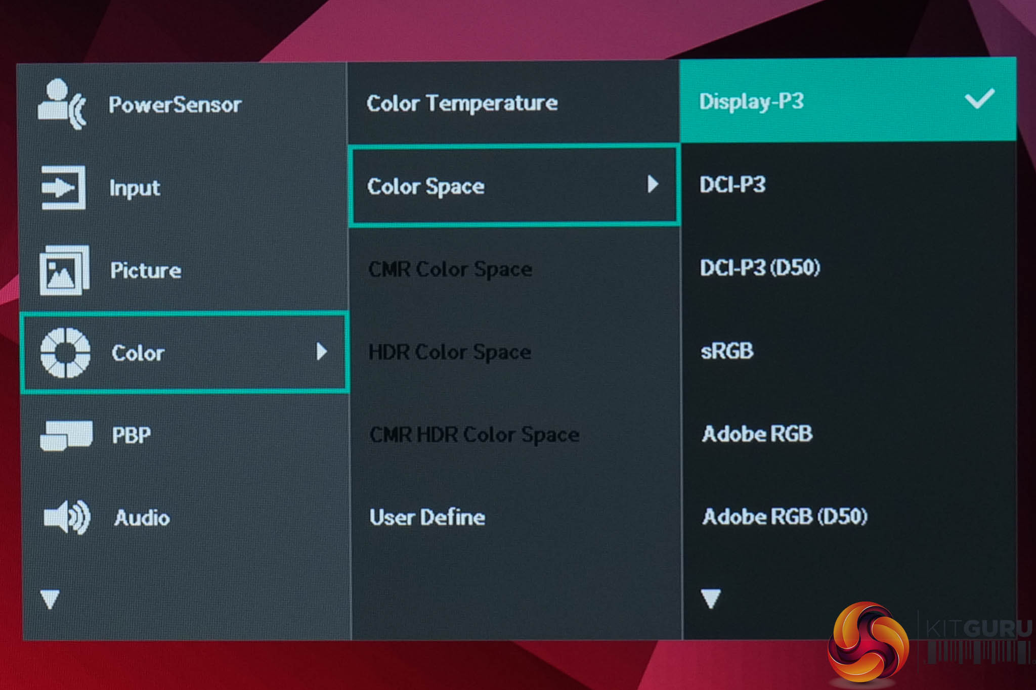 Color houses settings for colour temperature, along with plentiful colour space options – including sRGB, Adobe RGB, DCI-P3 and more. There's also a manual colour balance setting where users can adjust the RGB channels individually.