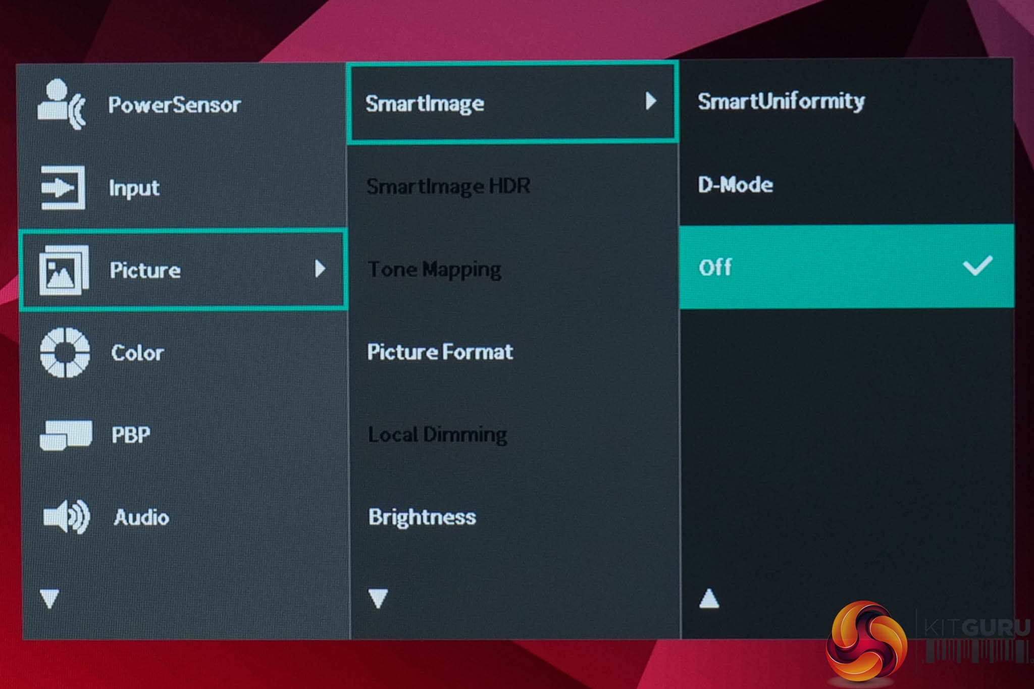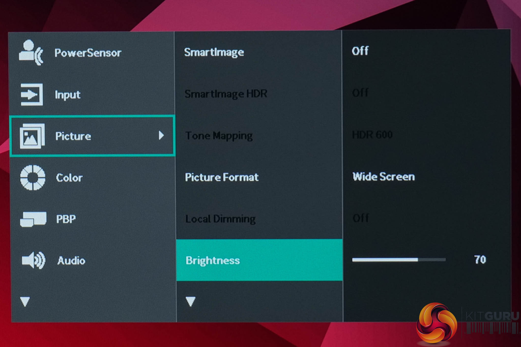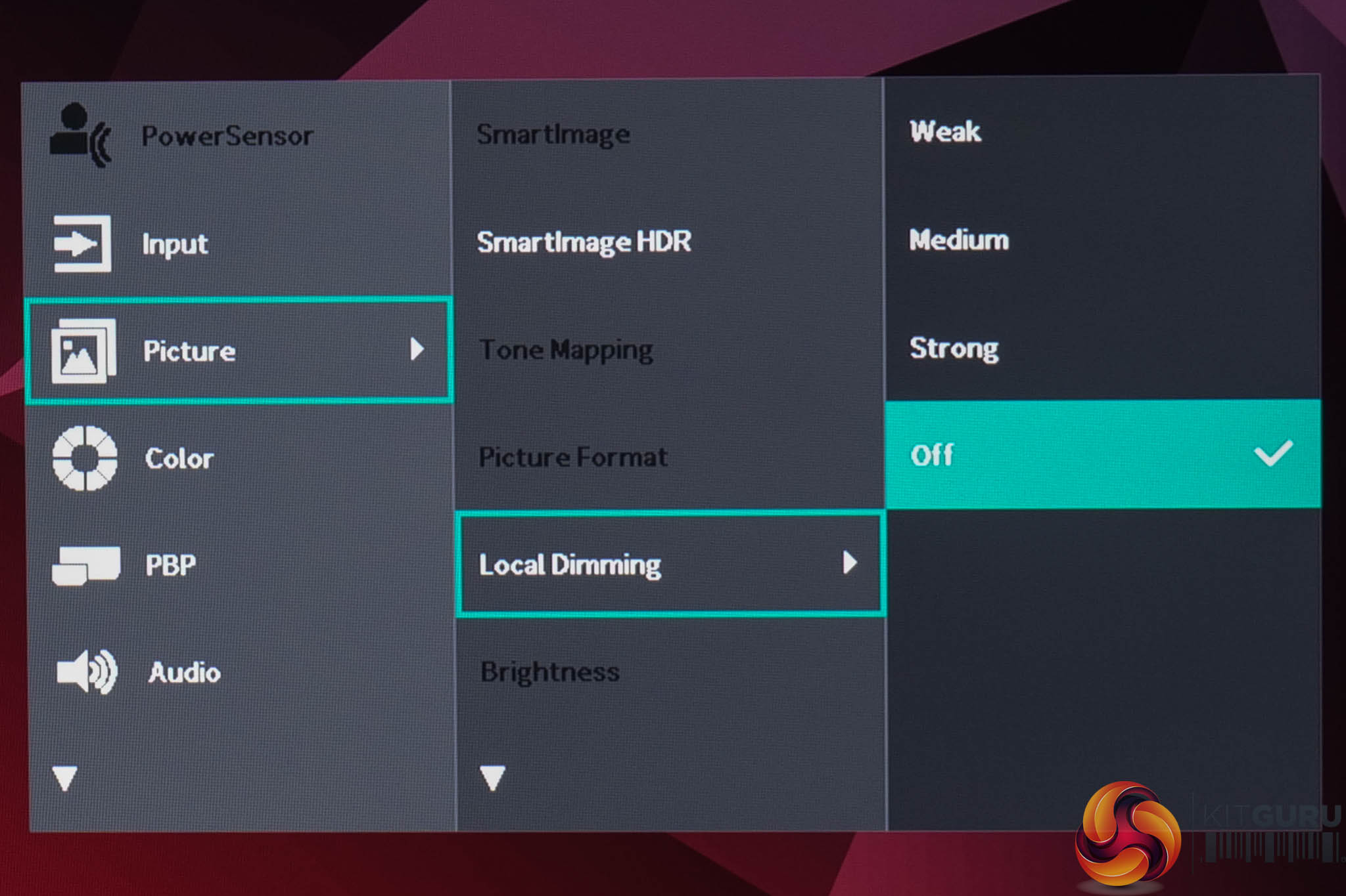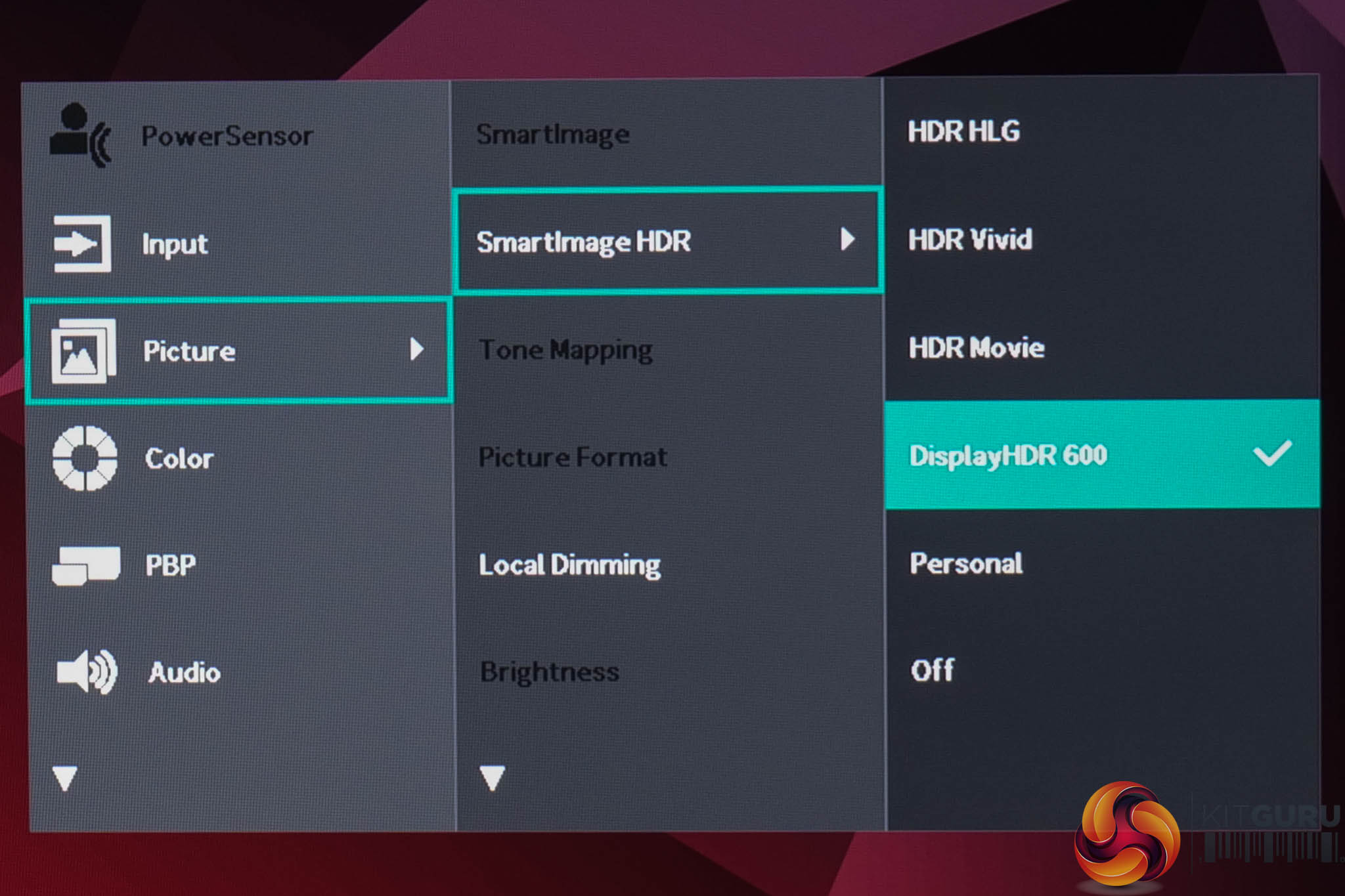 We did also enable HDR and revisit the OSD to give you an idea as to what changes – primarily you get to choose the HDR mode from within the Picture tab, enable or disable Local Dimming, and you can also choose between two options for the HDR colour space.
