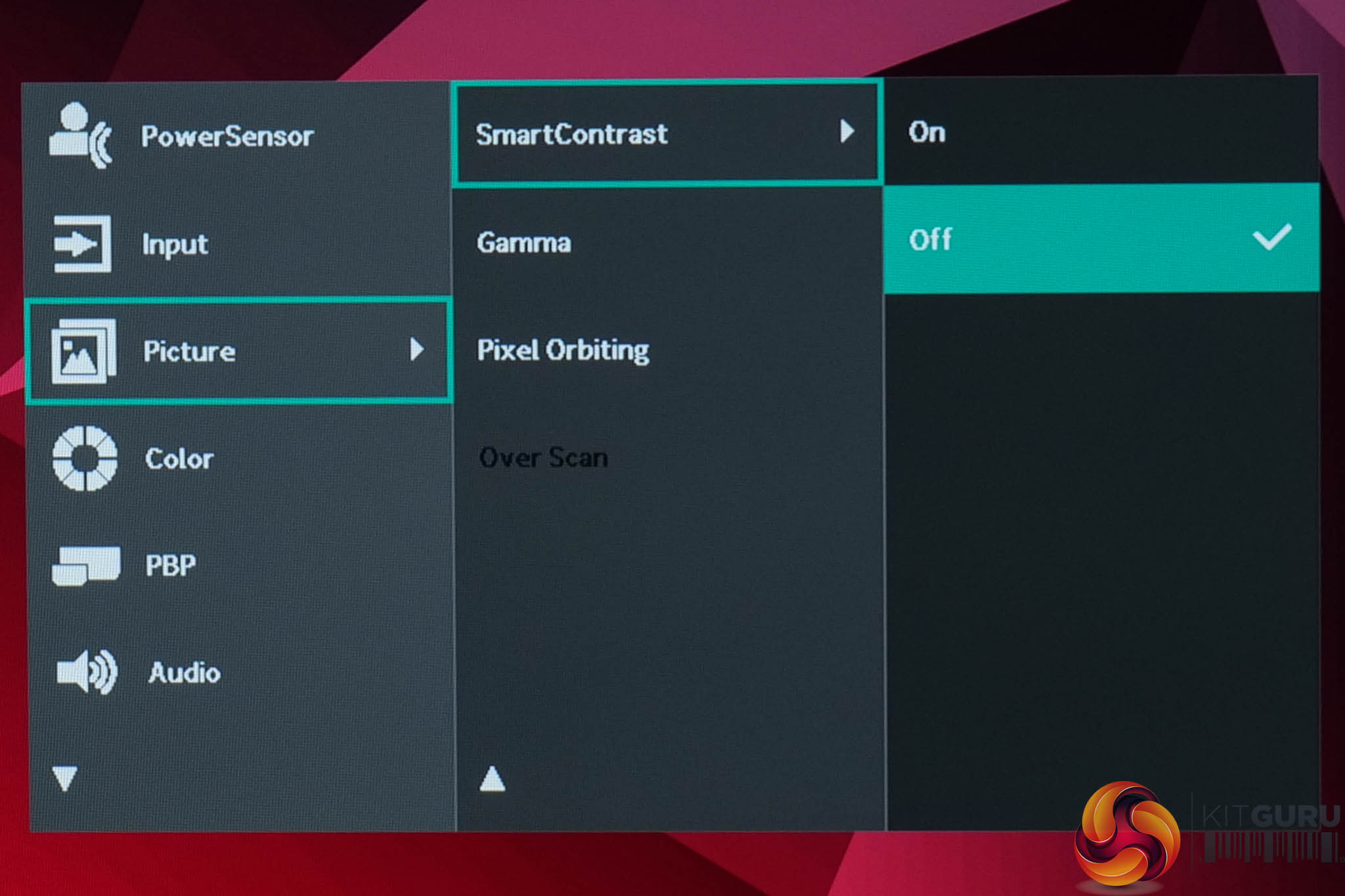 The Picture tab is extensive with a range of different settings. These include your standard brightness and contrast options, aspect ratio control, SmartResponse settings (AKA overdrive), along with gamma and Pixel Orbit functionality.