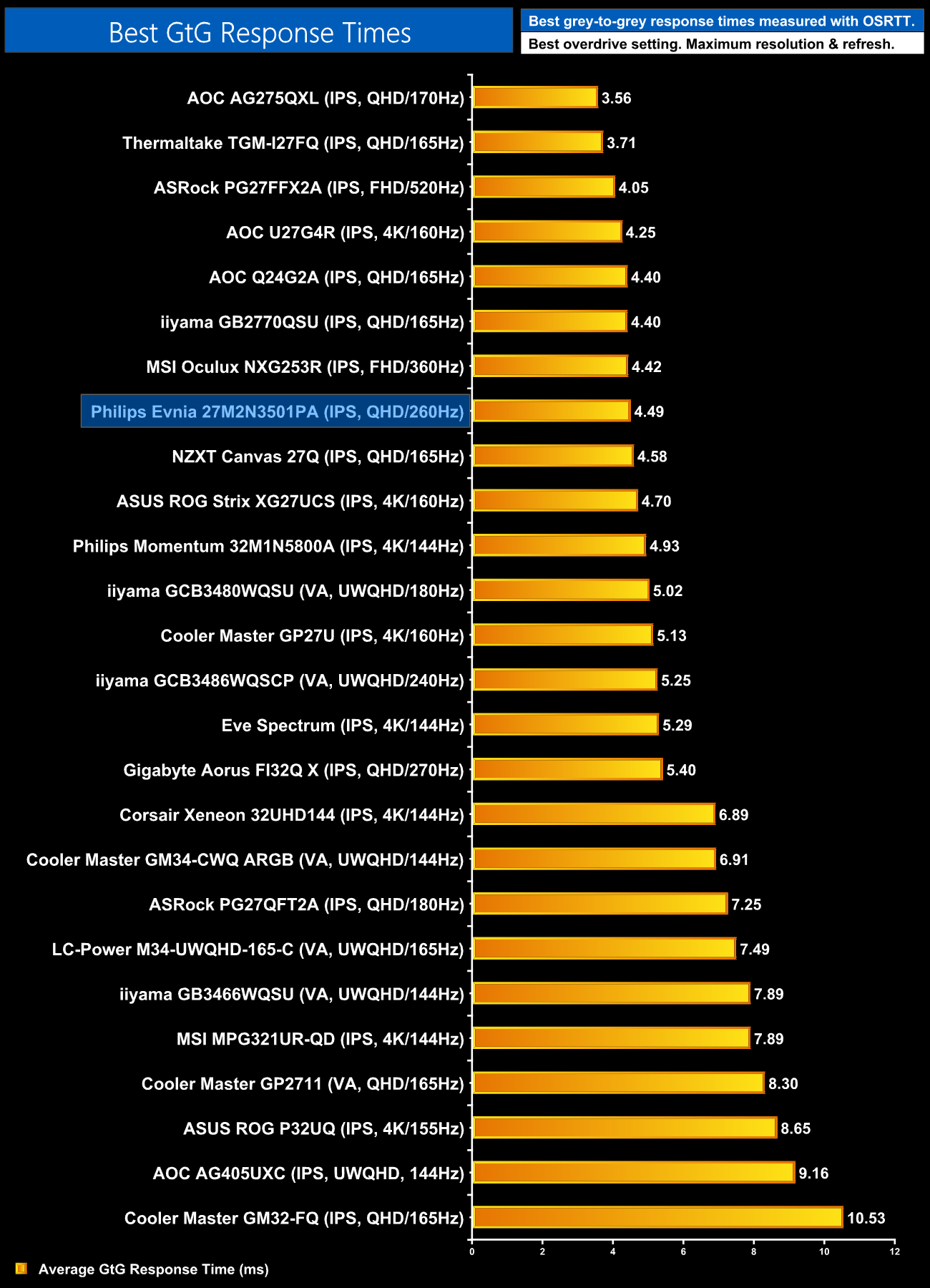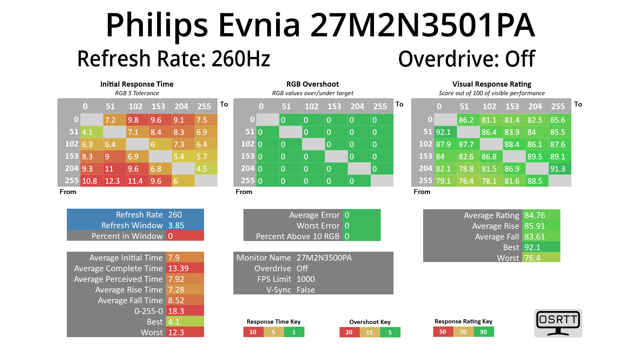 Starting with overdrive turned off at 260Hz, the 27M2N3501PA delivers results that actually aren't terrible – it's not fast by any means, but the average response time of 7.9ms without any overdrive would indicate a reasonable panel.