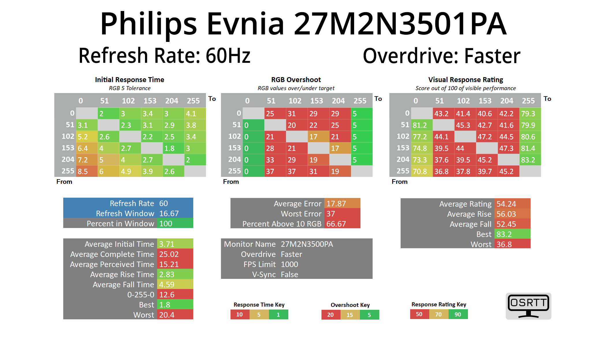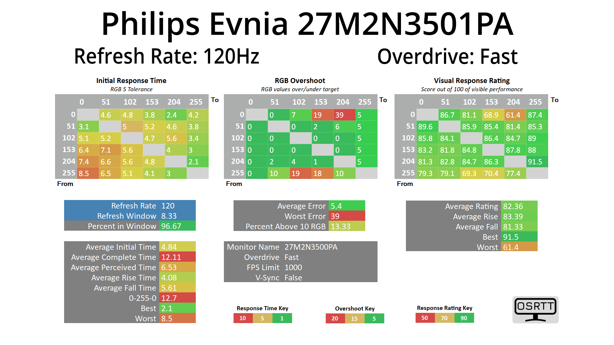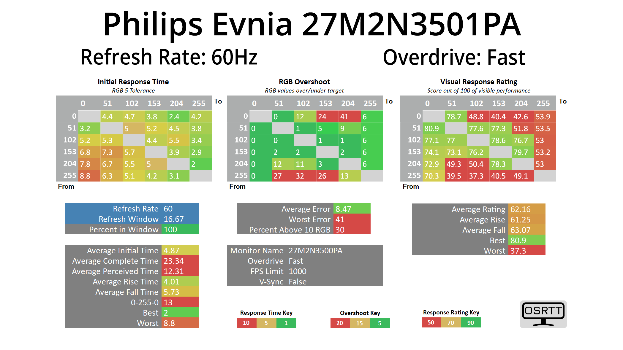 We use the Open Source Response Time Tool (OSRTT), developed by TechTeamGB, for our response time testing. This measures grey-to-grey response times and presents the results in a series of heatmaps, the style of which you may be familiar with from other reviews.
