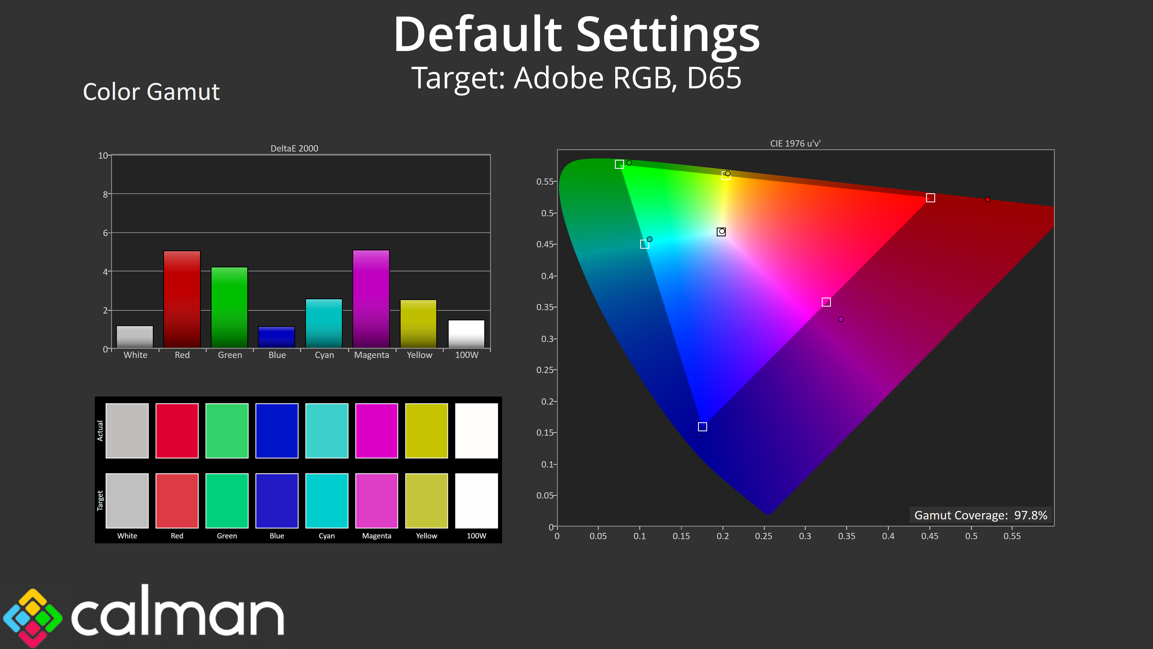 We first run these tests with the display in its out-of-the-box state, with all settings on default. If there is an sRGB emulation option or other useful mode then we may test that too. We then calibrate the screen using the Calman Ultimate software and run the tests again.