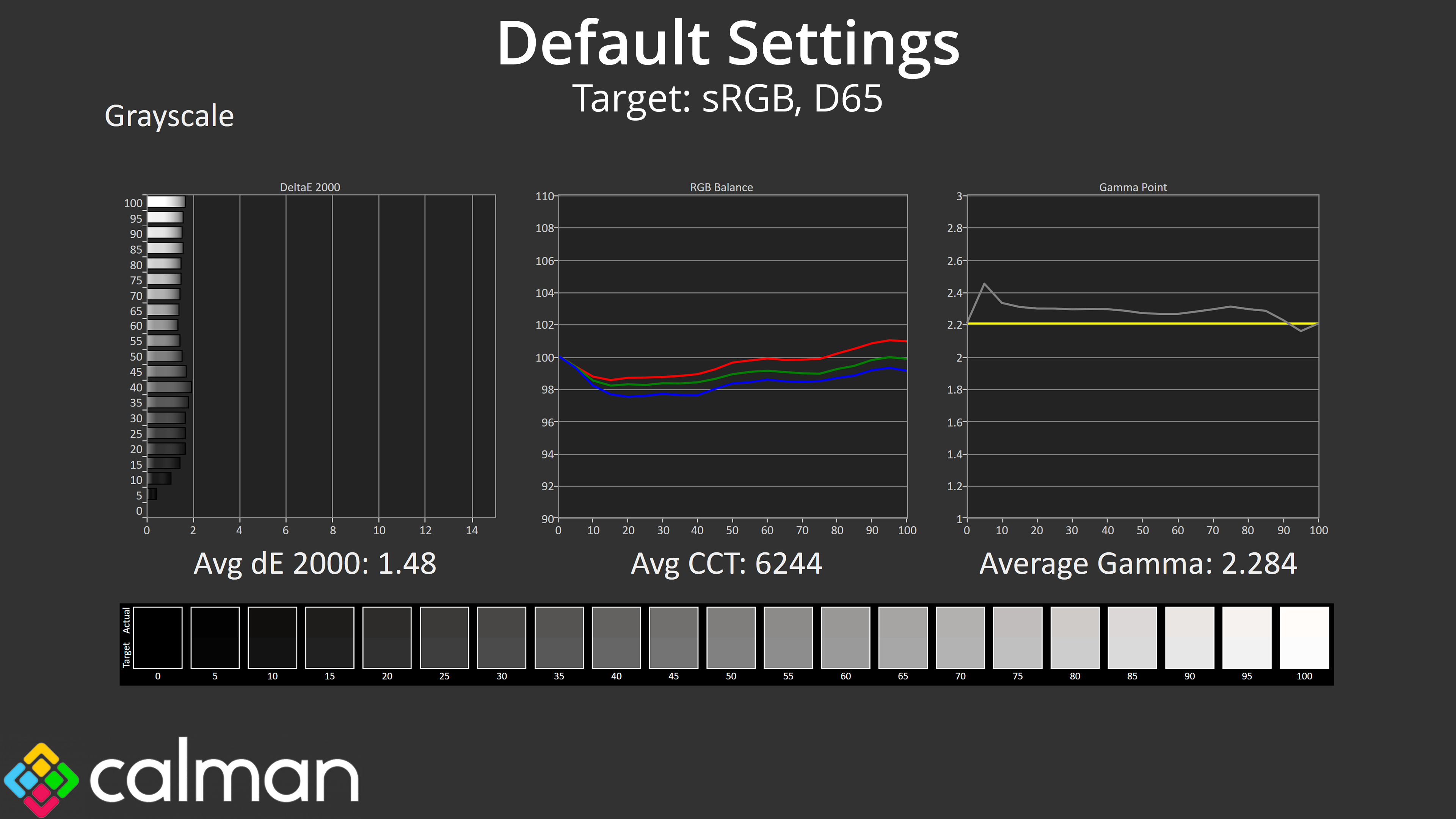 I'm also pleased to say that general factory calibration is solid. The colour balance is oh so slightly warm, averaging 6244K, but that's barely a 4% deviation from the 6500K target, so it's hardly noticeable. Gamma is also solid, a touch high across the range but averages 2.284 without any significant peaks or dips. Overall, the greyscale deltaE 2000 averages 1.48, indicating very good accuracy indeed.