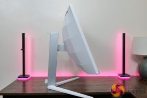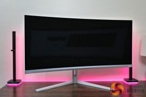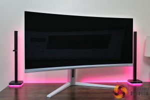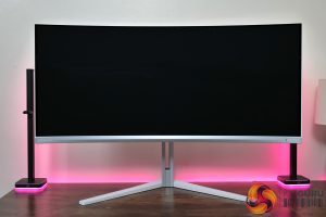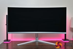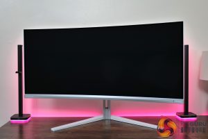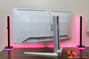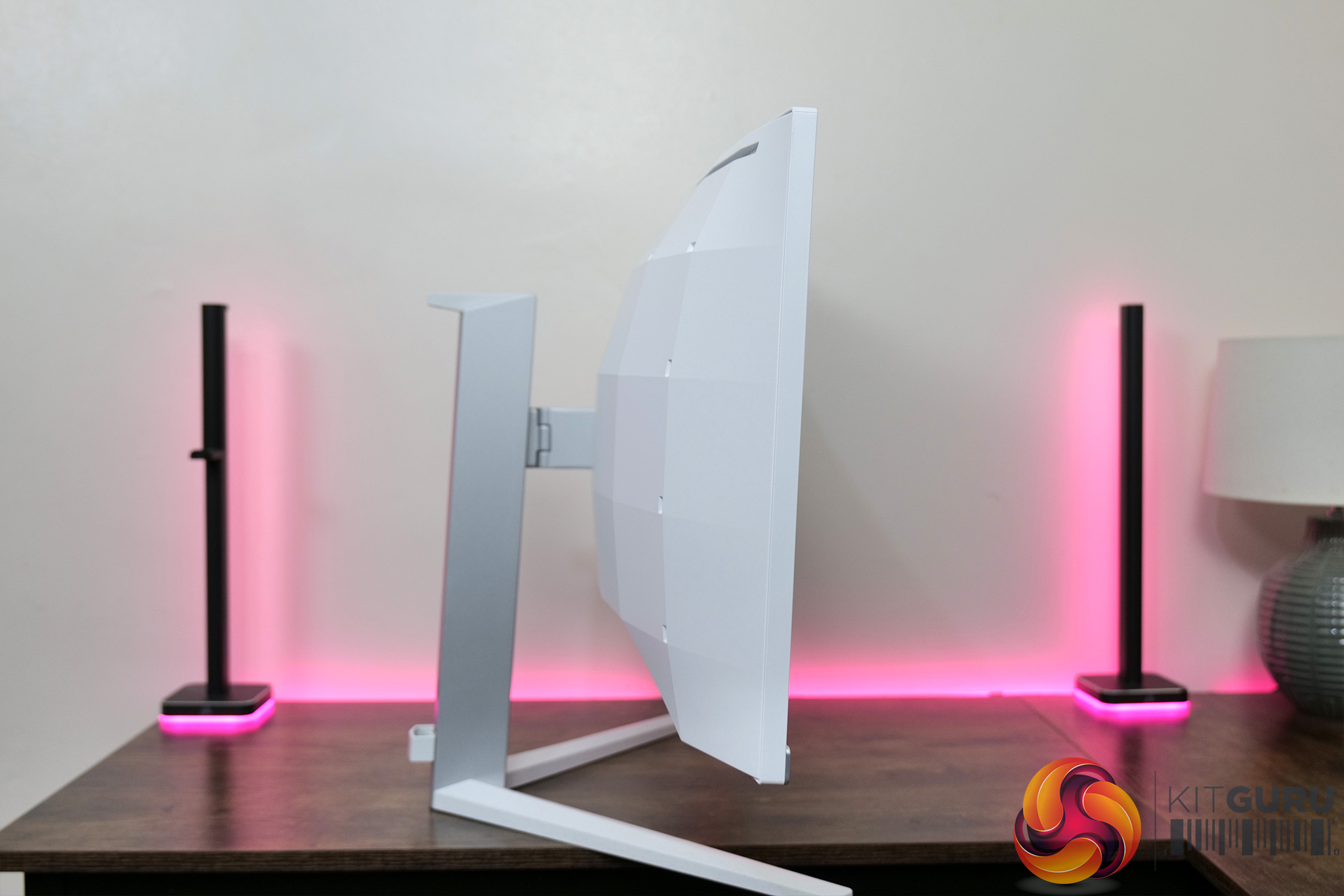Whatever your thoughts on the aesthetic, the included stand has a good variety of ergonomic adjustments. This includes 150mm of height adjustment, 20 degrees of swivel both left and right, as well as tilt from -5 to +20 degrees. There's no pivot/rotation function here, but considering this is a curved ultrawide, it's not a real loss in my opinion. VESA 100×100 mounts are also supported for those who want to use a third party stand or arm.