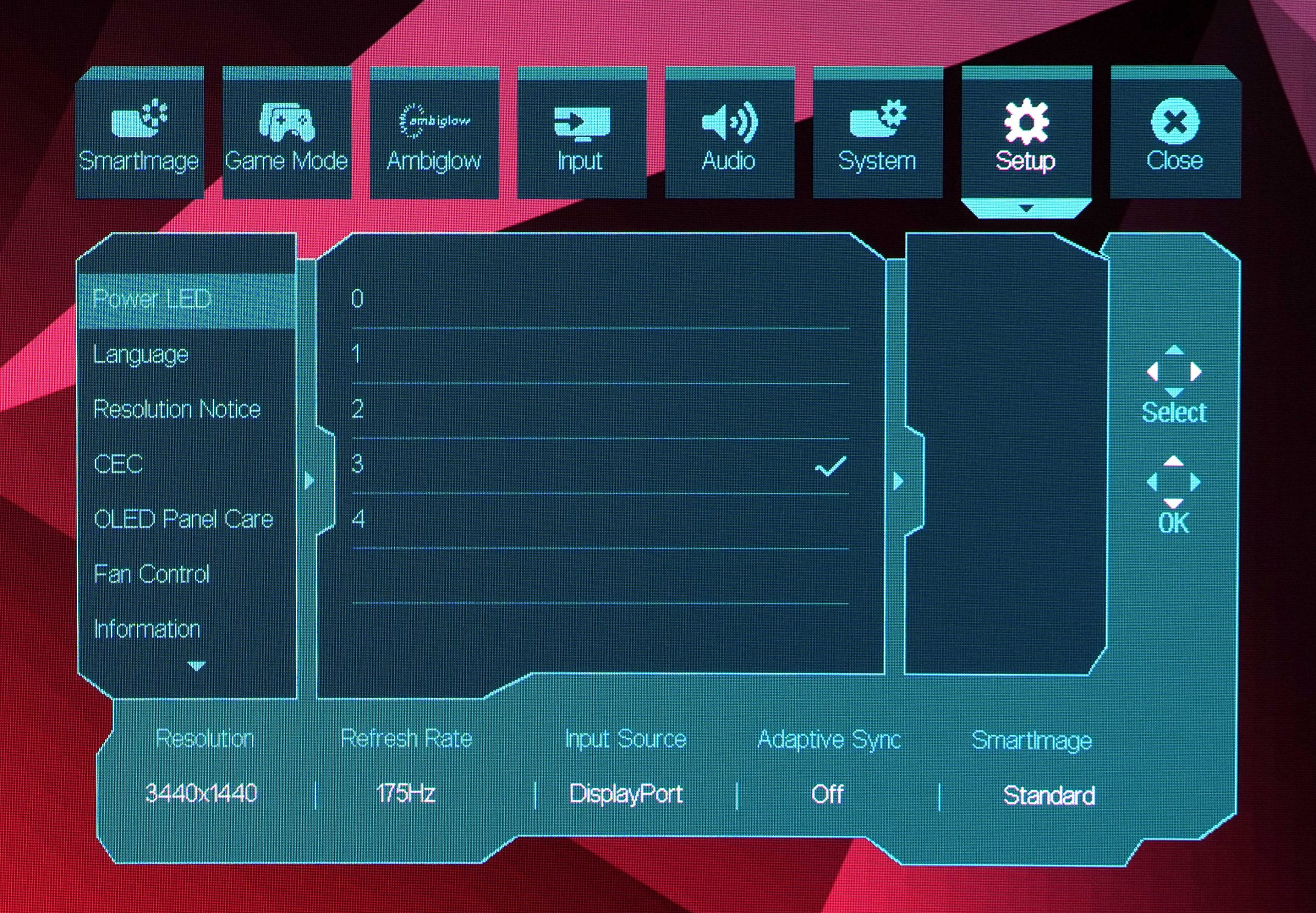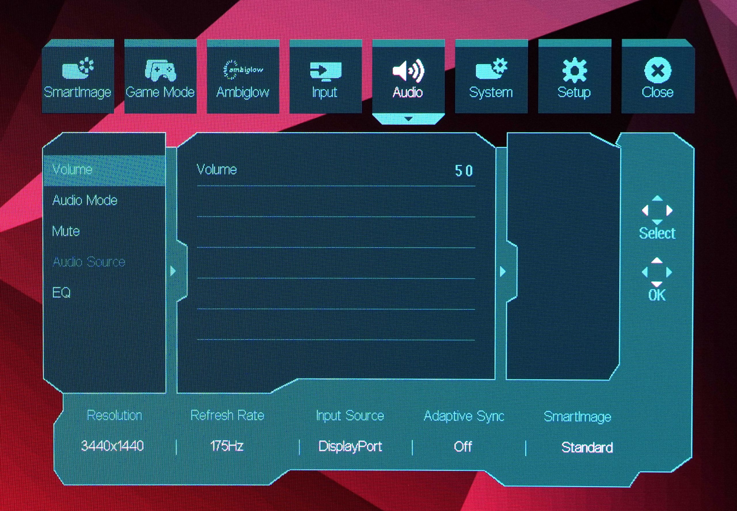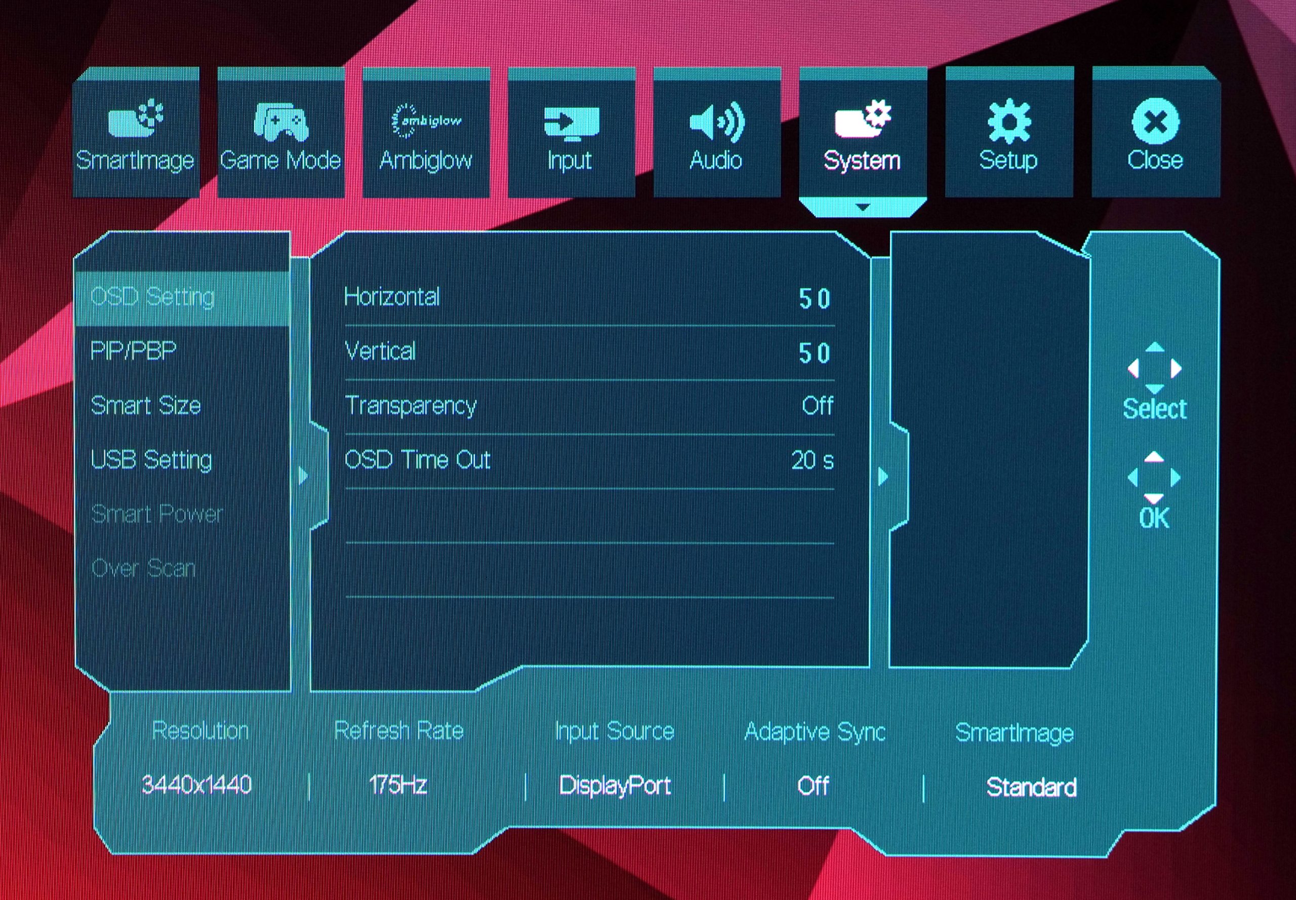 To be honest, the OSD used by Evnia here is pretty ugly and doesn't match the clean and modern aesthetic that exudes from the design of the monitor itself. It works well enough and things are mostly easy to navigate with the OSD. That said, it does confuse me slightly that instead of clicking the joystick to ‘accept' or enter a particular setting, you have to push the joystick to the right – it's not the end of the world but it takes some getting used to.