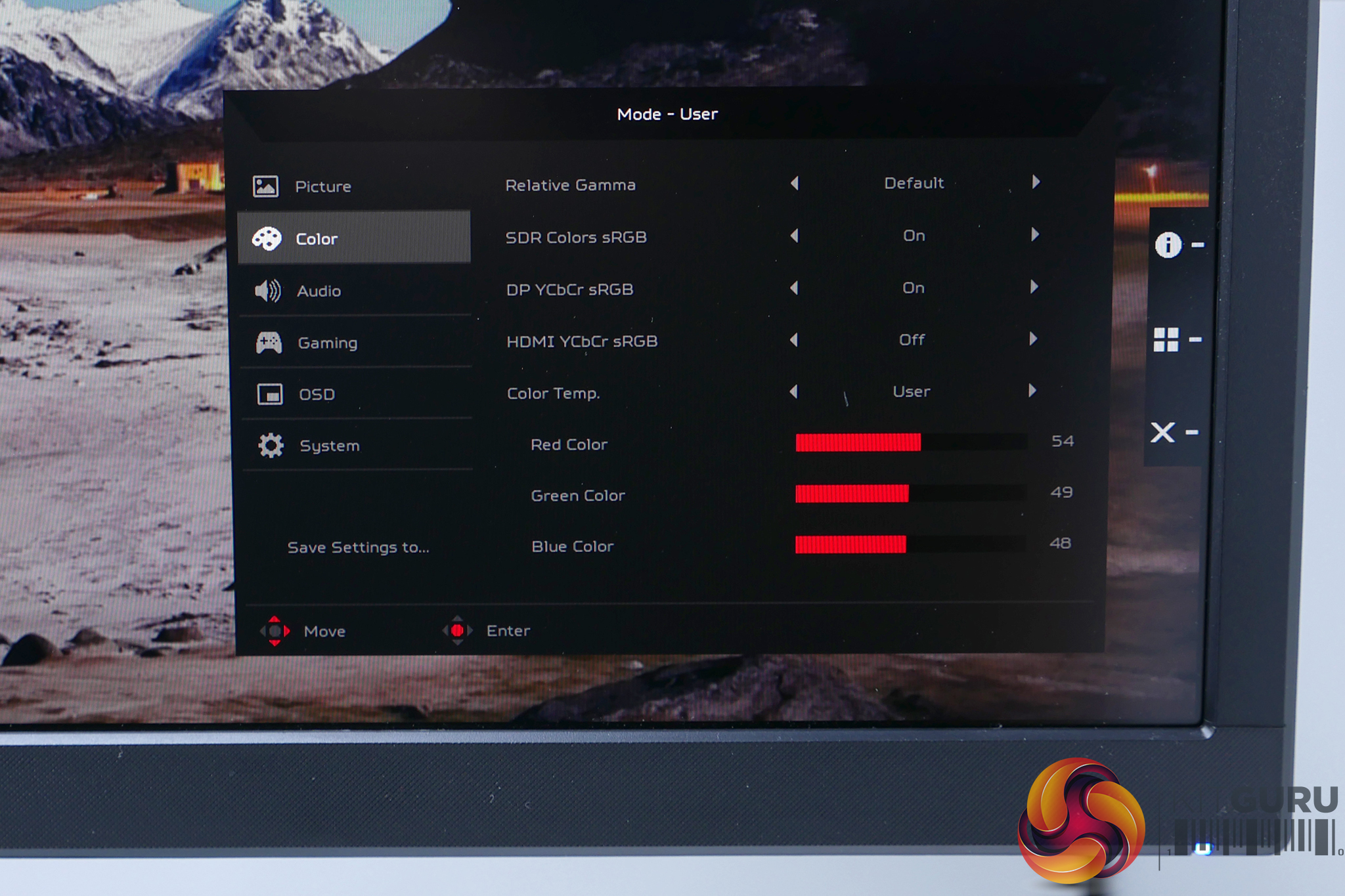 Move into the Color menu and as well as core settings such as gamma and colour balance there’s one crucial setting you’ll want to experiment with, which is SDR Colors sRGB. This controls whether the display uses its extended colour gamut when it’s only being fed standard sRGB colours.
