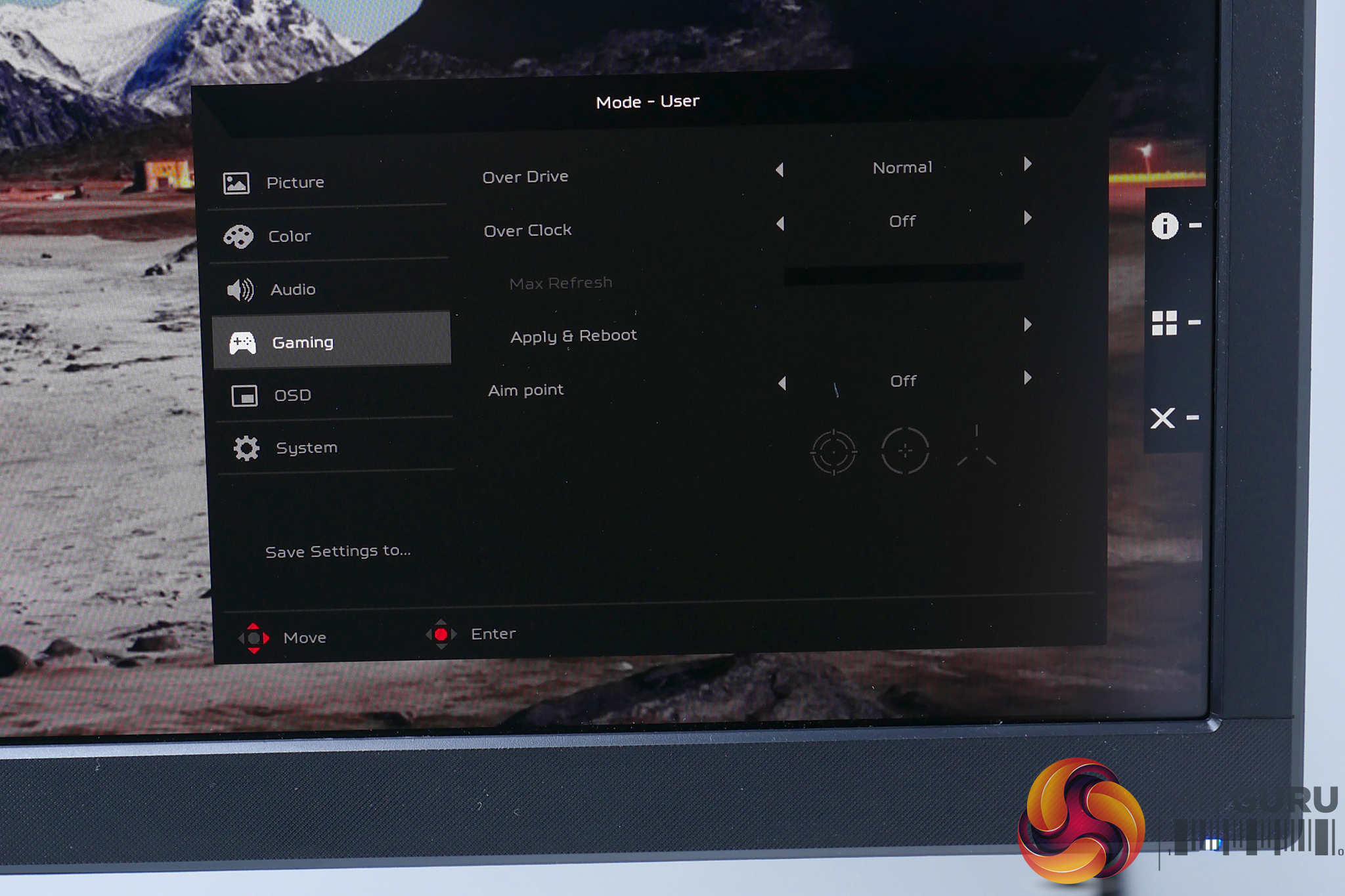 Press any of the buttons – other than the power button that sits at the top of the row – and it’ll bring up a quick menu that lets you jump into one of four sub menus. Tap in the joystick and you’ll enter the main menu or hit the top button and it’ll bring up a screen modes menu. The next button down takes you straight to brightness adjustment while the third button is for the input menu. You can also change the assignment of these hotkeys.