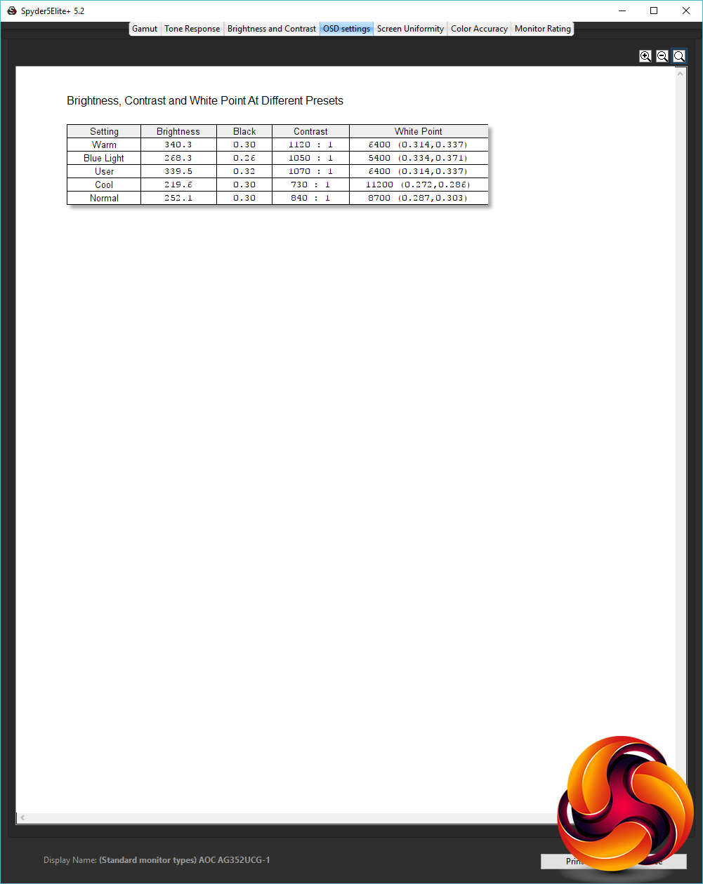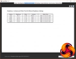 Next up is the brightness and contrast test. It’s here where the Spyder5 doesn’t correctly report the contrast but otherwise we can see that the maximum brightness is plentiful and the brightness scales nicely as you reduce the monitor’s brightness setting – some monitors handle this poorly with brightness dropping too fast or too slow, making it difficult to pick out your preferred level.
