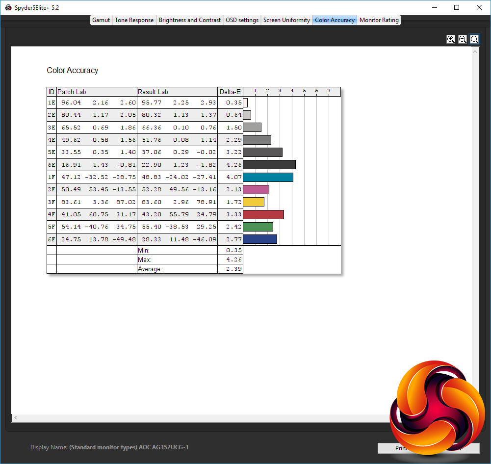 Starting with the iDisplayPro, Acer’s claims about the Z35P’s contrast are proven to be true, with a reported figure of 2020:1. This test also puts the default colour temperature at a reasonable 6295K (the ideal is 6500K), while sRGB colour space coverage is 98.9% and gamma is a near perfect 2.19. Those are largely very impressive figures that show this screen is more than capable of producing accurate looking colours.