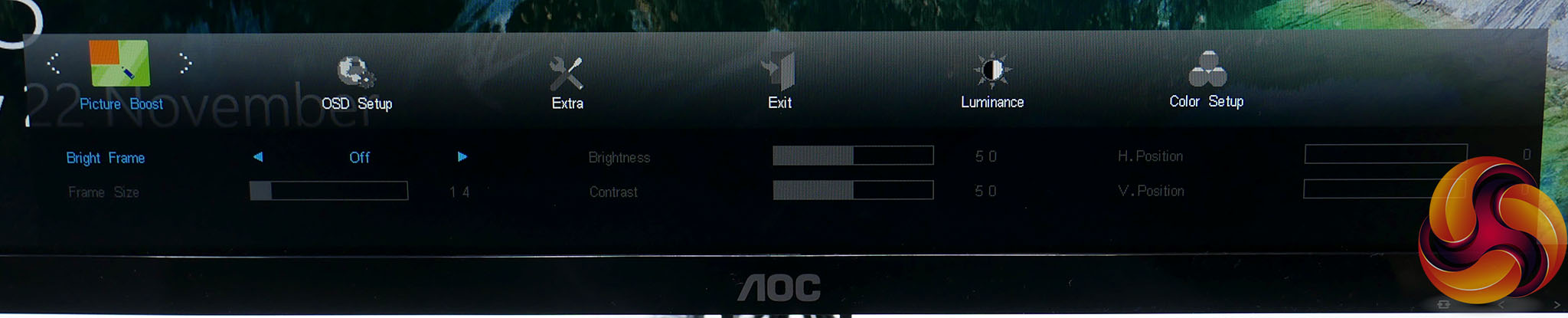 In the Picture Boost menu is just one option: Bright Frame. This is a strange AOC-unique addition to some of its monitors and it allows you to specify a rectangle of the screen to have a different brightness and contrast setting to the rest of the screen. You can change the size and position of the rectangle, though we still aren't use what you would want to use it for.